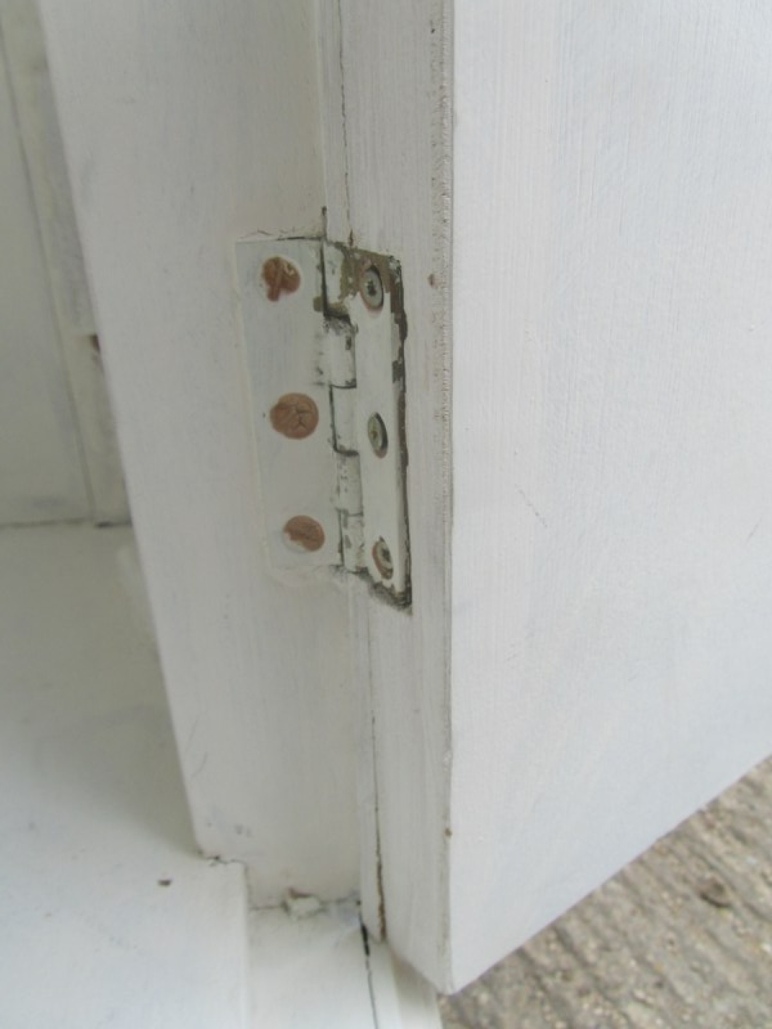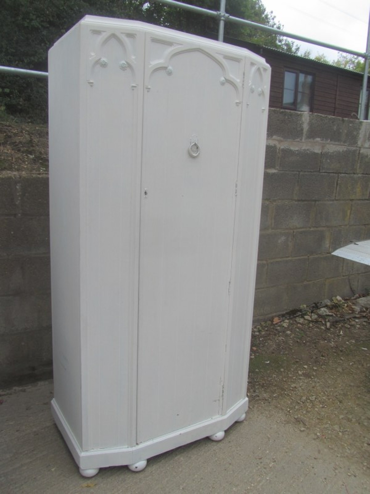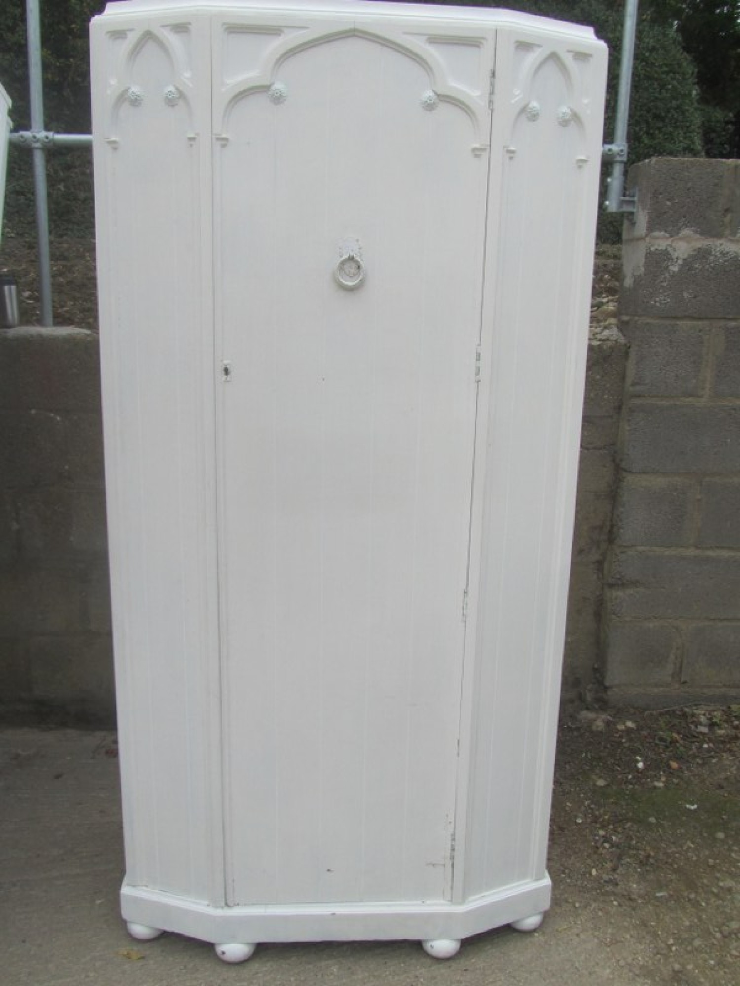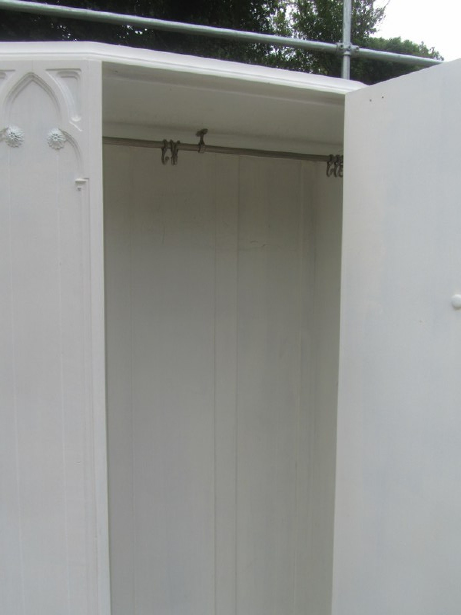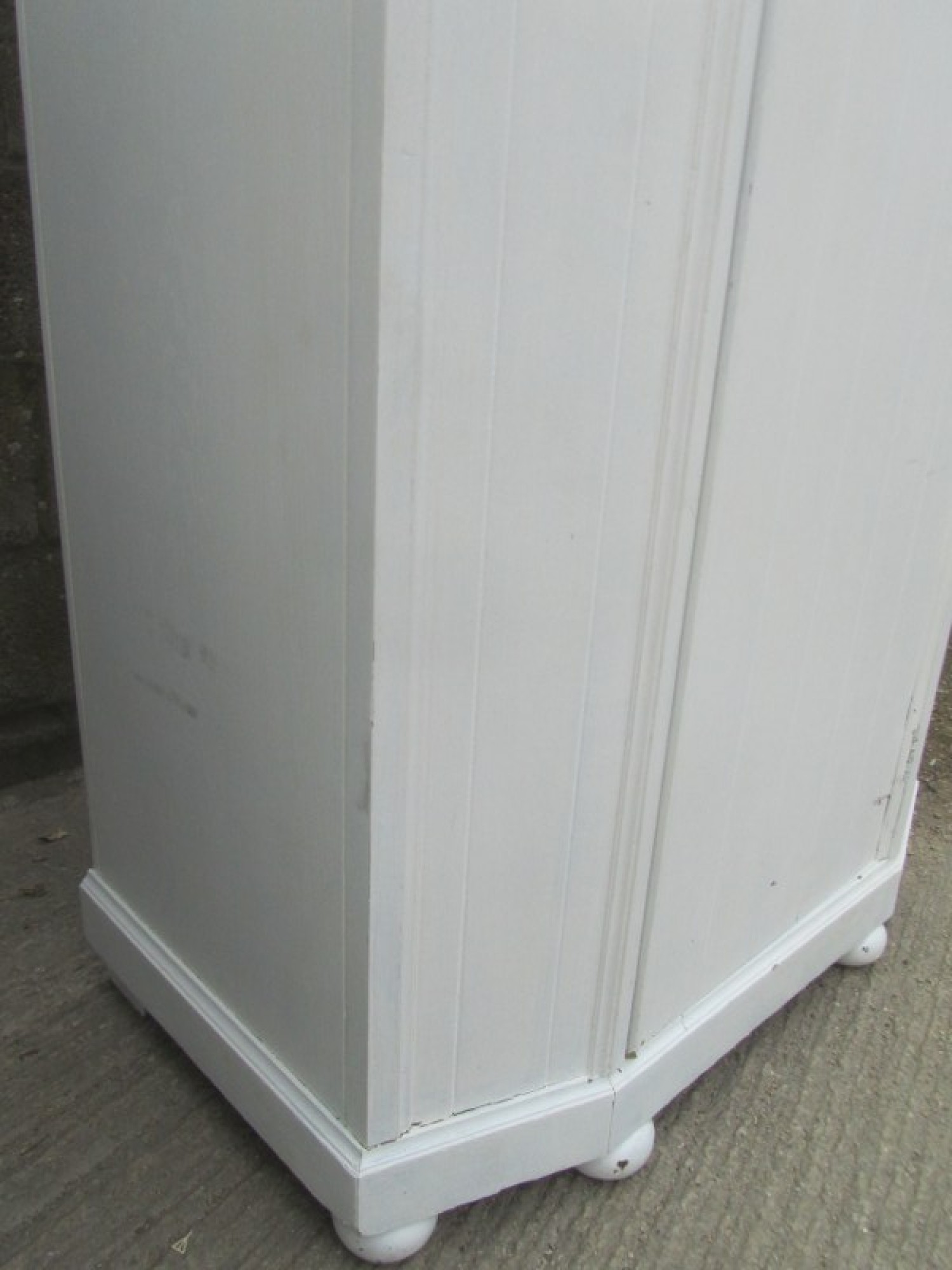 THIS IS A WARDROBE FROM THE 1950s, IT HAS BEEN PAINTED WHITE A LONG TIME AGO. IT IS OAK VENEERED UNDER THE PAINT. INSIDE THERE IS A HANGING RAIL. WEAR AND TEAR. SLIGHT DAMAGE AROUND THE BOTTOM HINGE.