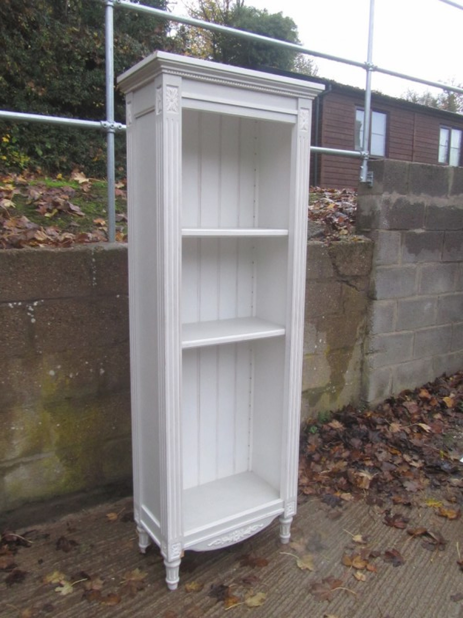 THIS IS A STURDY BOOKCASE WITH 2 SHELVES, A COUPLE ARE MISSING. IT IS PAINTED. NEEDS FITTING TO A WALL. DAMAGE TO THE BOTTOM LEFT.