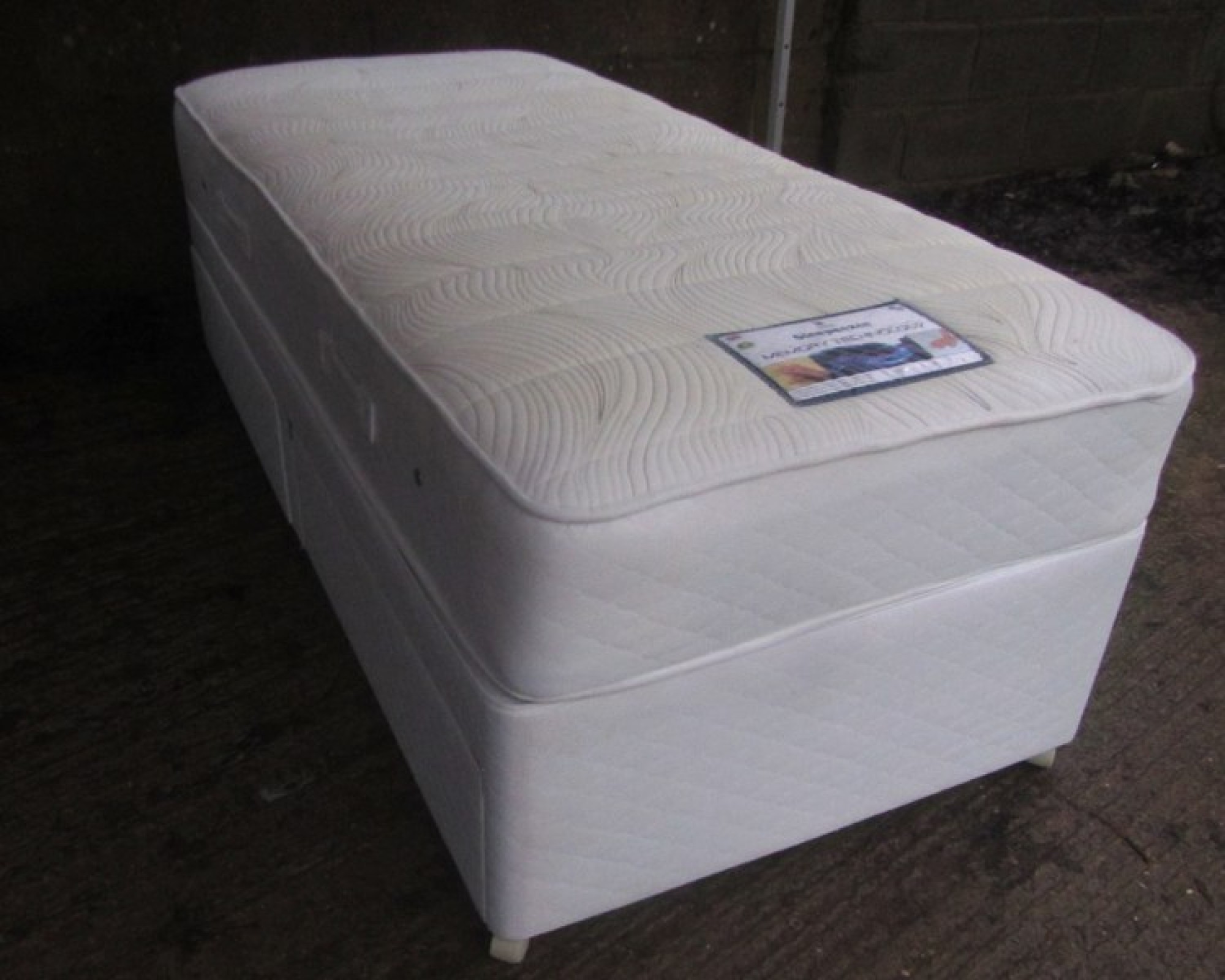 A 3' SINGLE BED. THERE ARE DRAWERS IN THE SIDE OF THE DIVAN, IDEAL FOR STORING SHOES, CLOTHES etc. THE BASE AND MATTRESS ARE CLEAN AND IN GOOD CONDITION. SMALL LIGHT MARK ON THE MATTRESS