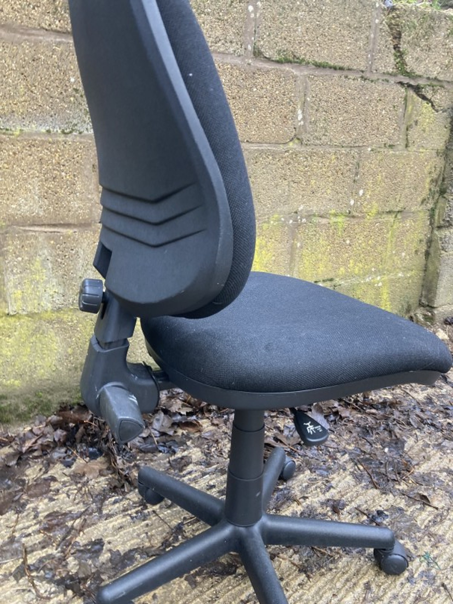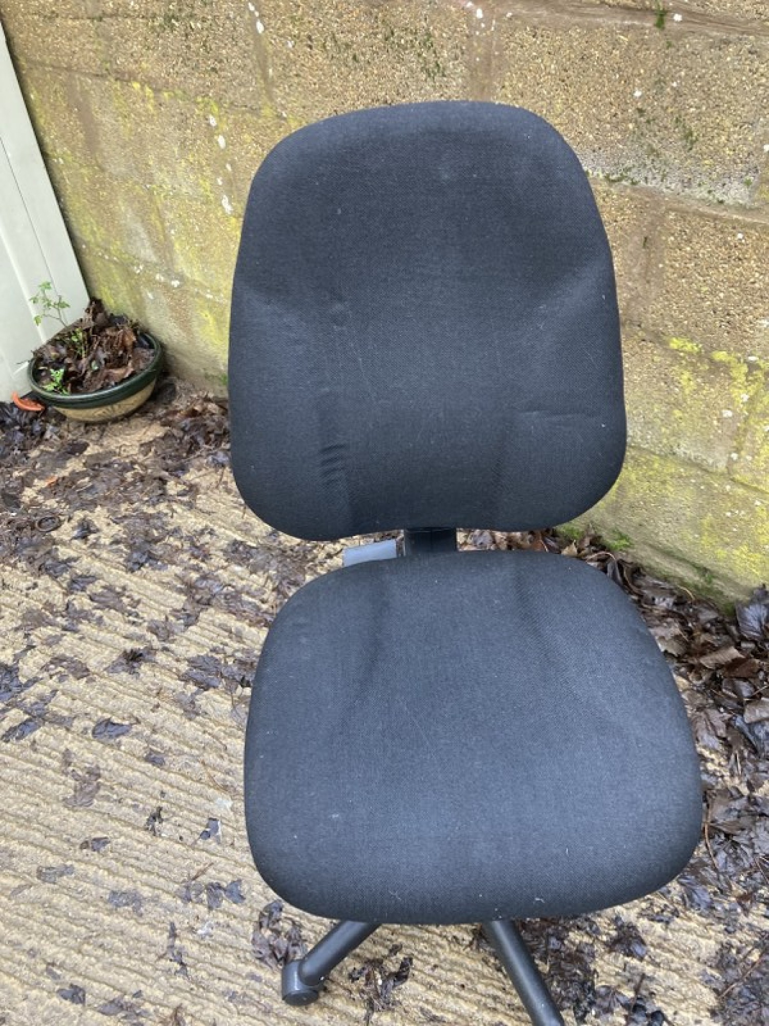 AN OFFICE SWIVEL CHAIR, IT STANDS ON 5 CASTORS. IT IS UPHOLSTERED IN MATERIAL, THERE IS A GAS LIFT ADJUSTMENT. SEAT HEIGHT IS 45cm - 55cm. GOOD QUALITY OFFICE CHAIR.