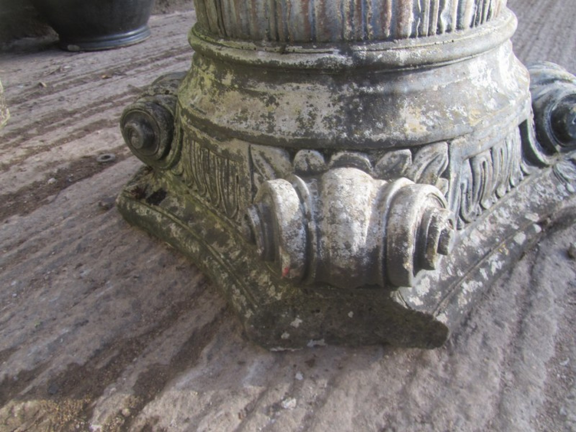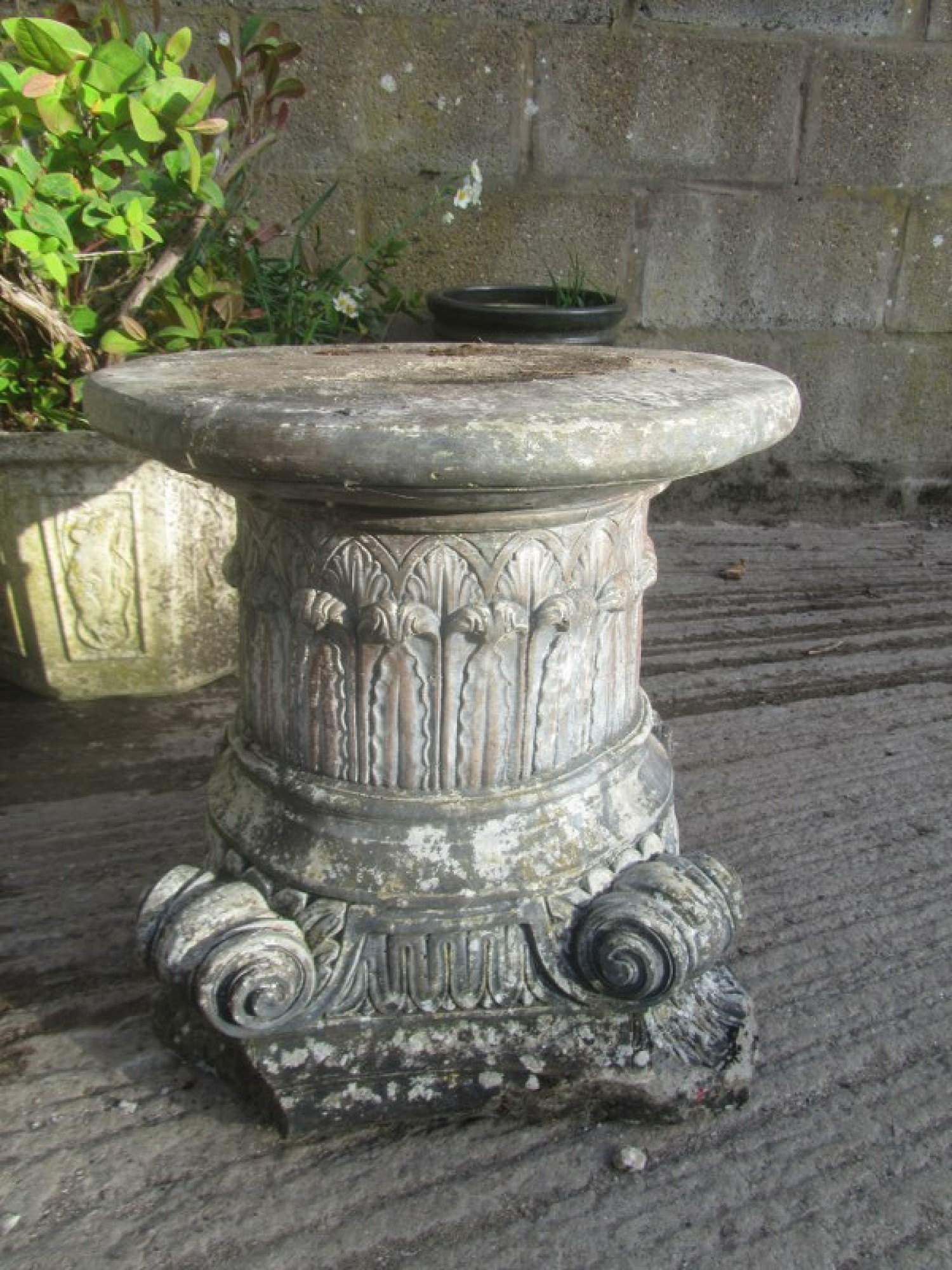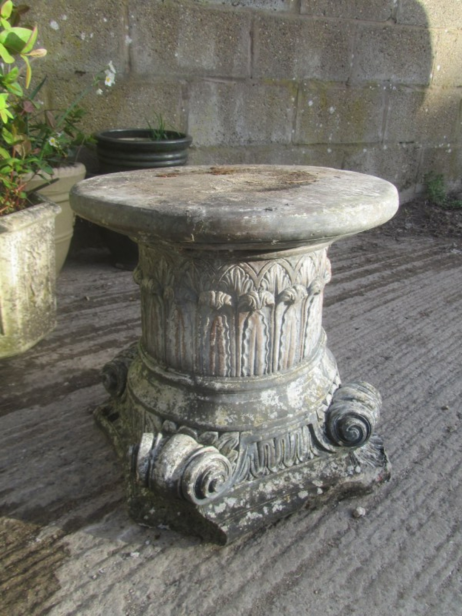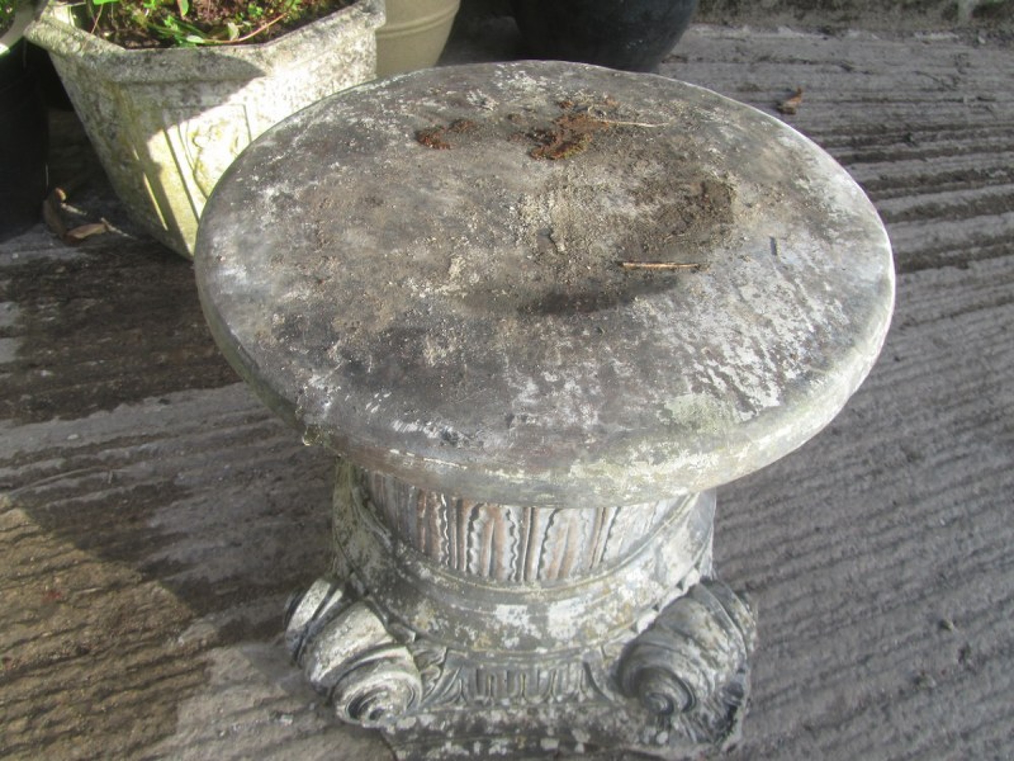 A CAST STONE BASE. IT HAS BEEN OUTSIDE FOR YEARS, IT HAS A WEATHERED LOOK. CHIPPED ON ONE CORNER.
