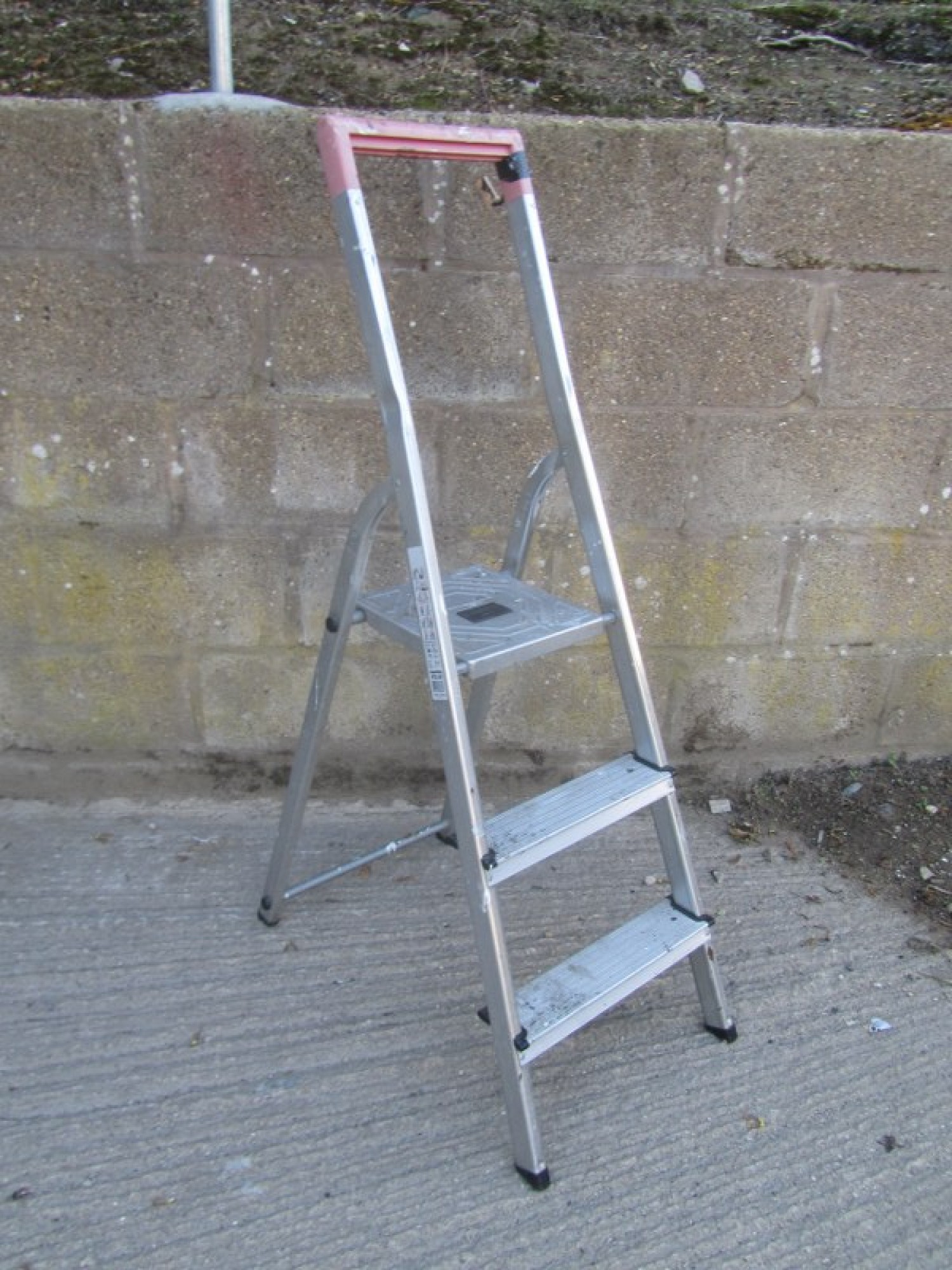 A SMALL SET OF STEP LADDERS. THEY ARE STURDY, MADE FROM ALUMINIUM. LIGHTWEIGHT, THEY FOLD FLAT FOR STORAGE. PAINT SPLASHES.