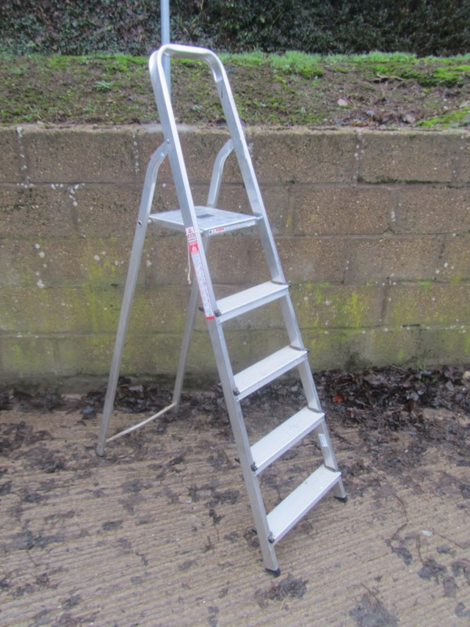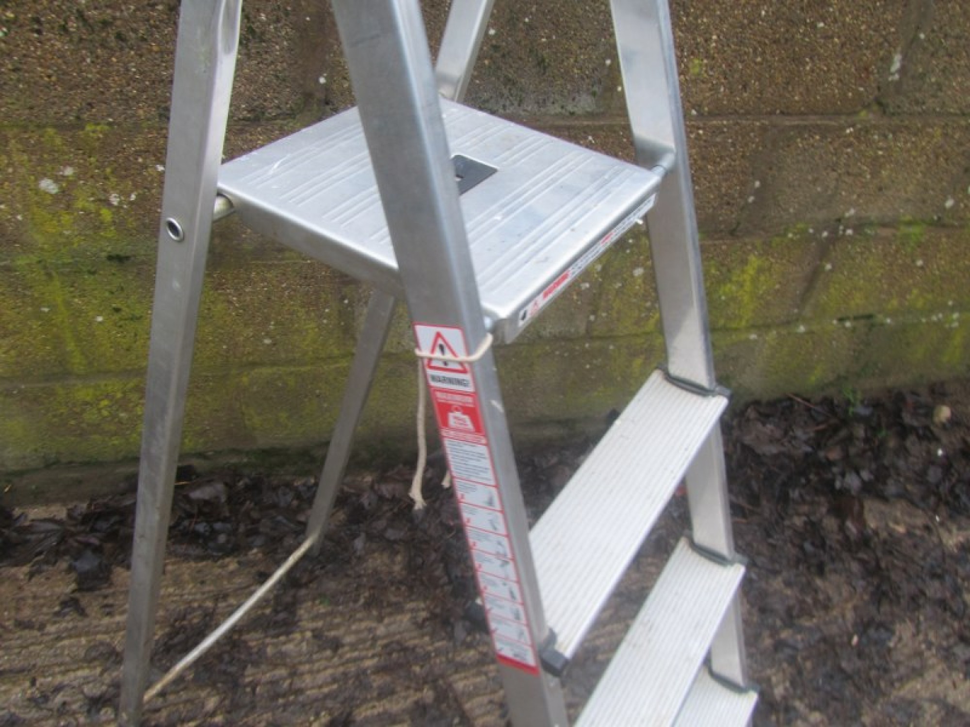 A TALL SET OF STEP LADDERS. THEY ARE STURDY, MADE FROM ALUMINIUM. LIGHTWEIGHT, THEY FOLD FLAT FOR STORAGE. PAINT SPLASHES.