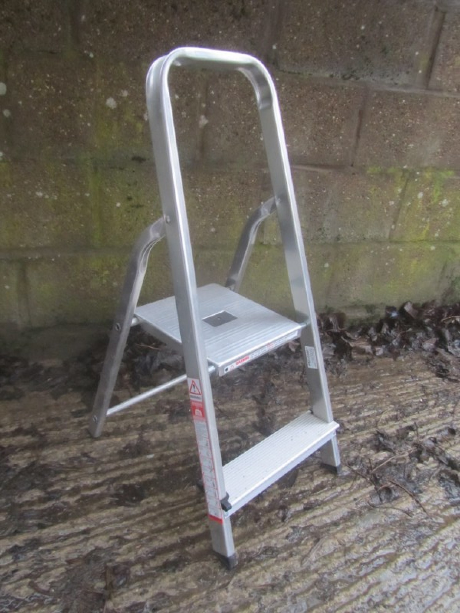 A SMALL SET OF STEP LADDERS. THEY ARE STURDY, MADE FROM ALUMINIUM. LIGHTWEIGHT, THEY FOLD FLAT FOR STORAGE.