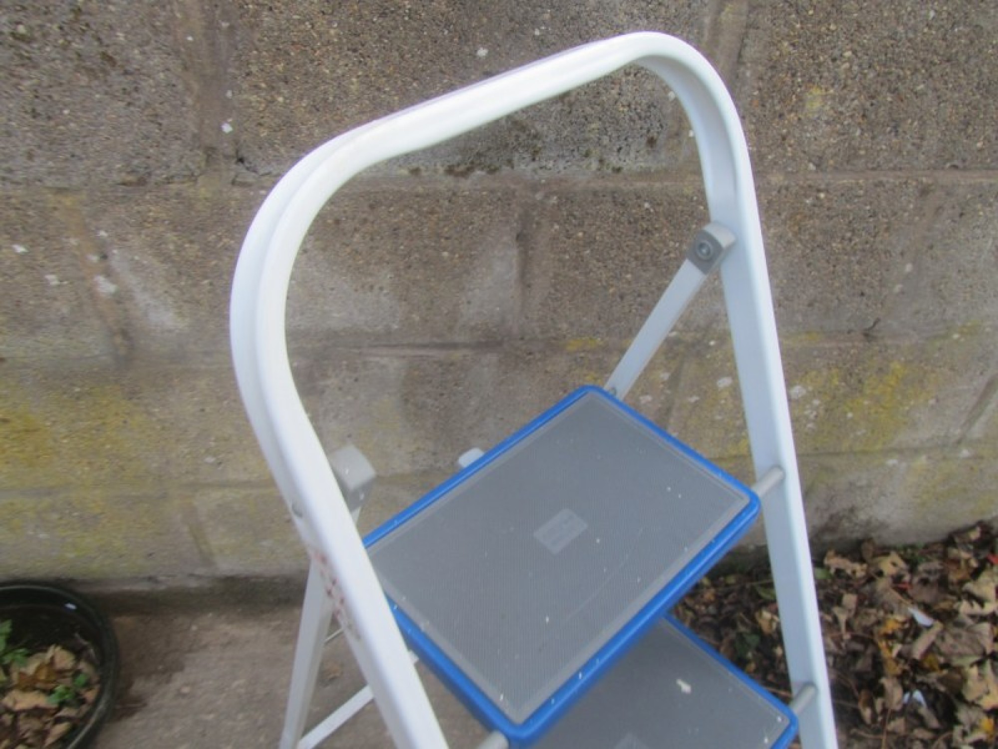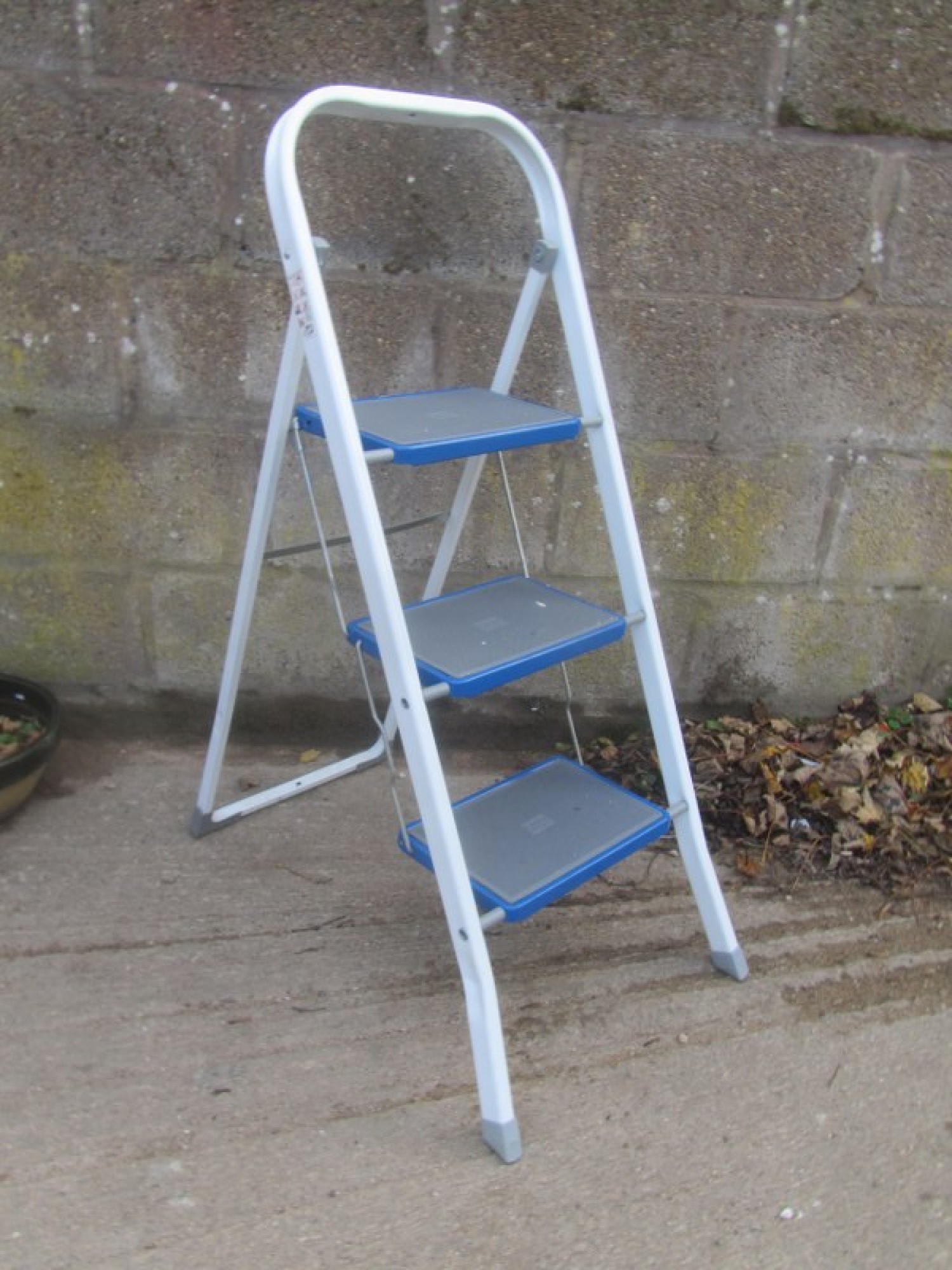 A SMALL SET OF STEP LADDERS. THEY ARE STURDY, MADE FROM METAL THEY FOLD FLAT FOR STORAGE.
