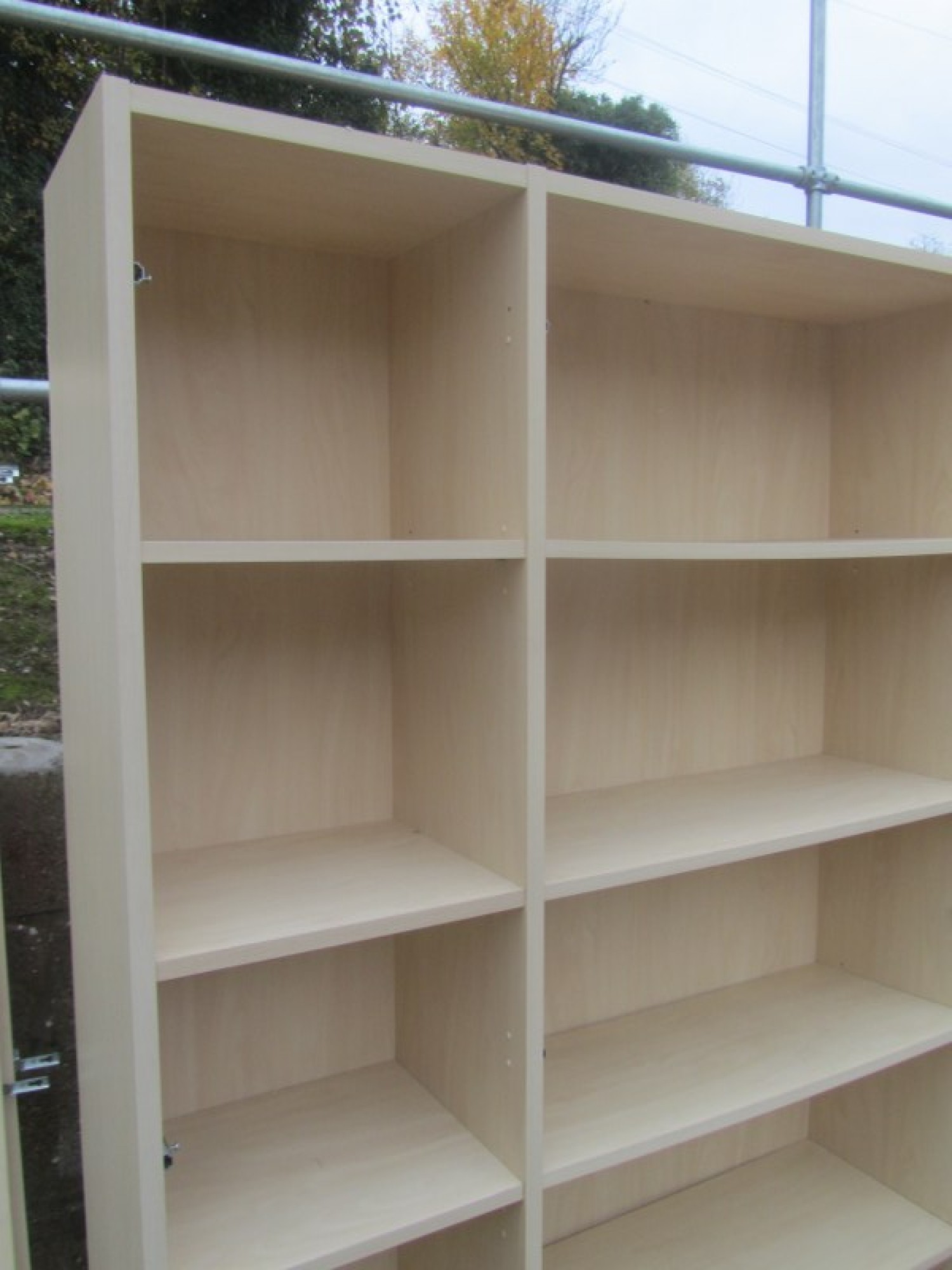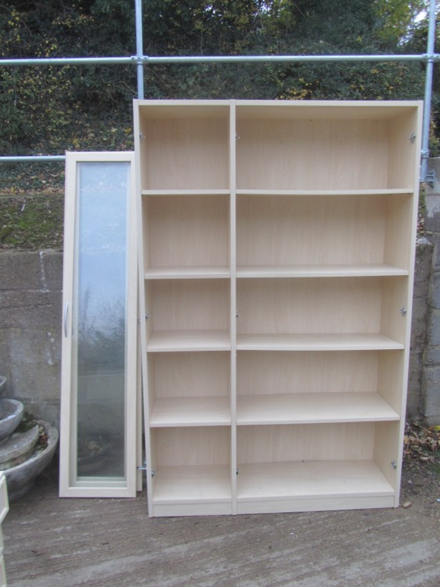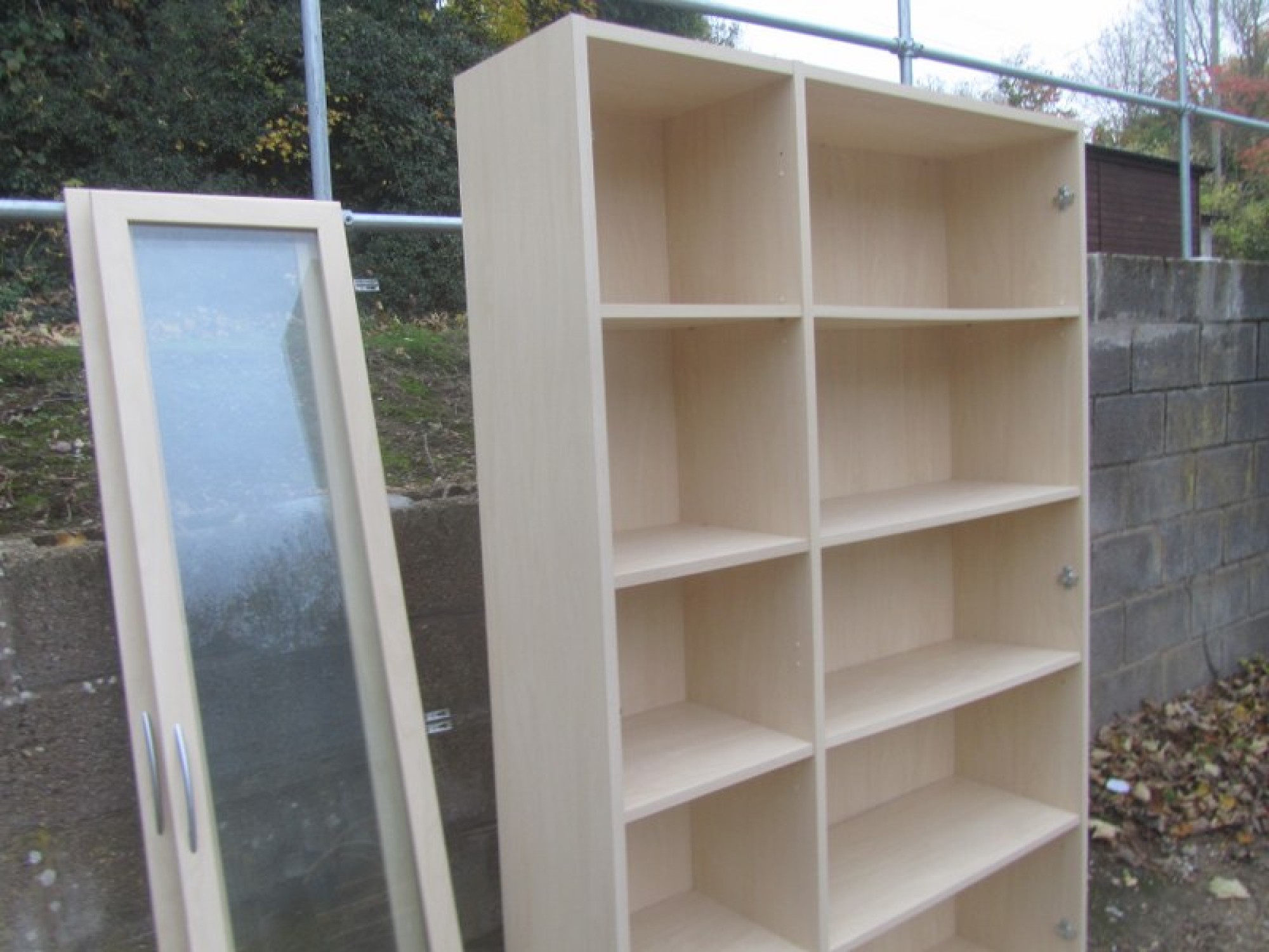 A BOOKCASE IN A BEECH EFFECT FINISH. WITH OPTIONAL GLAZED DOORS. ALL ONE PIECE, VERY HEAVY. IT COULD BE DISMANTLED.