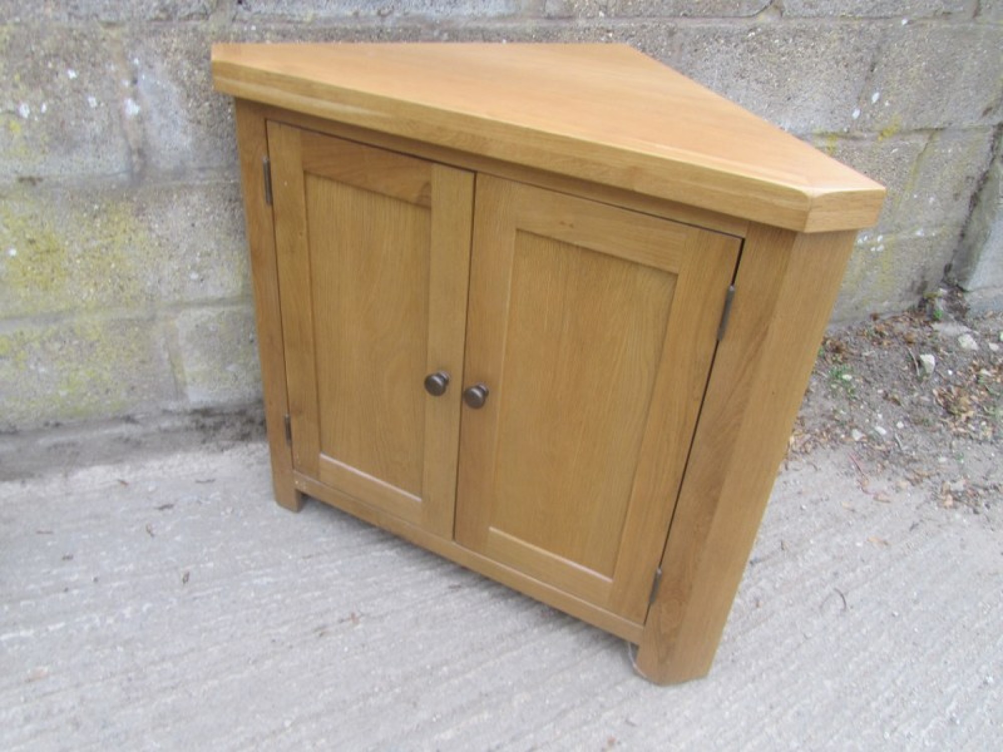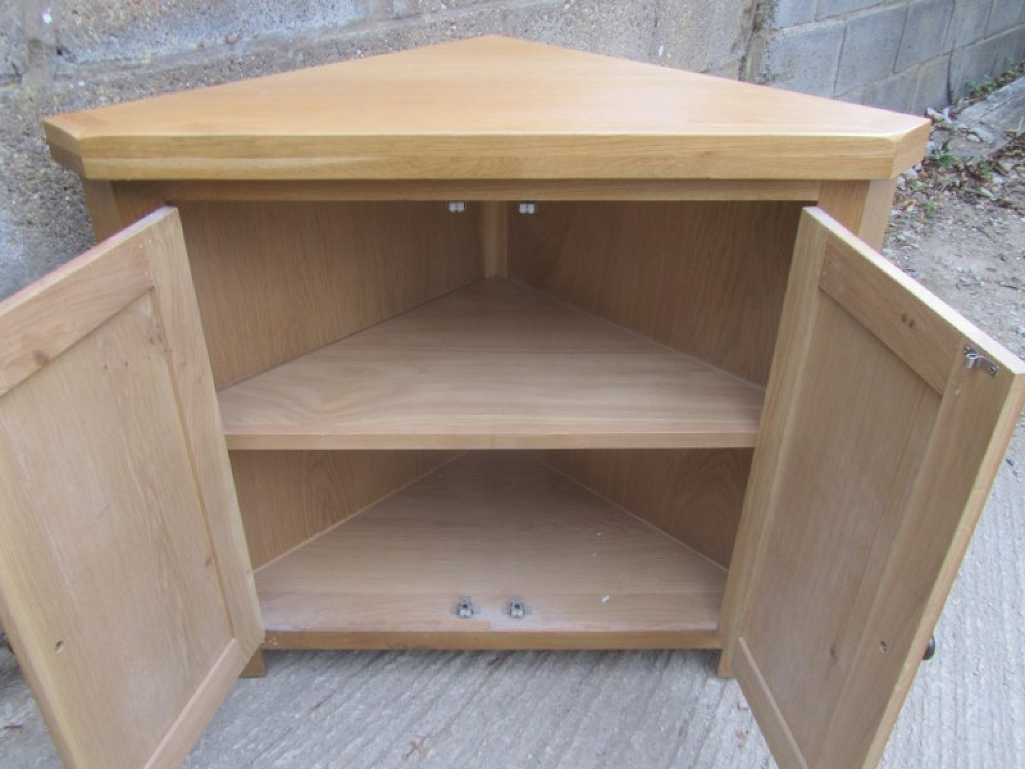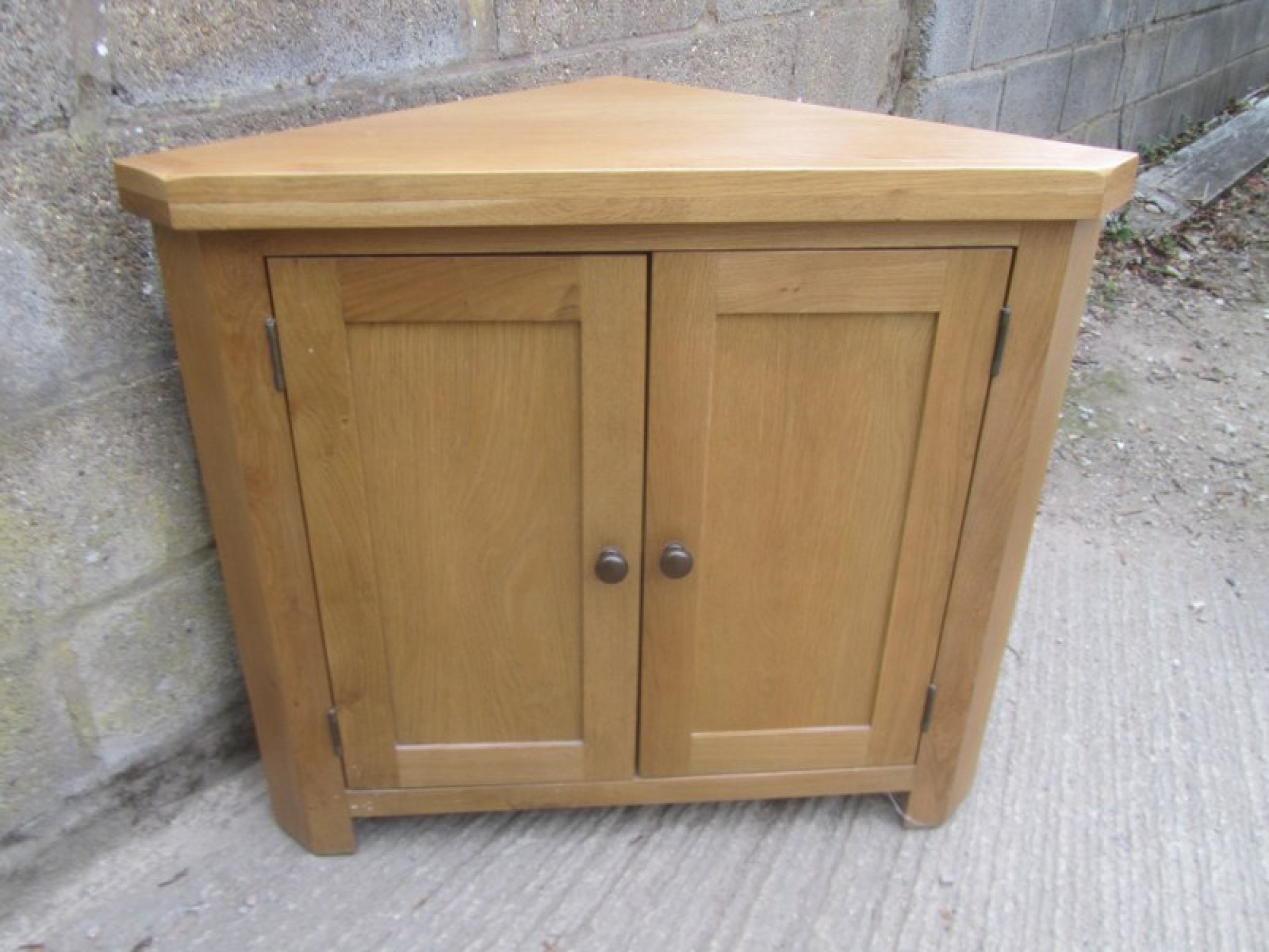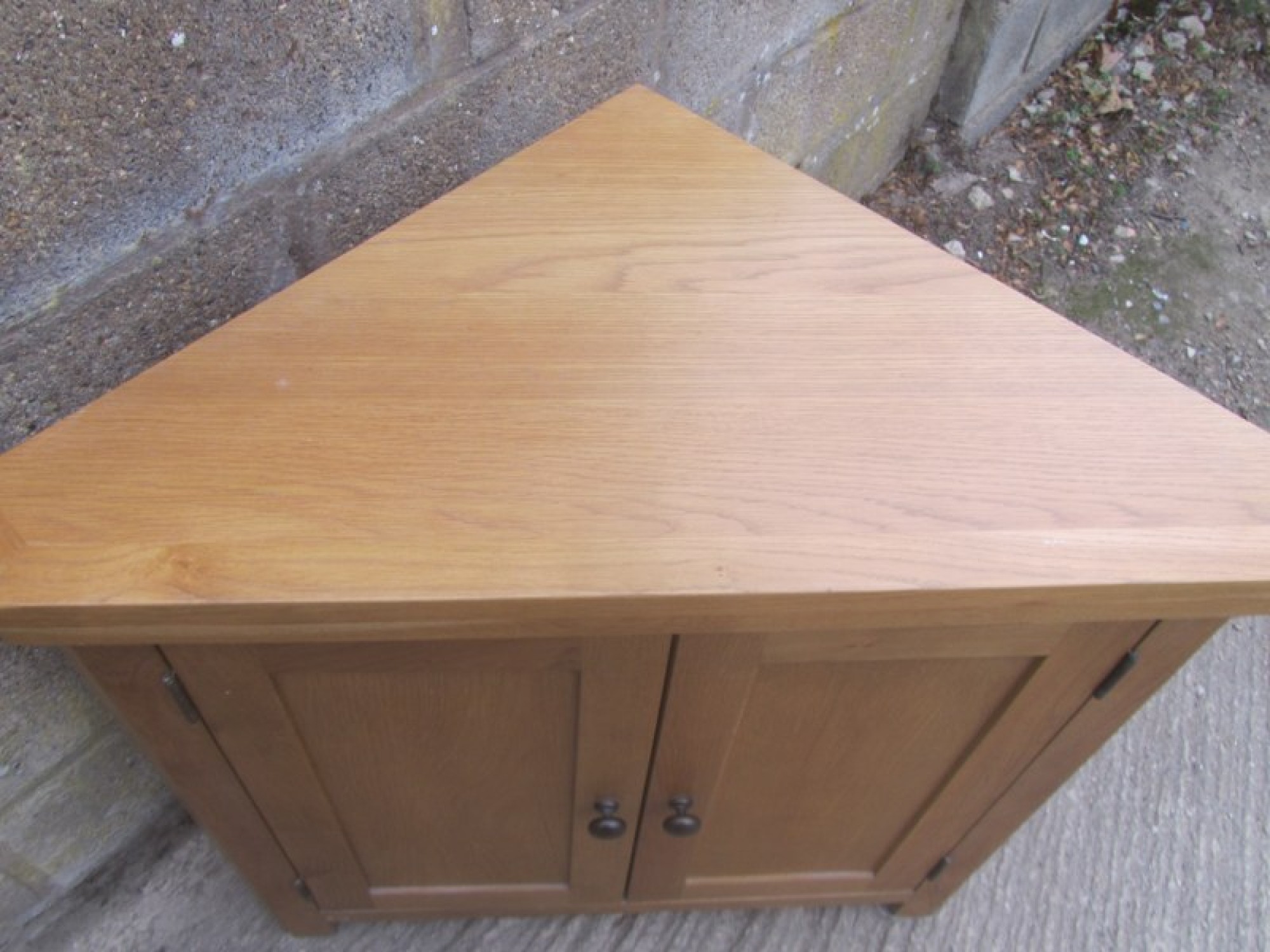 A STURDY OAK & OAK VENEERED CORNER CABINET. IDEAL FOR A TV.