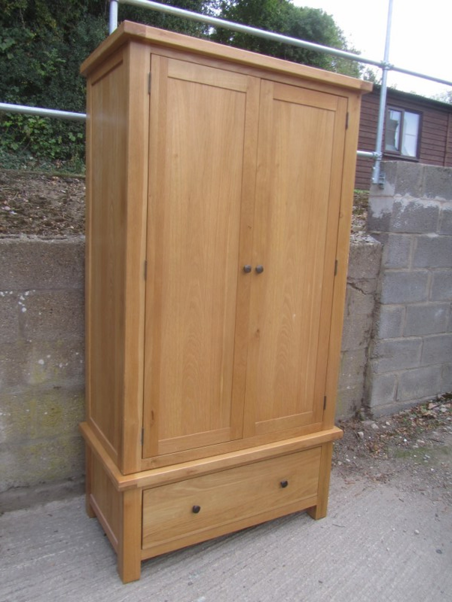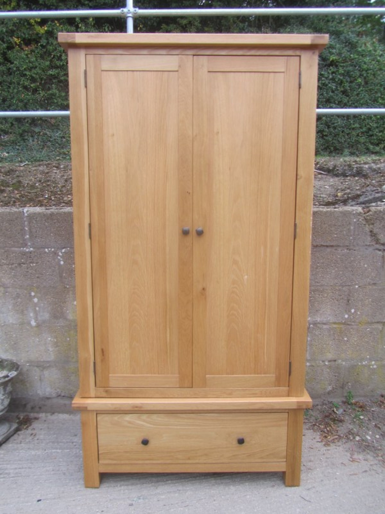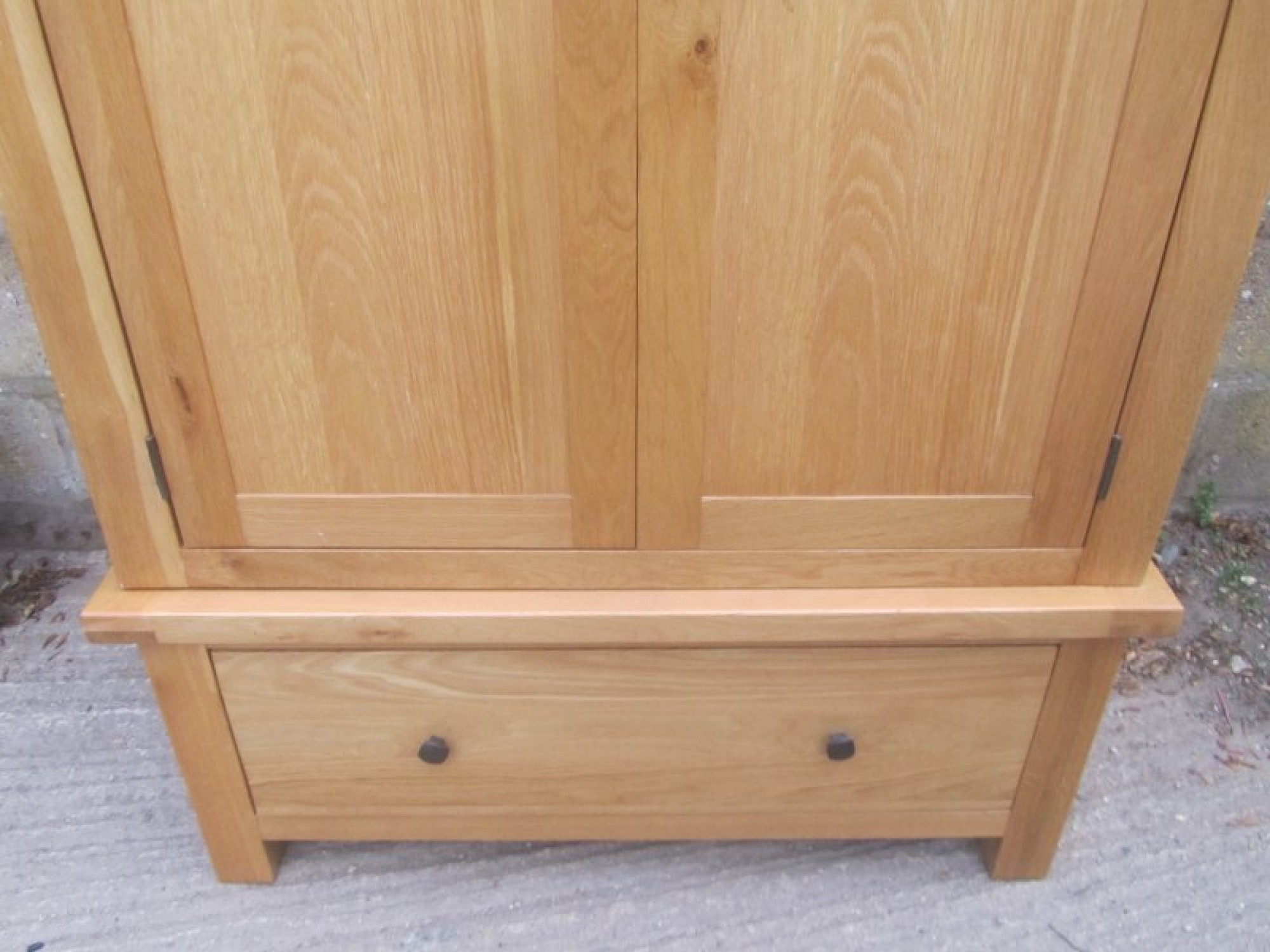A STURDY OAK & OAK VENEERED DOUBLE WARDROBE. WITH RAIL. SINGLE DRAWER BELOW. IT COMES IN 2 PARTS FOR TRANSPORT.
