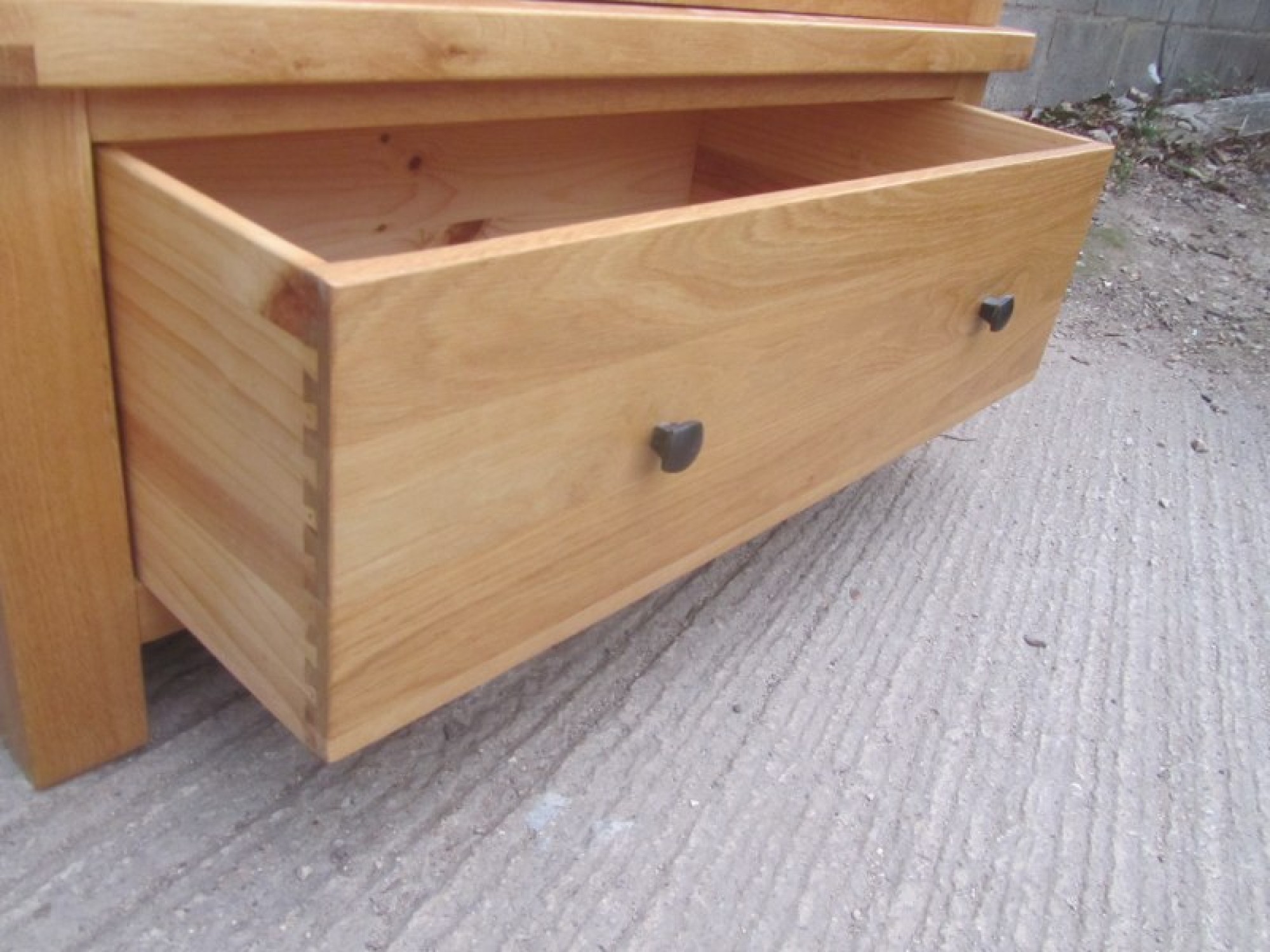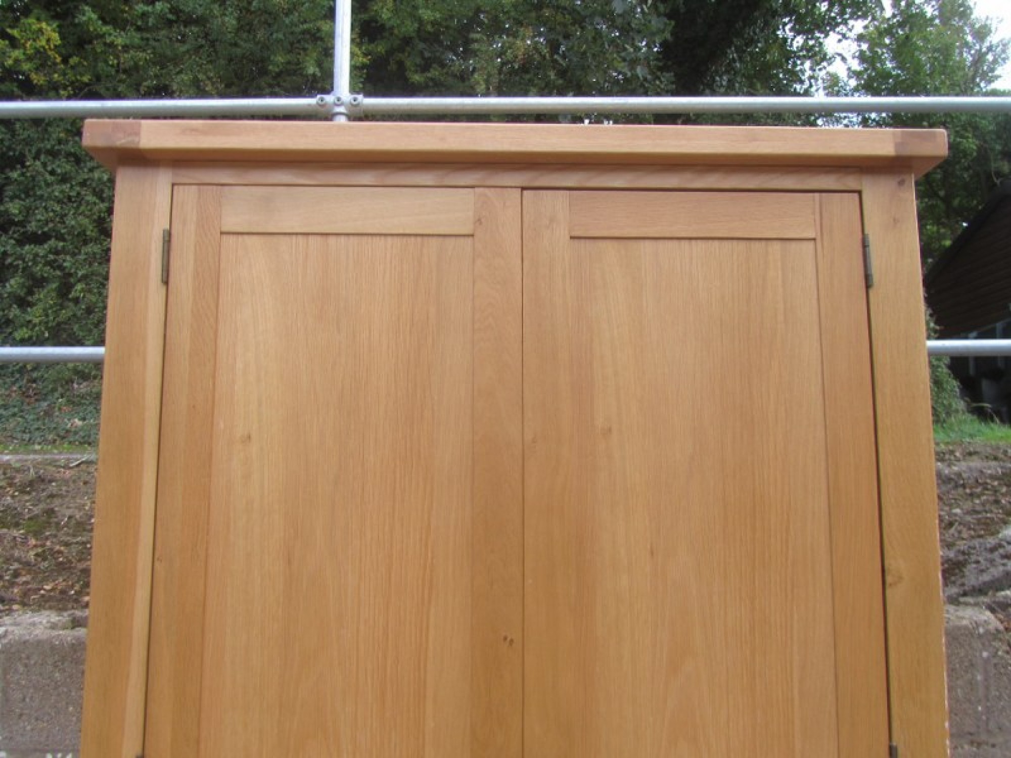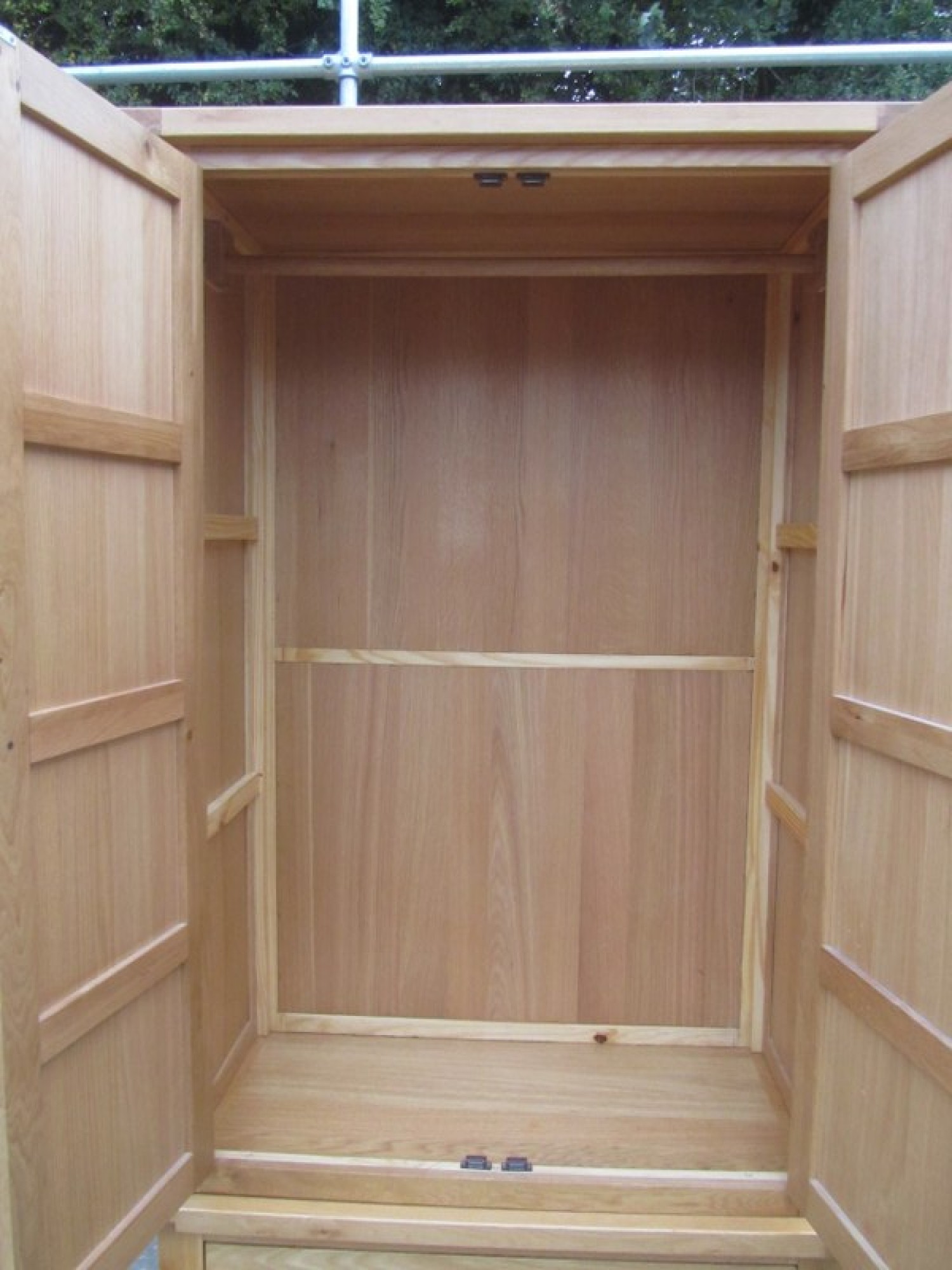 A STURDY OAK & OAK VENEERED DOUBLE WARDROBE. WITH RAIL. SINGLE DRAWER BELOW. IT COMES IN 2 PARTS FOR TRANSPORT.