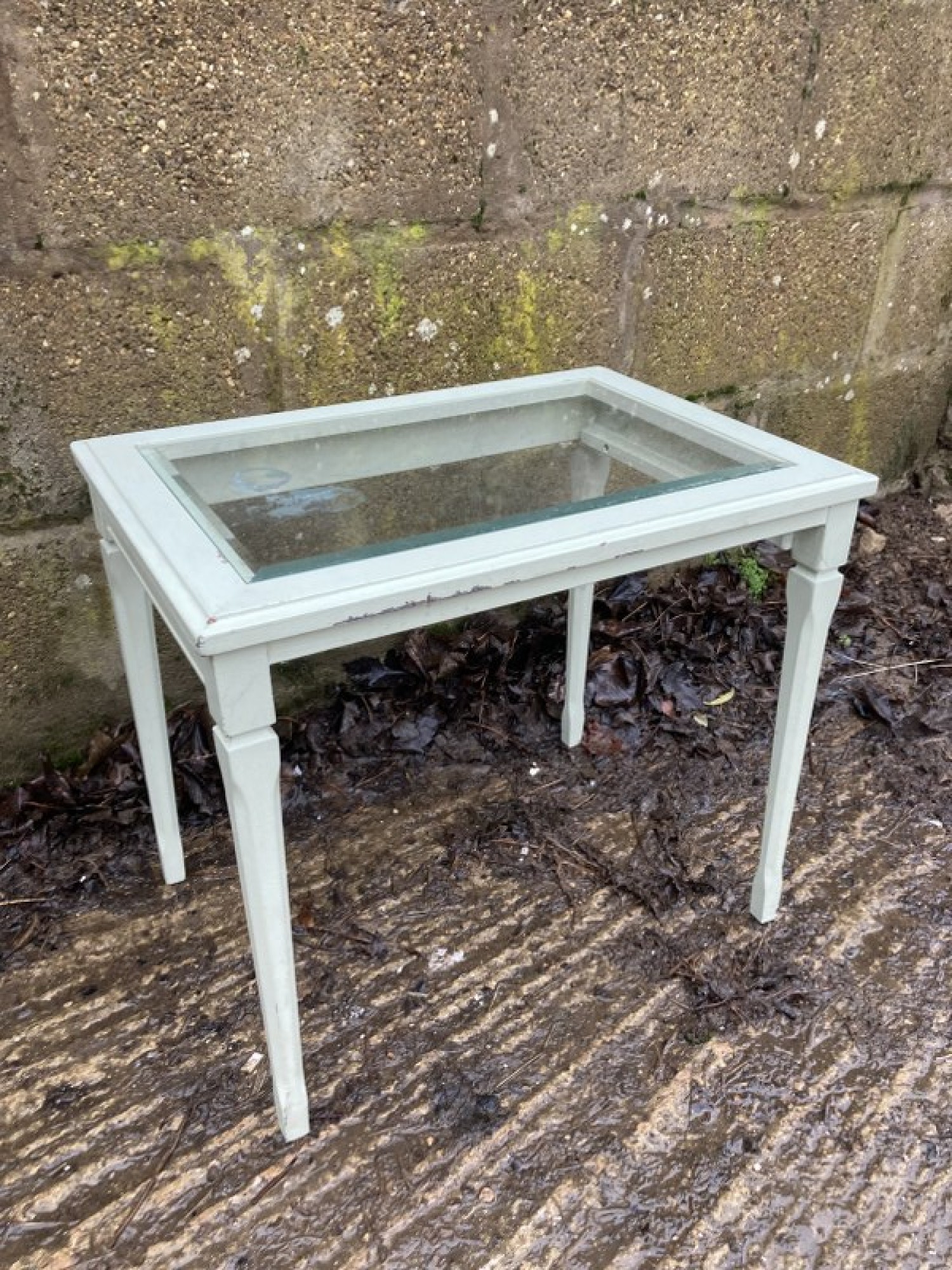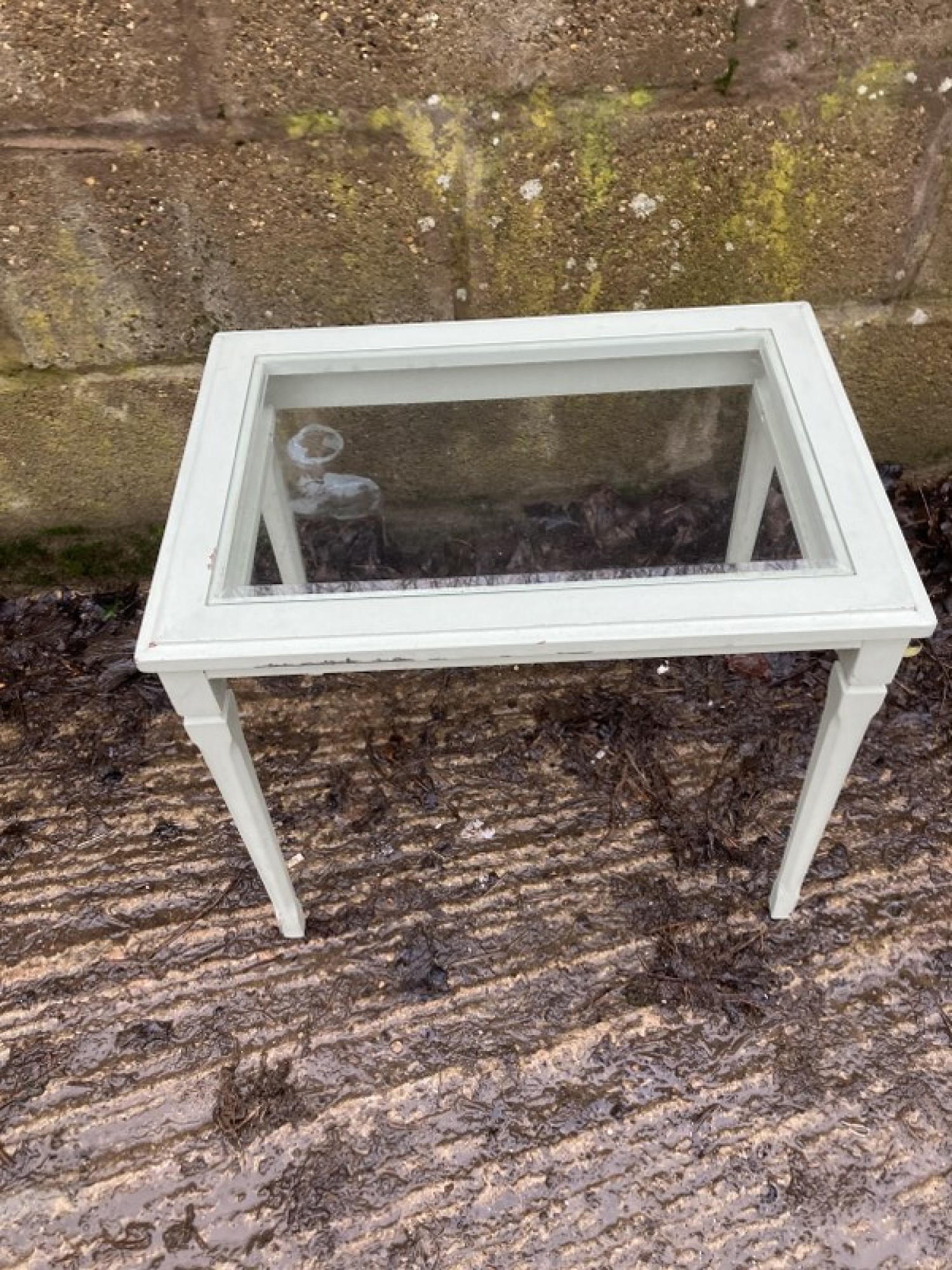 A SIDE / COFFEE TABLE WITH A PAINTED FINISH. STRONG AND STURDY, SOME MARKS AND WEAR. GLASS TOP.