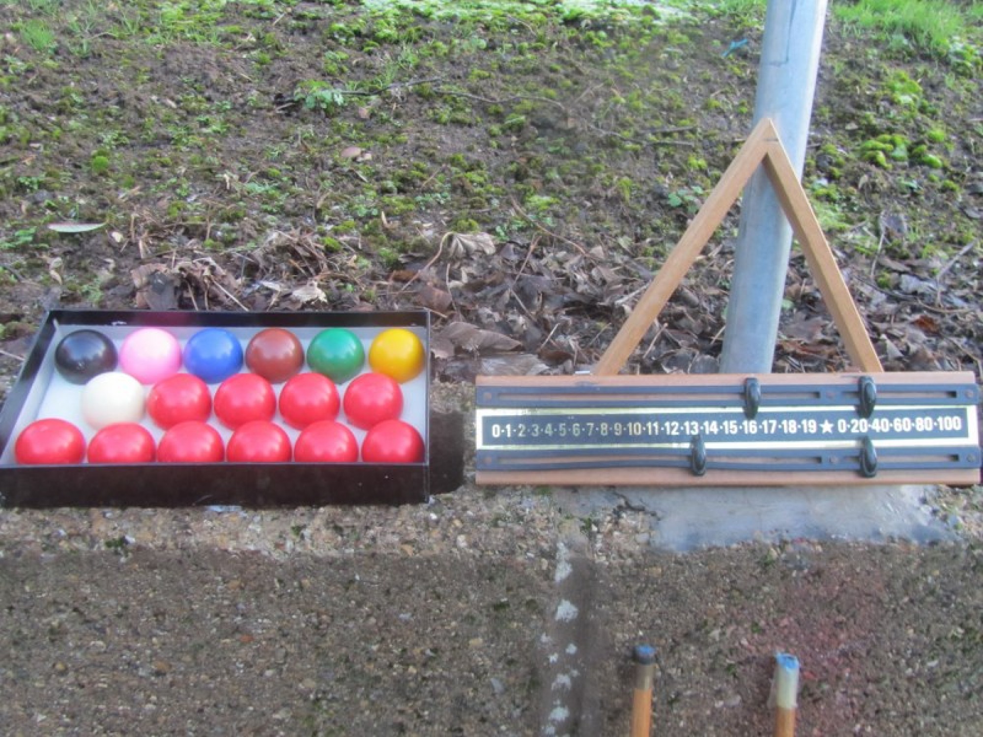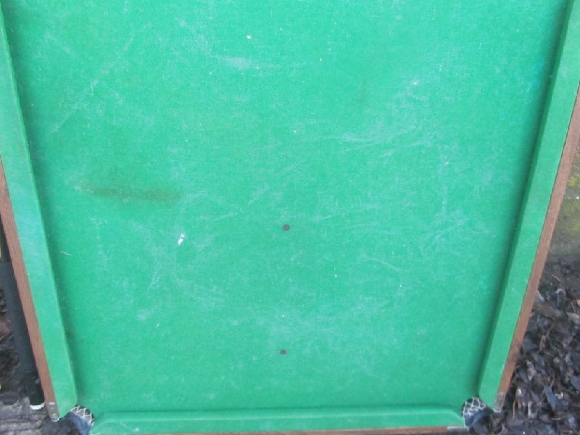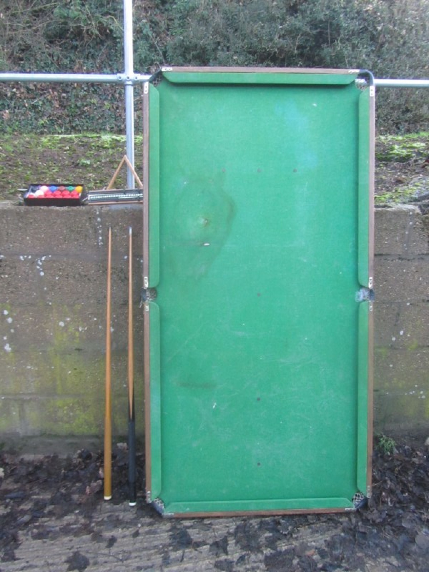 A SMALL POOL/SNOOKER TABLE. THE LEGS FOLD FLAT, BUT 2 OF THE LEG SUPPORTS ARE DAMAGED AND NEED REPAIR. THE FELT IS WORN, SOME STAINS/MARKS. THIS IS NOT A QUALITY POOL TABLE, IT IS A BASIC SMALL SET, IDEAL FOR TEENAGERS. IT INCLUDES 2 CUES, ONE TIP MISSING. THERE ARE A SET OF SMALL BALLS.