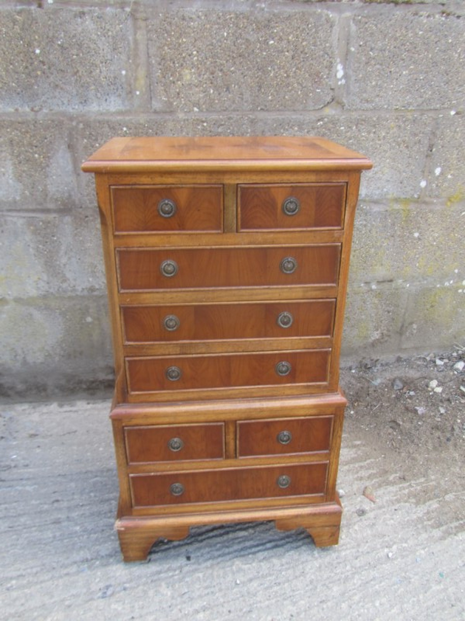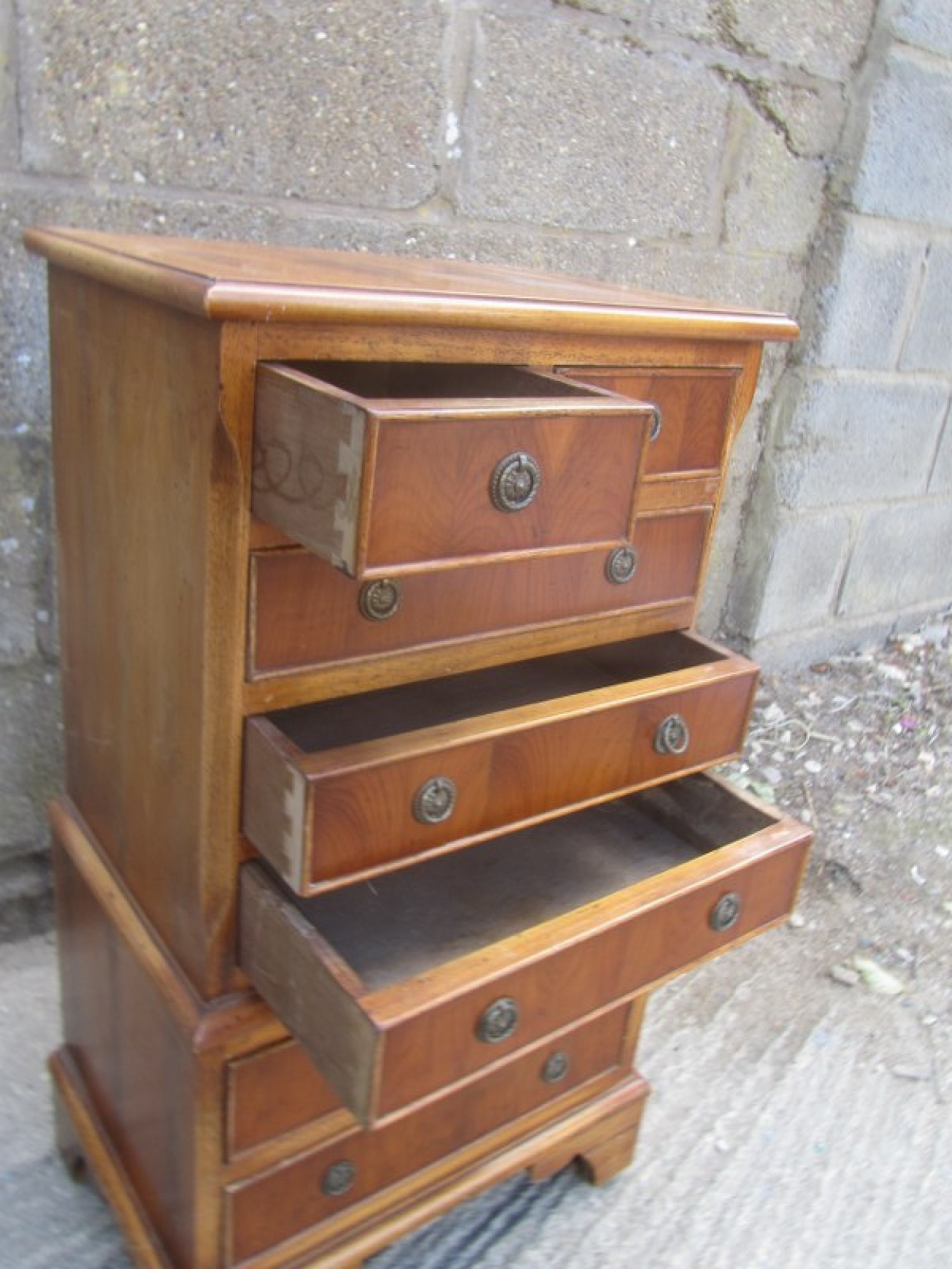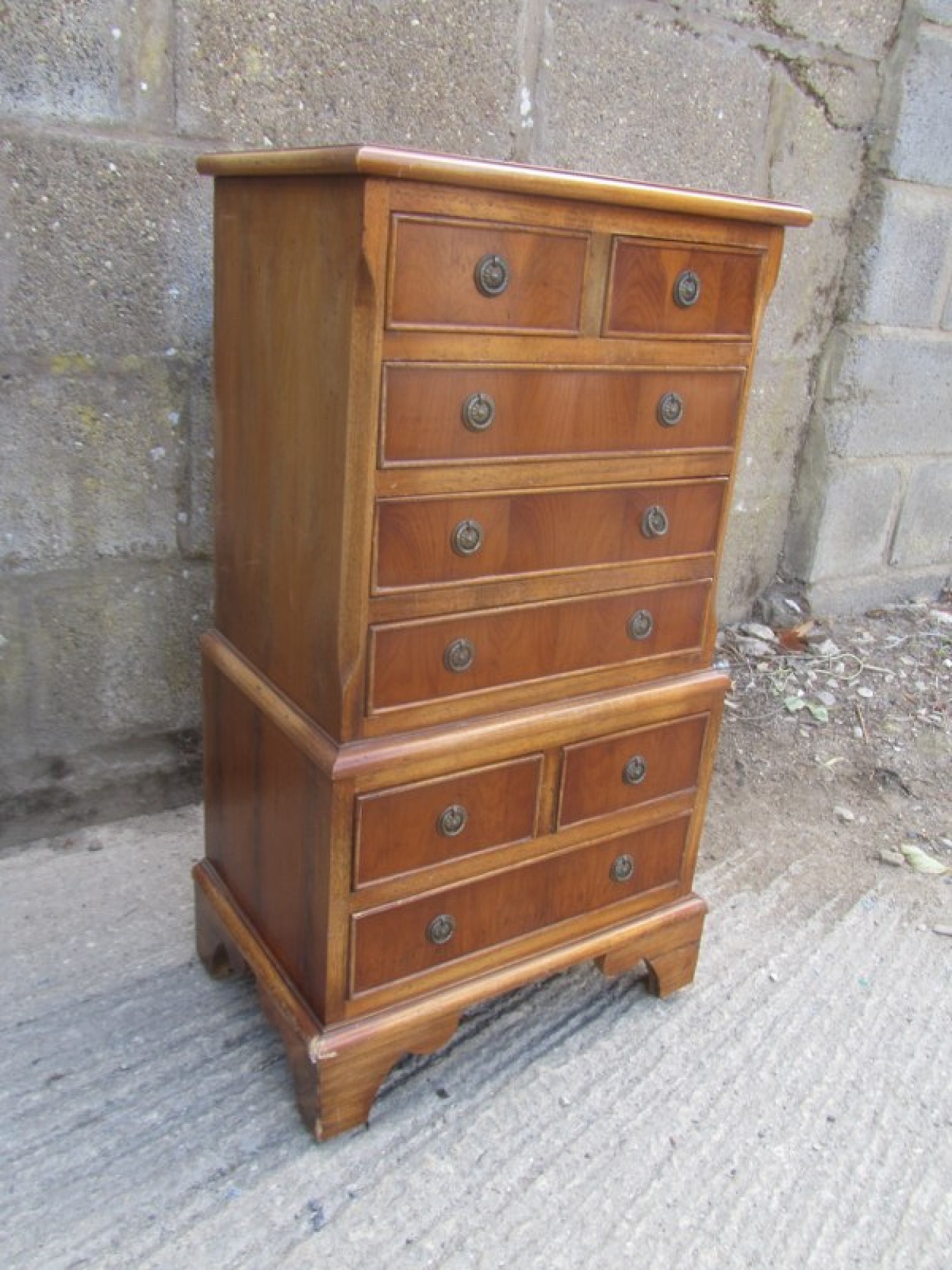THIS IS A TALL CHEST OF DRAWERS, IT IS A QUALITY REPRODUCTION PIECE, VENEERED IN A YEW WOOD FINISH. THERE ARE SMALL DRAWERS WITH ORIGINAL METAL HANDLES, THE DRAWERS ARE VERY SMALL, IDEAL FOR KEYS, CARDS etc, TOO SMALL FOR CLOTHES. IN A GEORGIAN REGENCY STYLE.