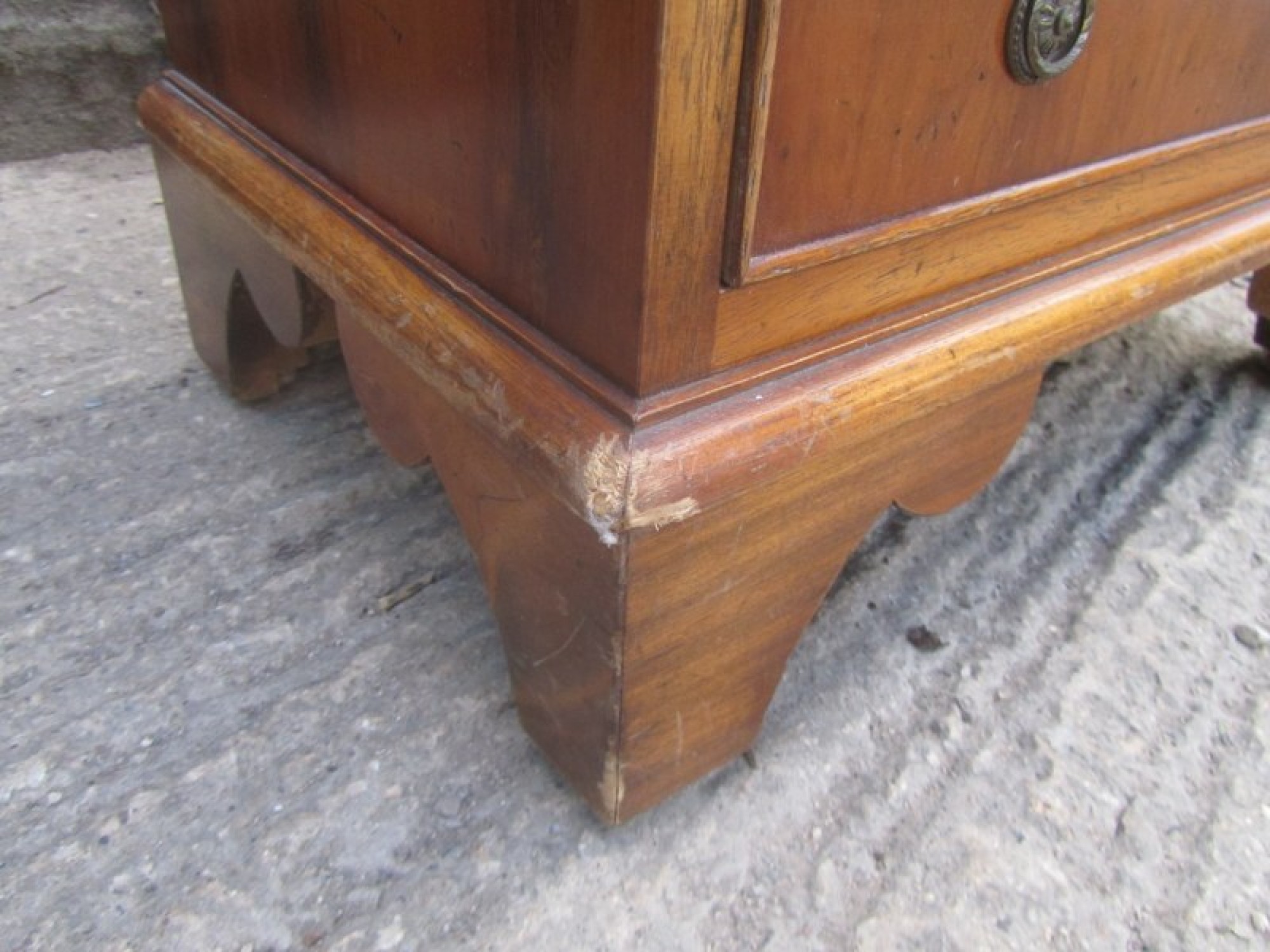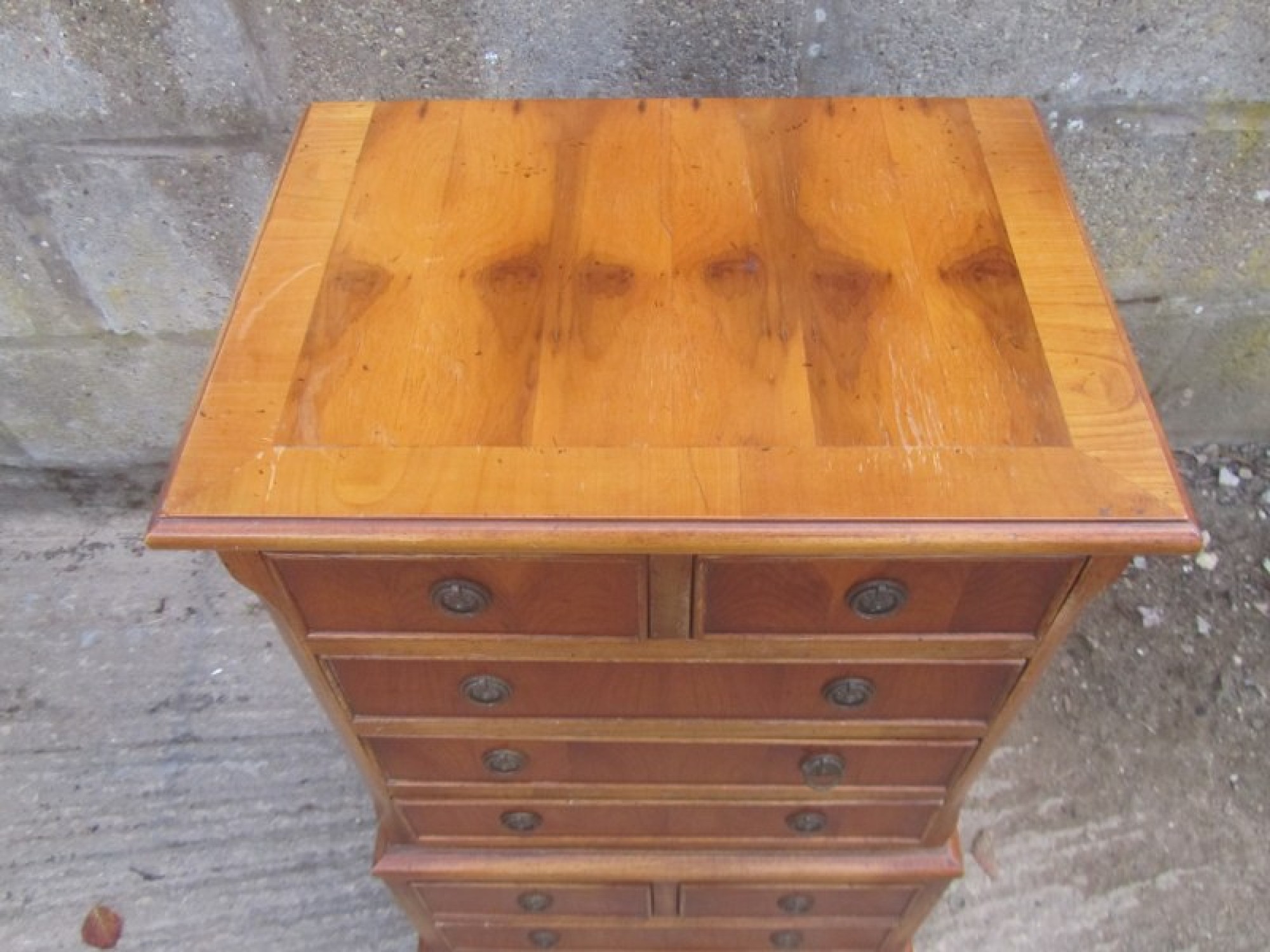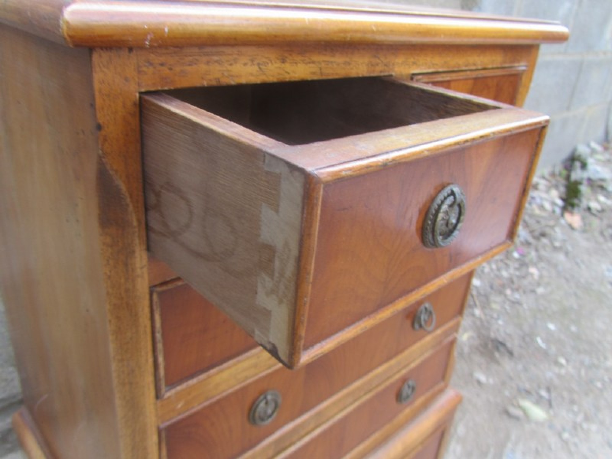 THIS IS A TALL CHEST OF DRAWERS, IT IS A QUALITY REPRODUCTION PIECE, VENEERED IN A YEW WOOD FINISH. THERE ARE SMALL DRAWERS WITH ORIGINAL METAL HANDLES, THE DRAWERS ARE VERY SMALL, IDEAL FOR KEYS, CARDS etc, TOO SMALL FOR CLOTHES. IN A GEORGIAN REGENCY STYLE.