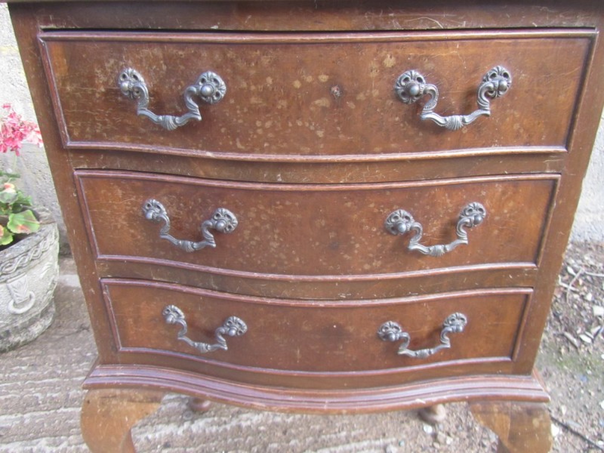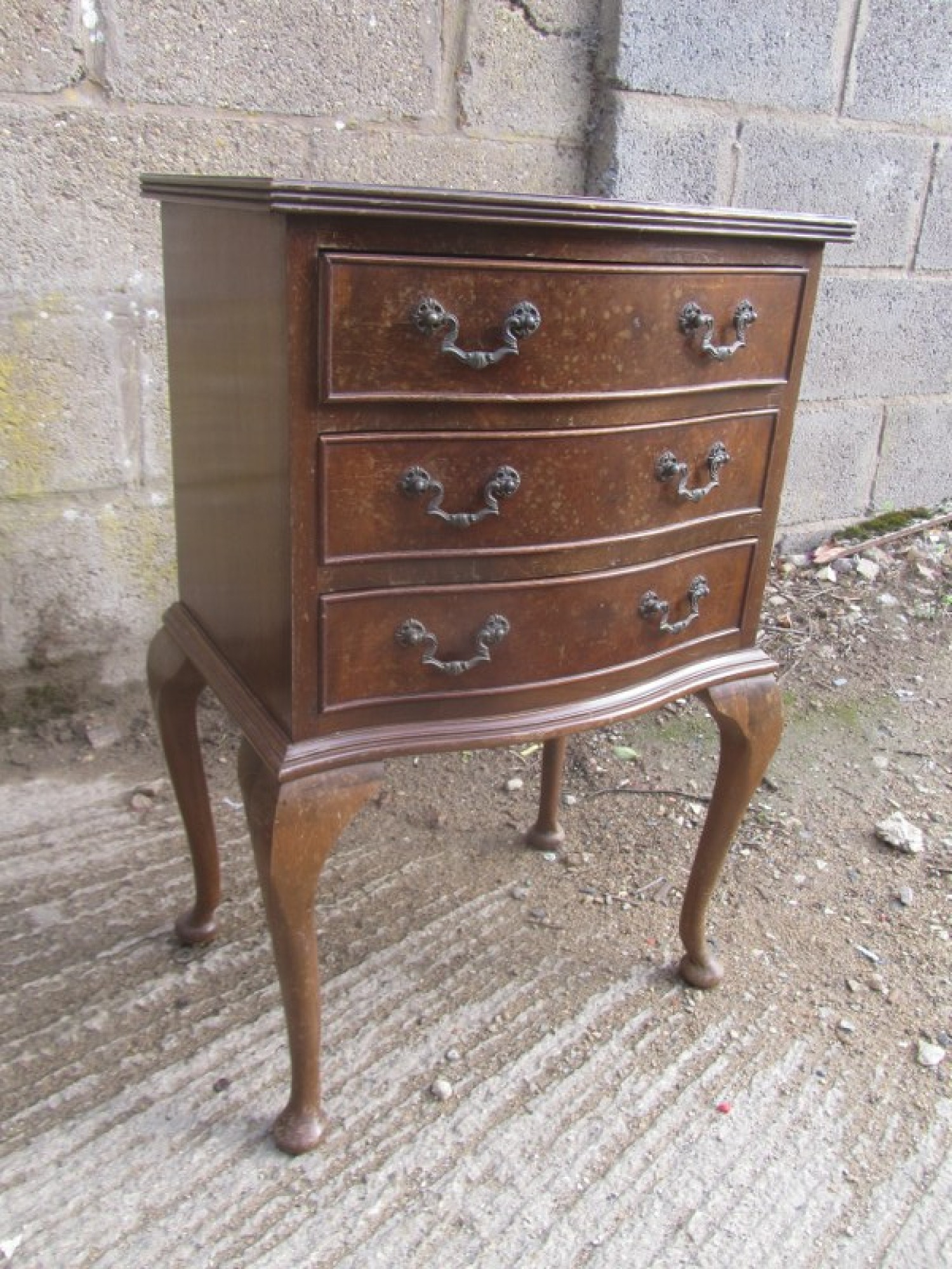 THIS IS A SMALL CHEST OF DRAWERS OR BEDSIDE CABINET, IT IS A QUALITY REPRODUCTION PIECE, VENEERED IN MAHOGANY. THERE ARE DRAWERS WITH ORIGINAL METAL HANDLES. IN A GEORGIAN REGENCY STYLE. MARKS AND WEAR ON THE DRAWER FRONTS.