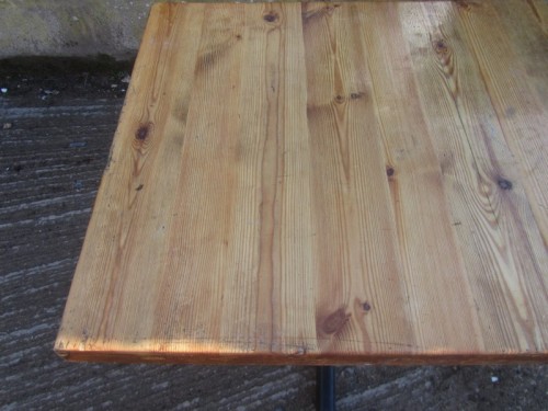 A BASIC SOLID PINE DINING TABLE TO SEAT 2 DINERS IN A TRADITIONAL FARMHOUSE STYLE, STRONG AND STURDY. SOME SCUFFS AND STAINING TO THE WOOD. THE TOP IS SLIGHTLY WARPED.