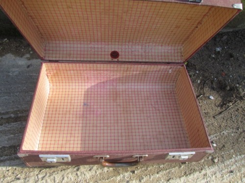 THIS IS A VINTAGE SUITCASE FROM THE 1950s. IT IS VINYL. THE CATCHES ARE OLD METAL, THEY ARE STIFF, BUT DO WORK. NEEDS A CLEAN. IT IS IN AVERAGE CONDITION. LINING INSIDE.