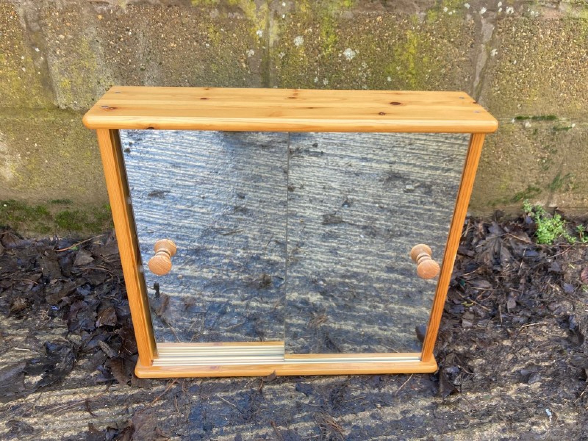 A SOLID PINE BATHROOM CABINET TO FIT ON THE WALL. THERE ARE MIRRORED DOORS WITH SHELF INSIDE.