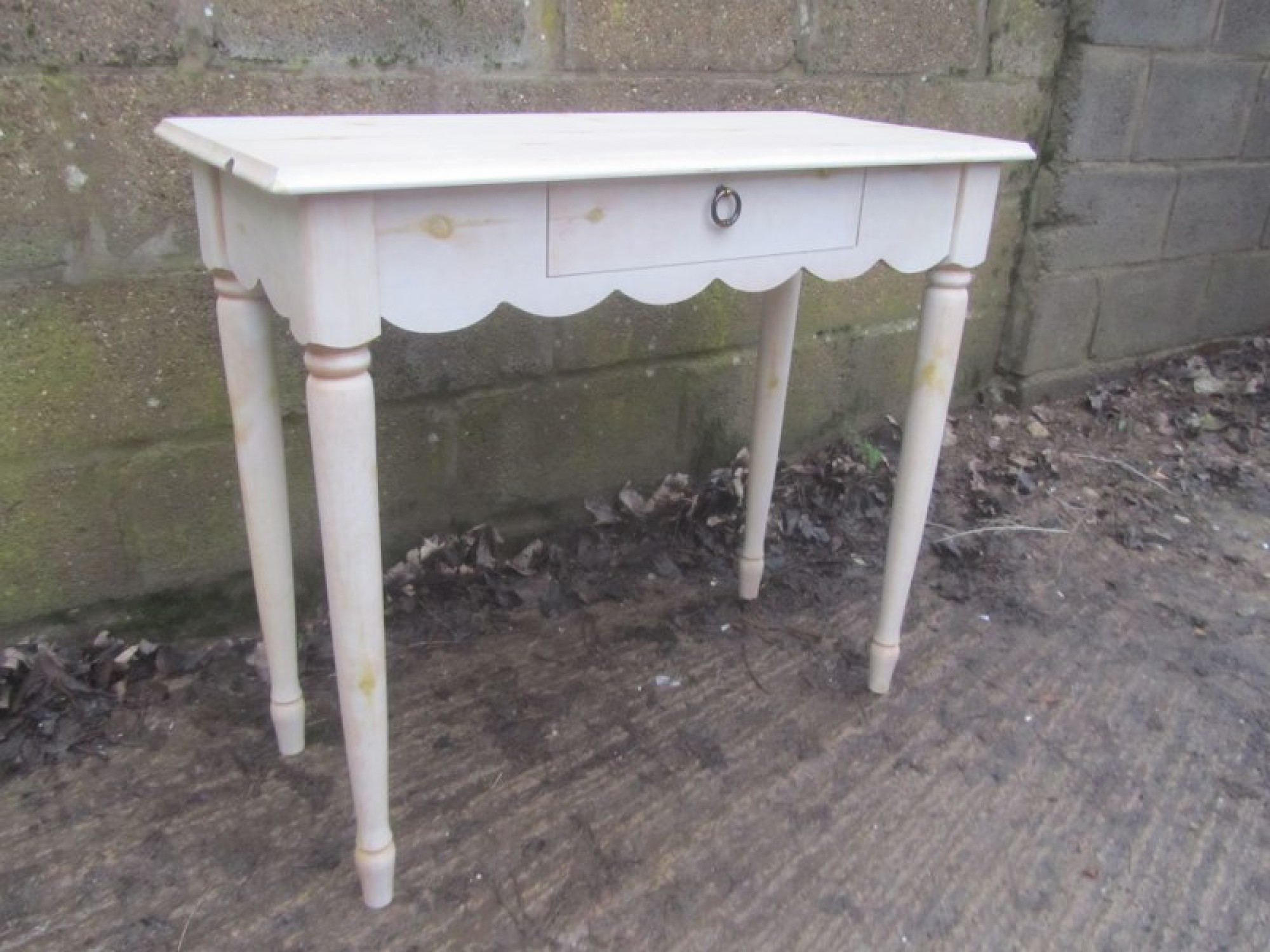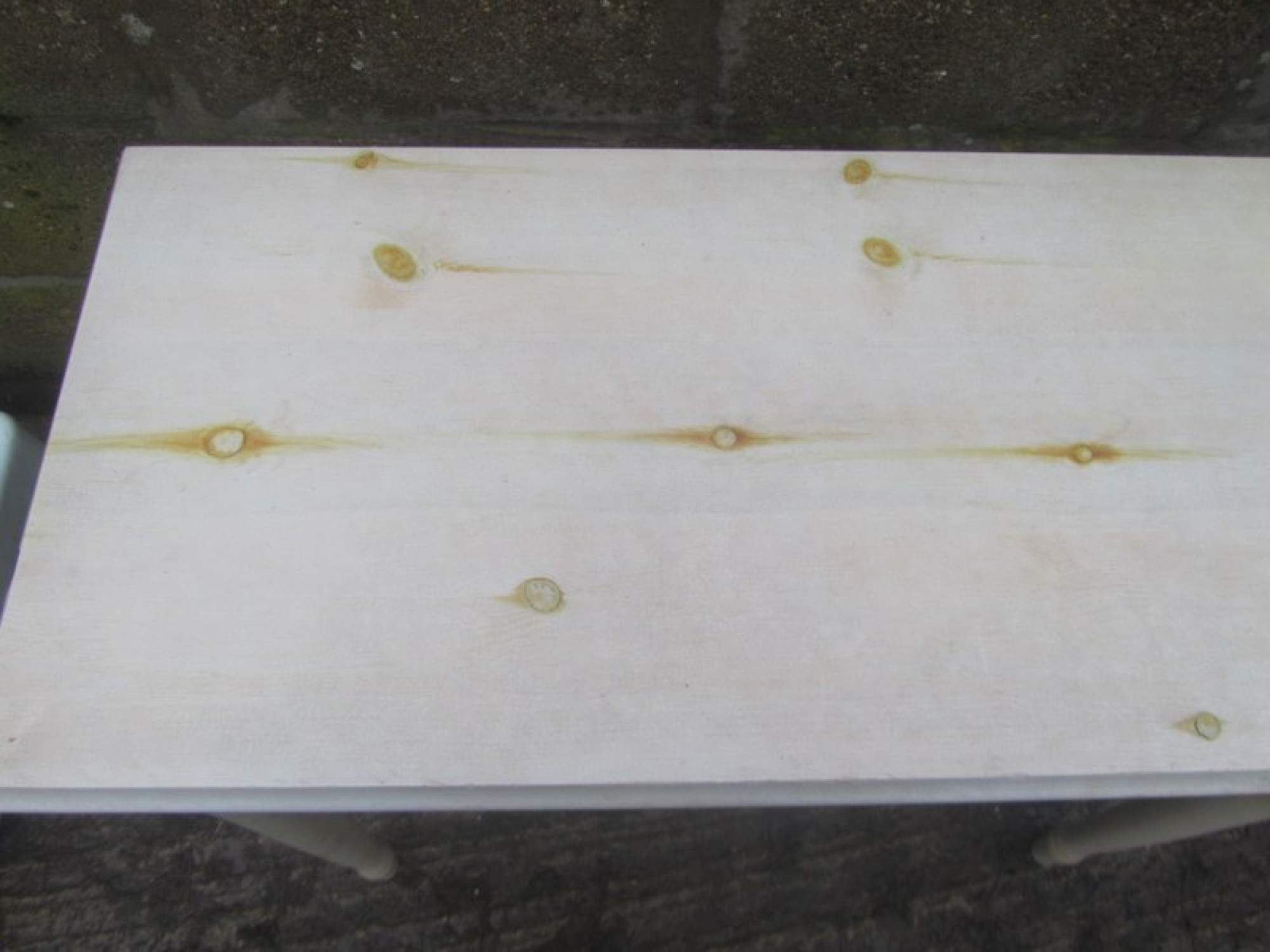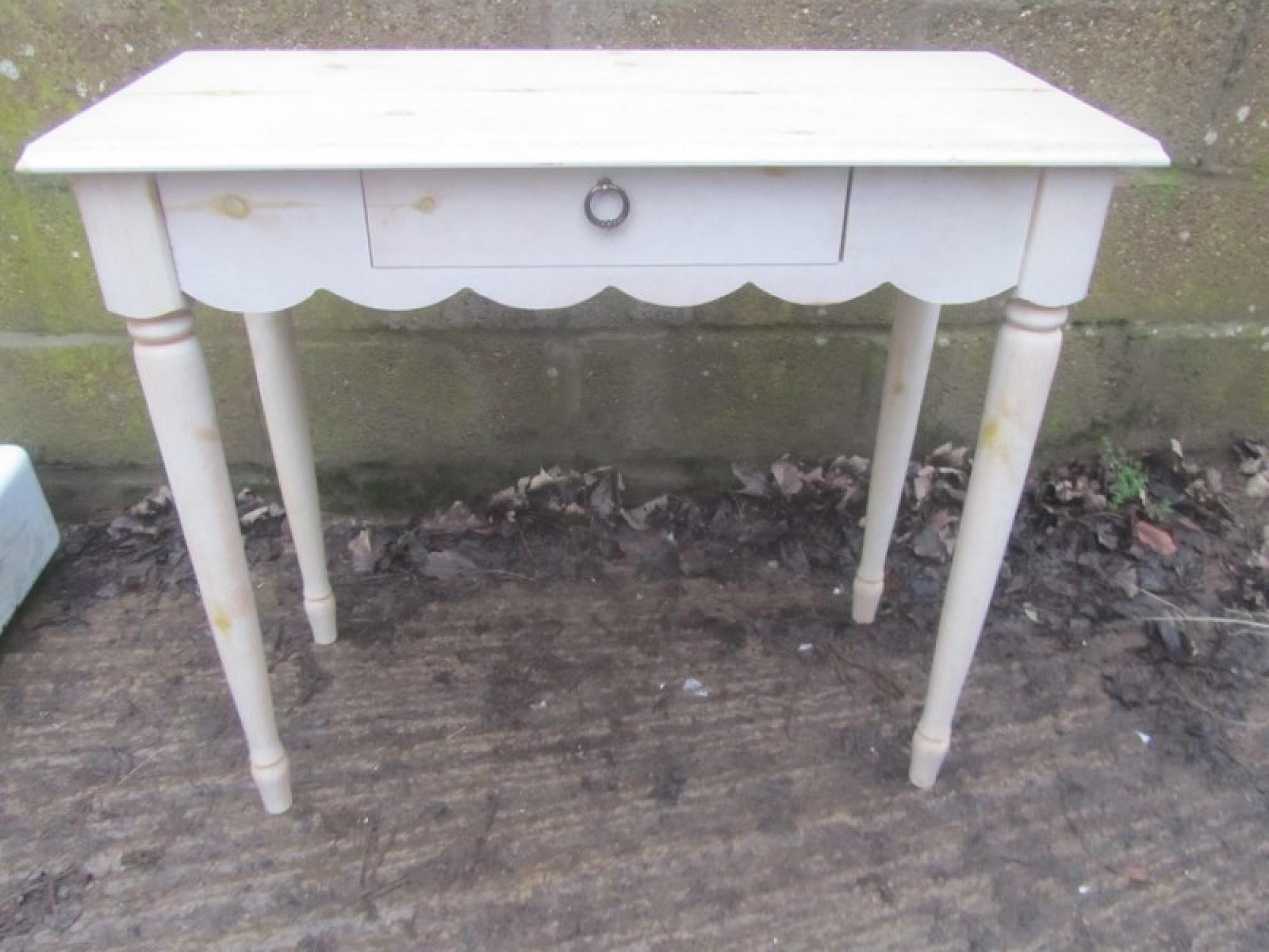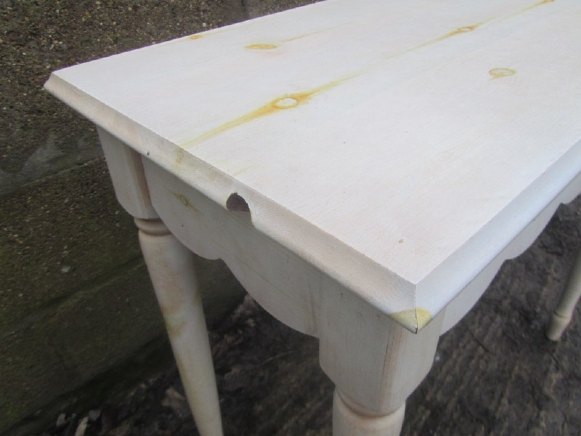 A STURDY HALL TABLE, IN A WORN CREAM FINISH. SOLID PINE TABLE.