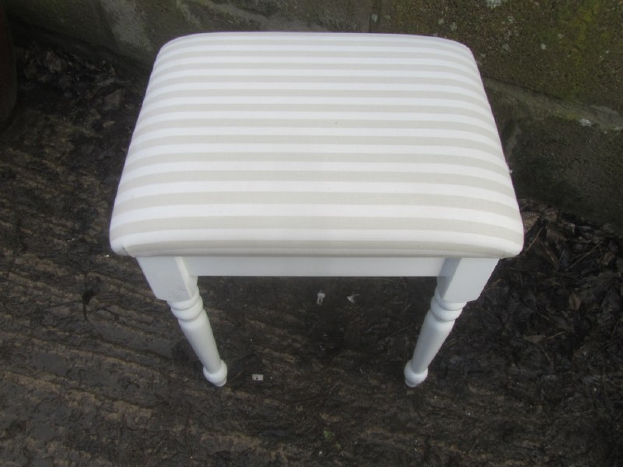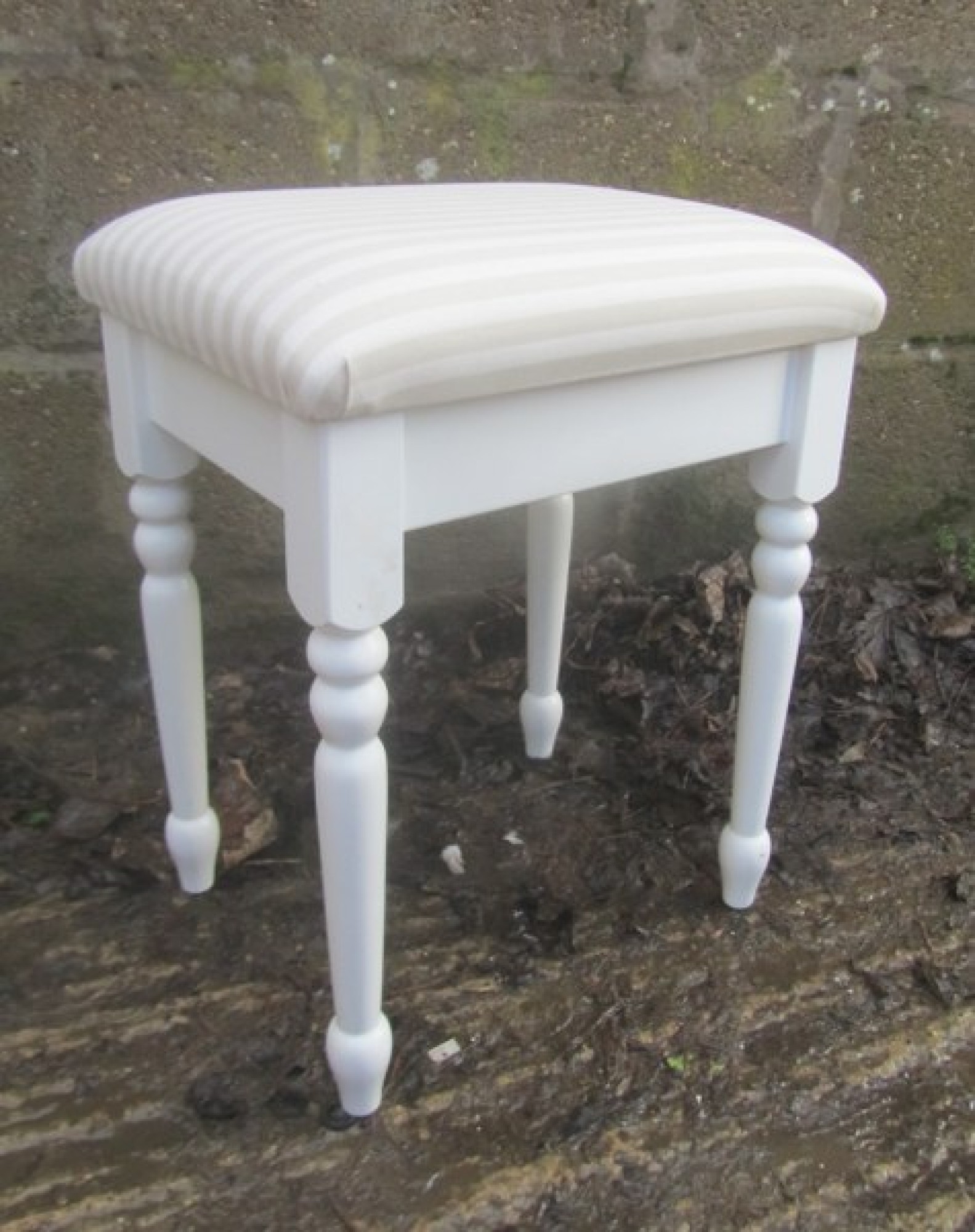 A SOLID WOOD DRESSING TABLE STOOL. THE TOP IS PADDED AND COVERED IN MATERIAL. STRONG AND STURDY SOLID WOOD FRAME.