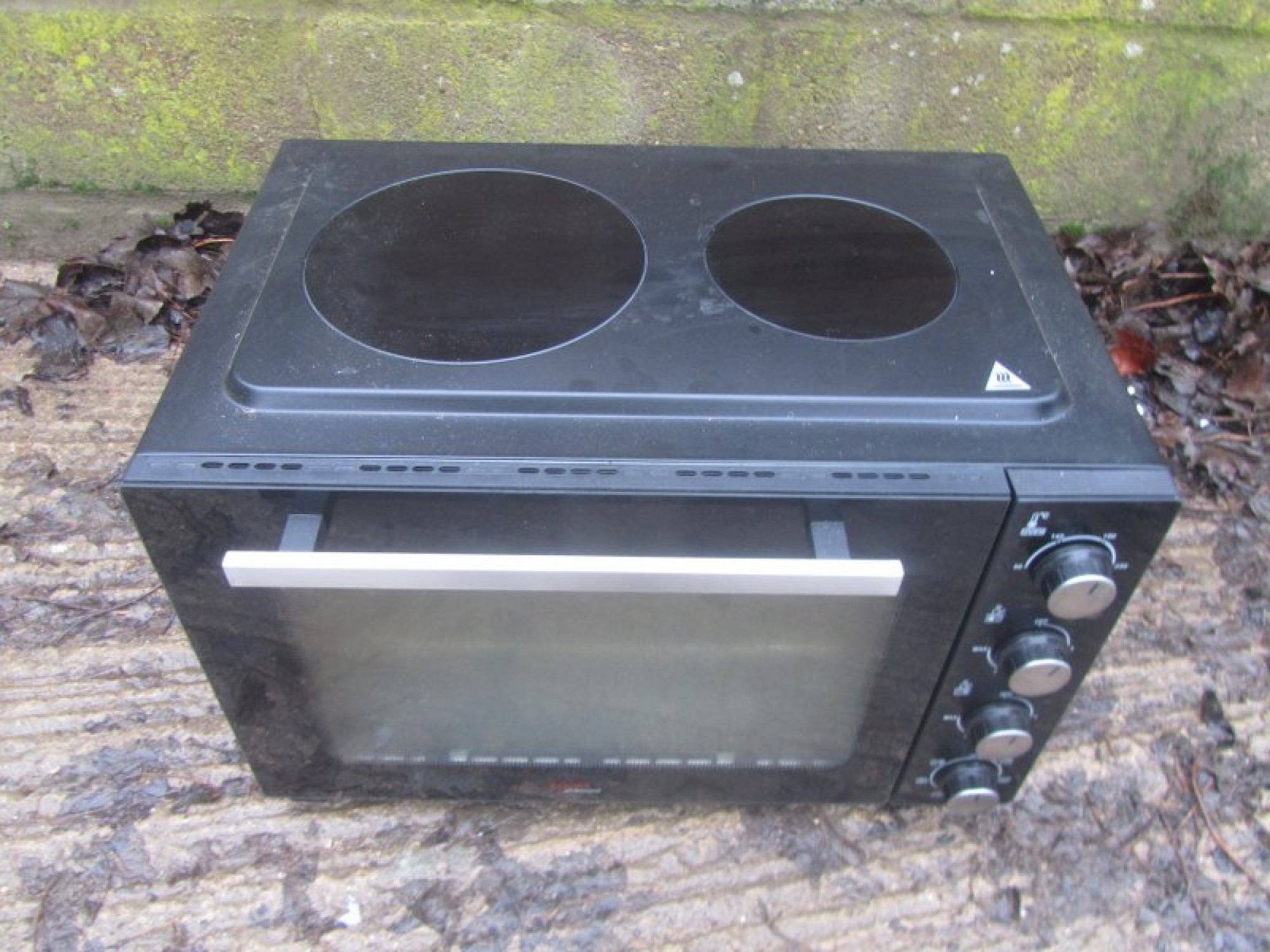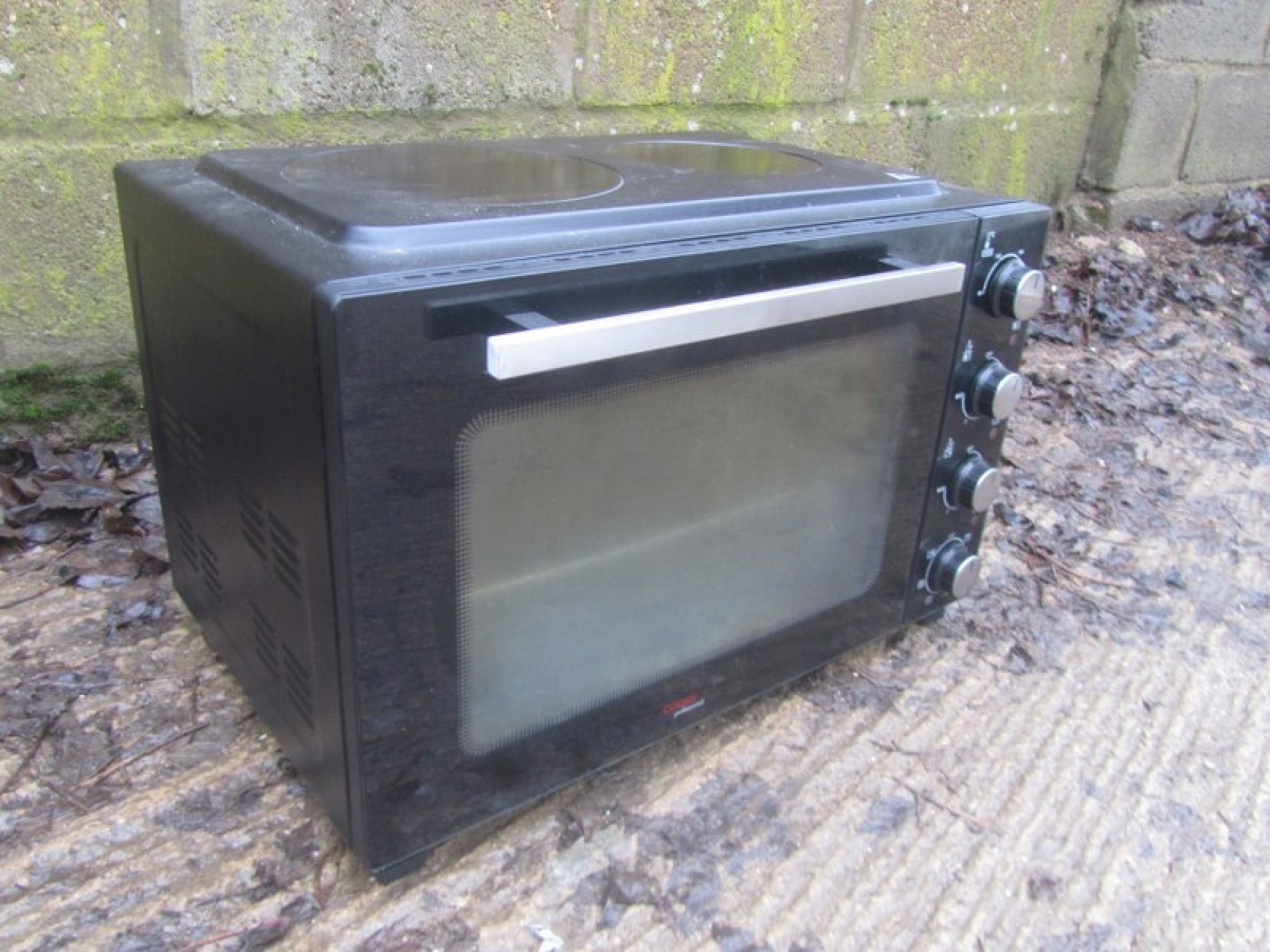 A COMPACT OVEN TO SIT ON A WORK TOP. WORKS ON MAINS PLUG. A SIMPLE ELECTRIC GRILL / OVEN WITH 2 CERAMIC RINGS ON TOP. IDEAL FOR ONE PERSON TO COOK PIES, CHIPS etc. IT NEEDS A CLEAN. IT IS A CURRENT MODEL AND RETAILS AT £190.