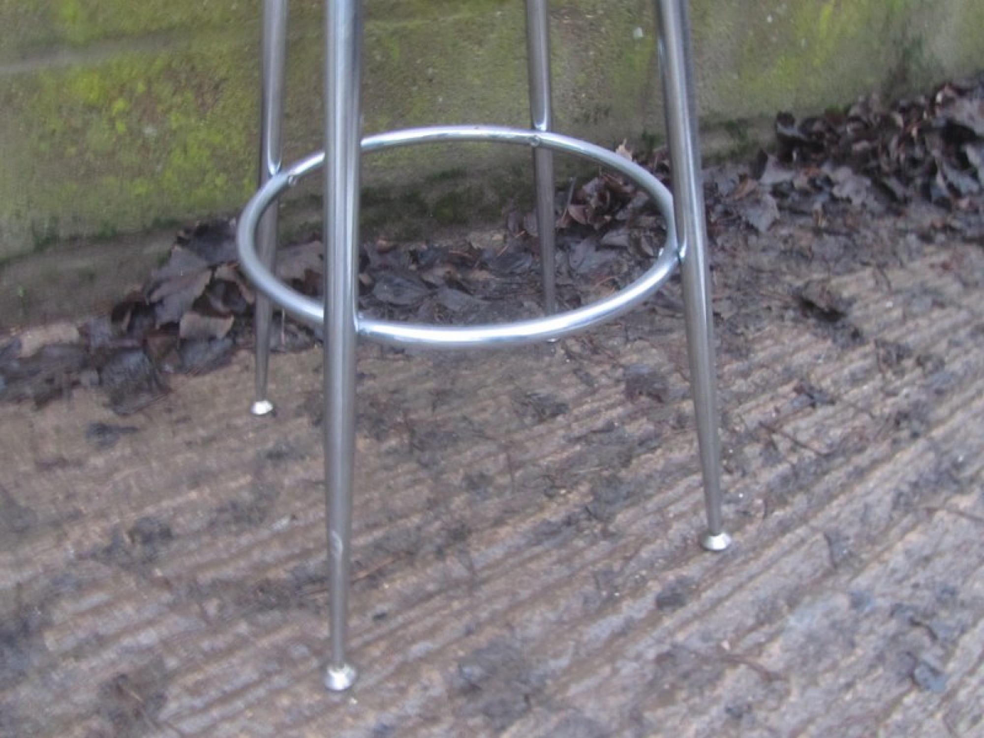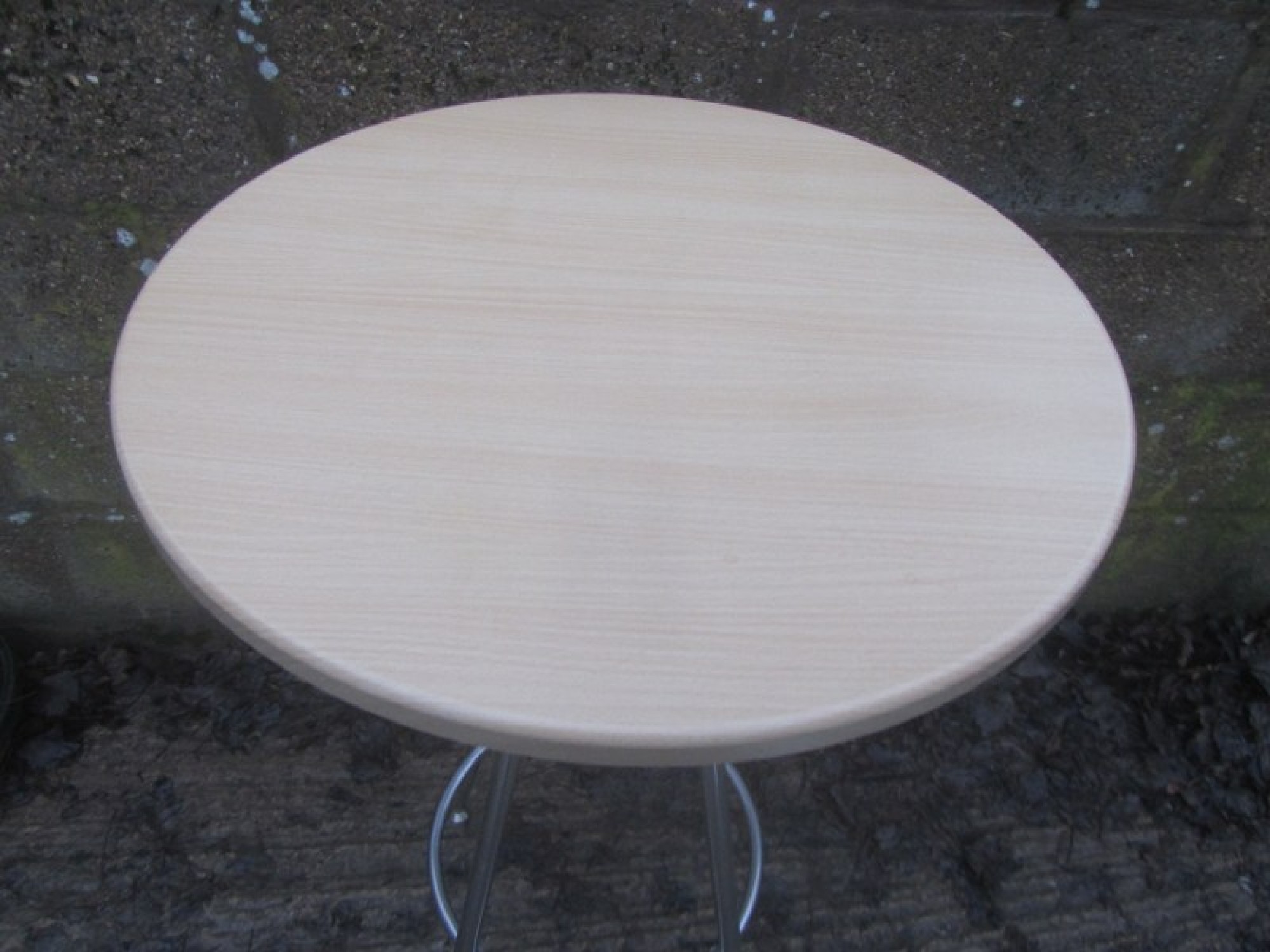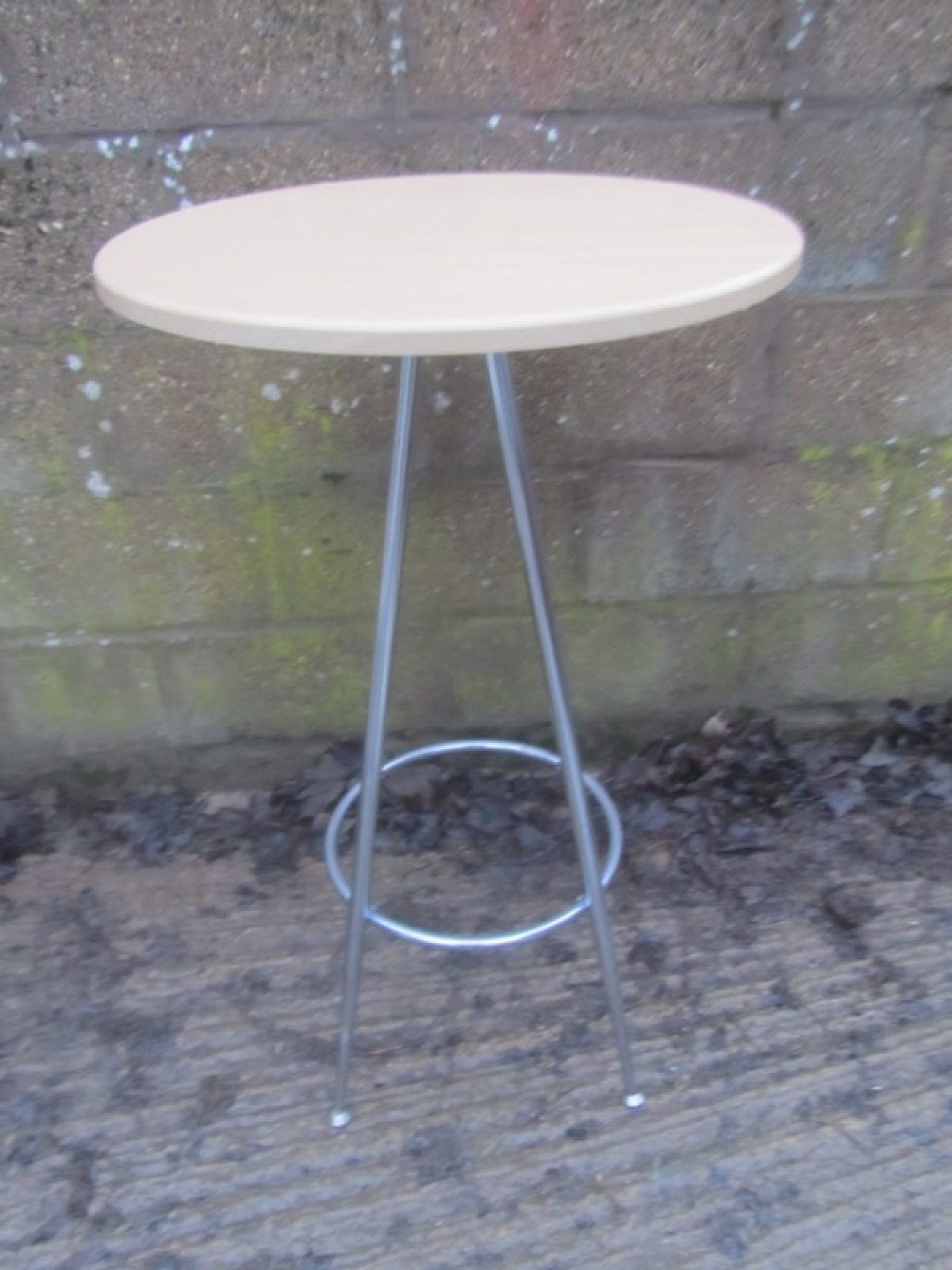 A STYLISH DINING TABLE, IT IS 60cm DIAMETER AND 100cm HIGH. METAL BASE, WOOD EFFECT TOP.