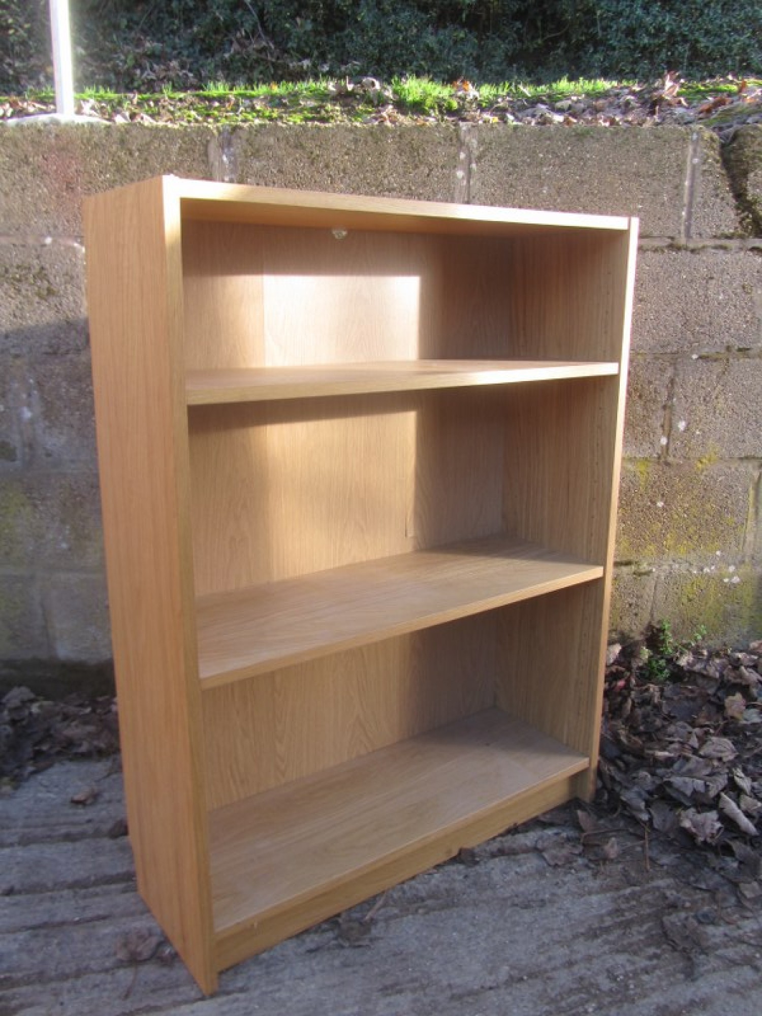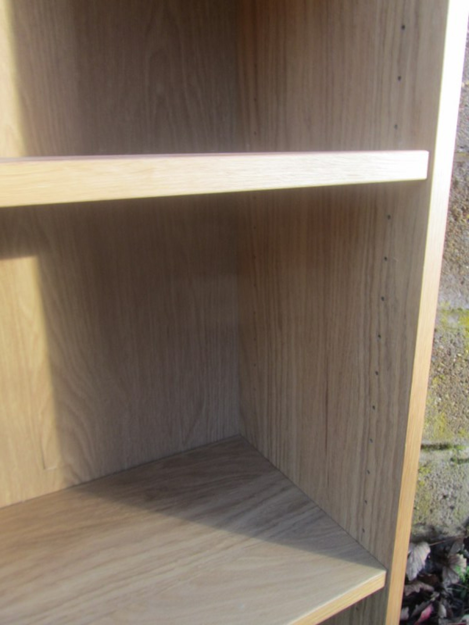 THIS IS A BOOKCASE IN AN OAK VENEER. THE BOOKCASE IS STRONG AND STURY. THERE ARE ADJUSTABLE SHELVES WITH FITTINGS. MADE BY IKEA, FROM THE 'BILLY' RANGE.