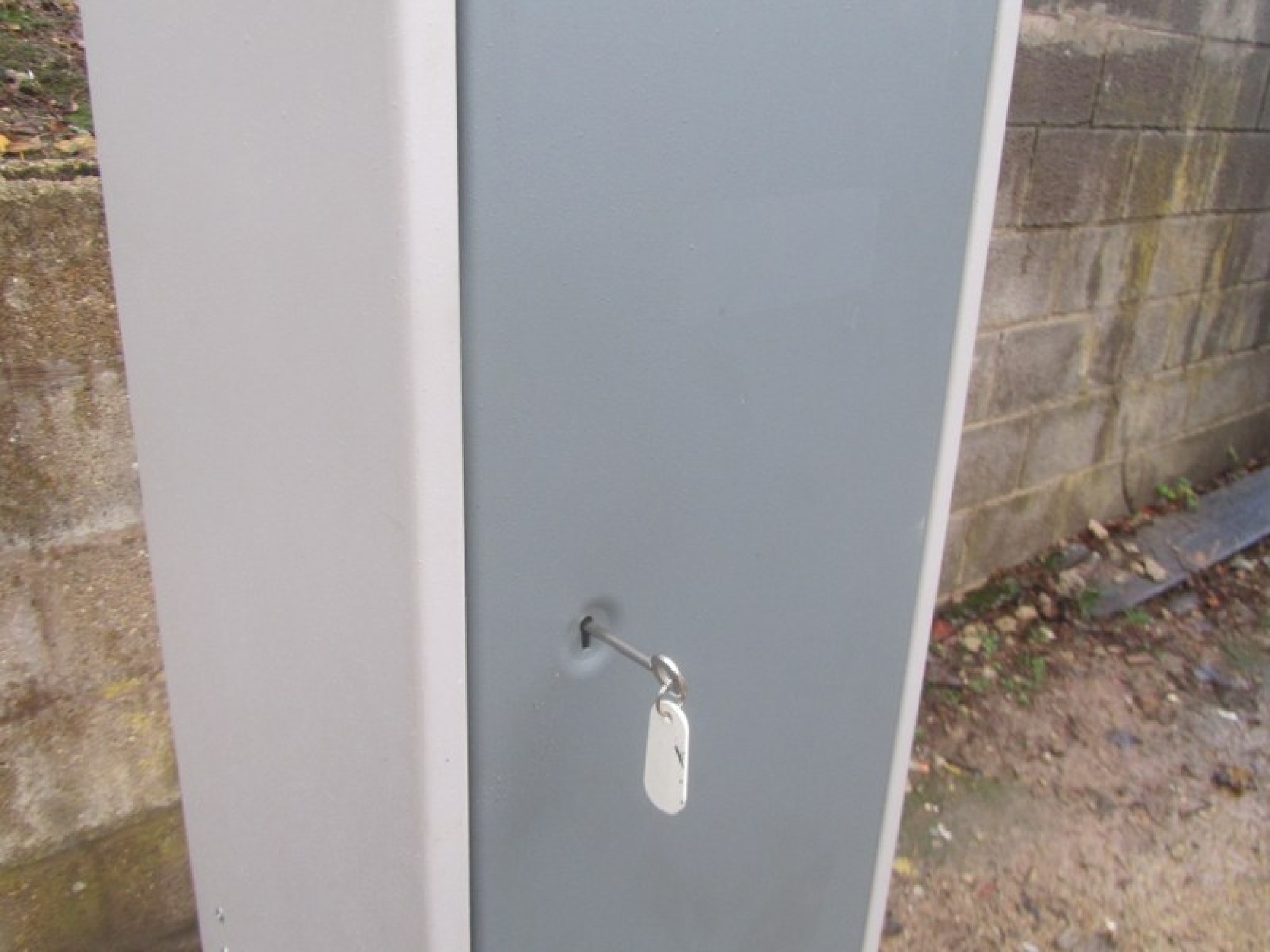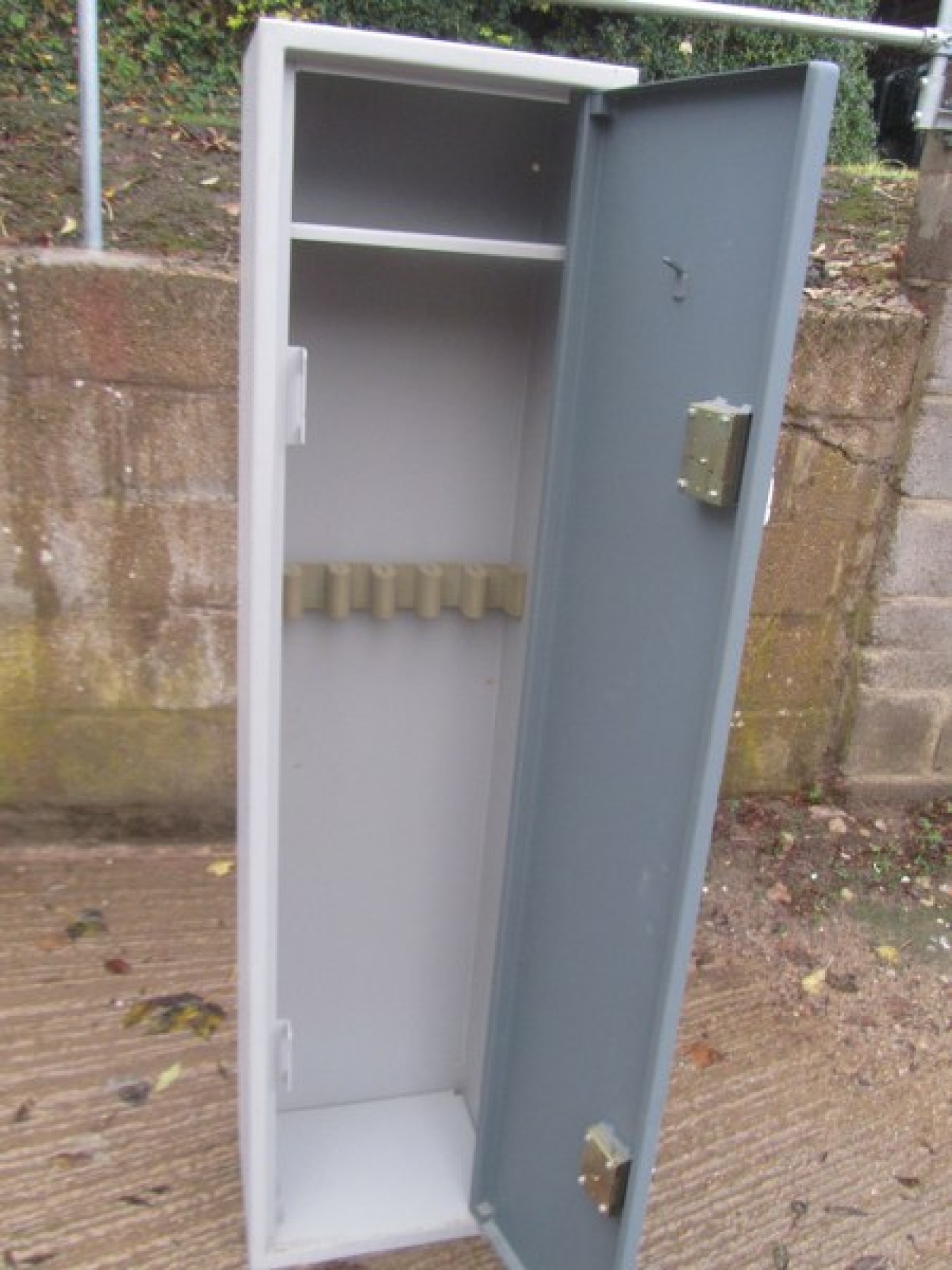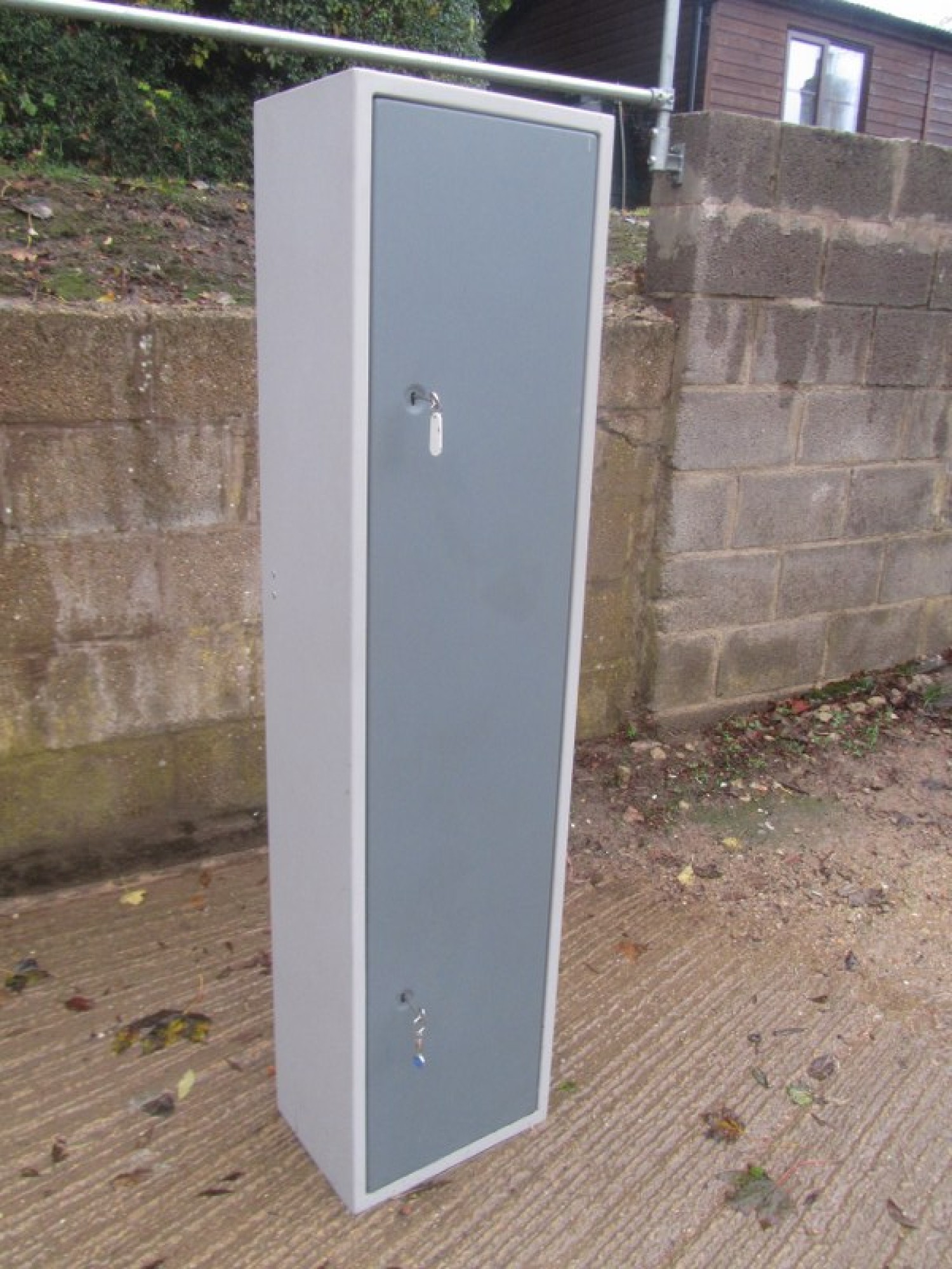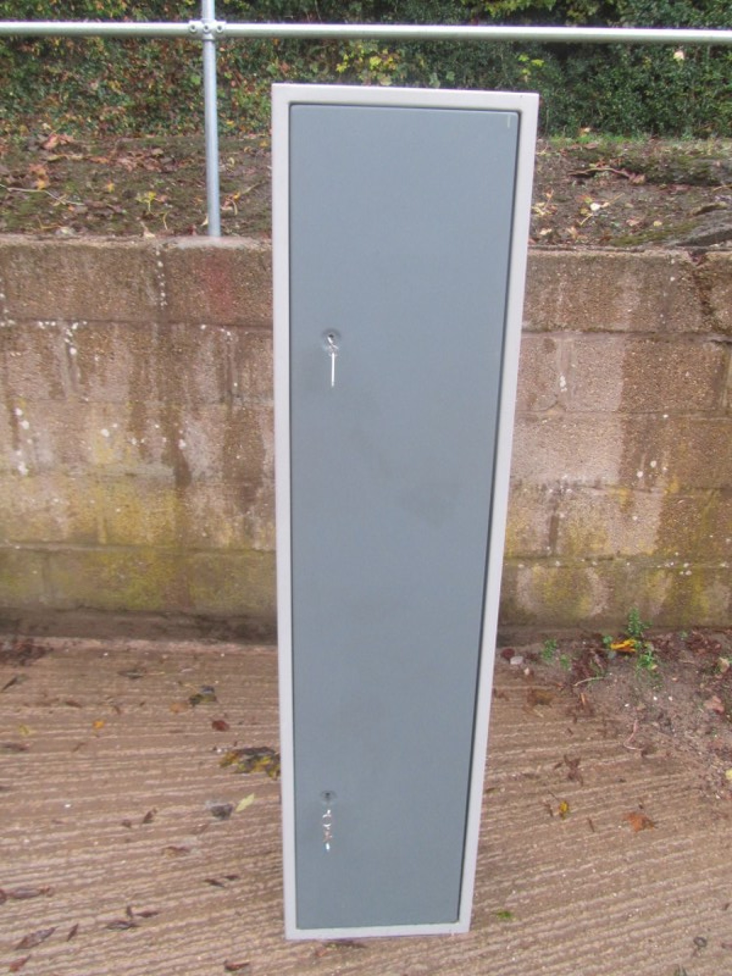 THIS IS A METAL CABINET IN A GREY FINISH. IT IS TALL, MADE TO FIT RIFLES / SHOT GUNS. IT HAS 2 MORTICE LOCKS WITH DIFFERENT KEYS. THE LOCKS WORK AND IT GIVES SAFE AND SECURE STORAGE. INSIDE IT IS BASIC, THERE IS FOAM HOLDERS. THERE ARE HOLES TO BOLT IT TO A WALL. IT IS IN GOOD CONDITION.
