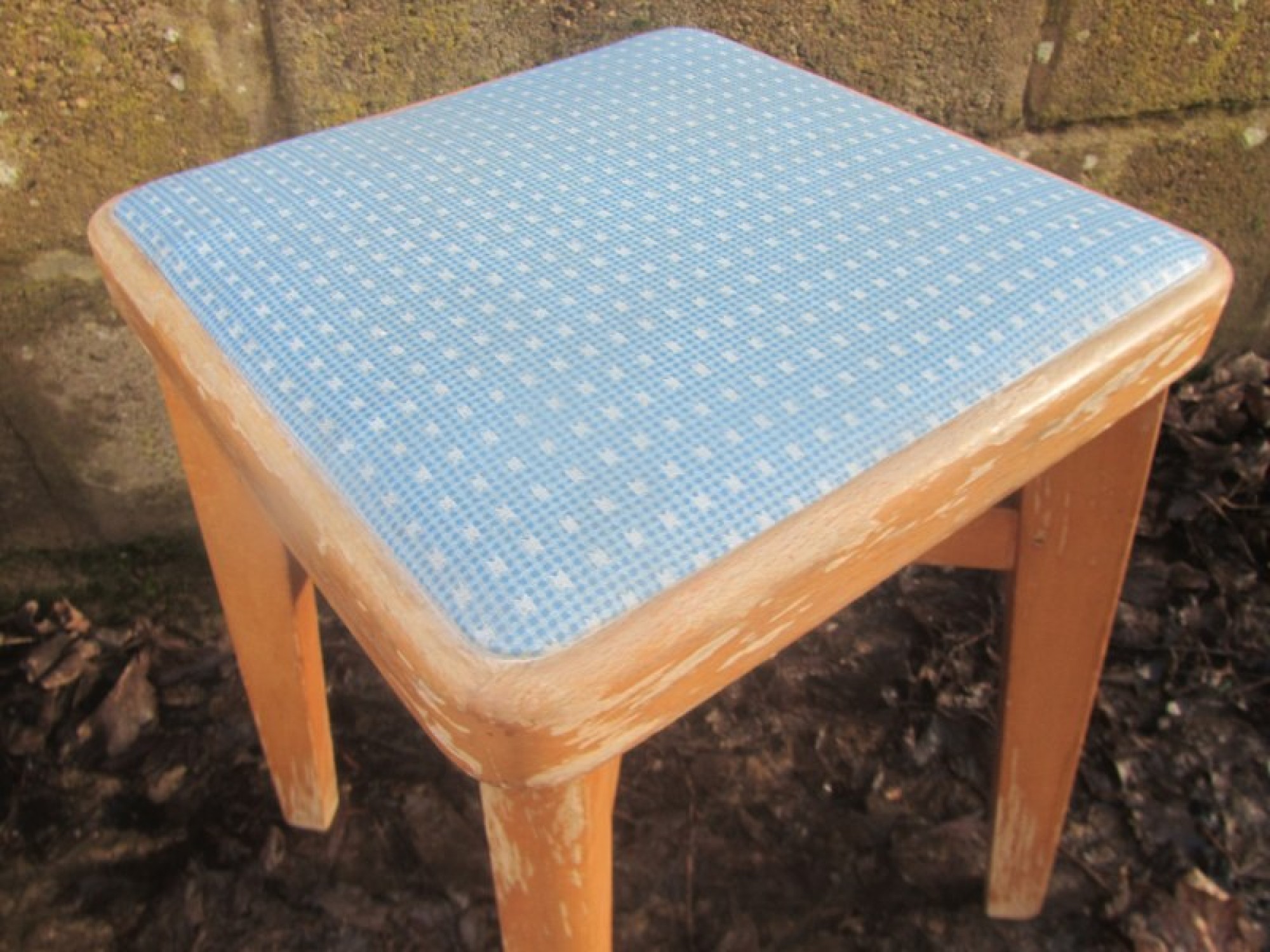 THIS IS A VINTAGE STOOL FROM THE 1960s. IT HAS A STURDY SOLID BEECH WOOD FRAME. THE TOP IS PADDED AND COVERED IN VINYL. A GOOD RETRO PIECE.