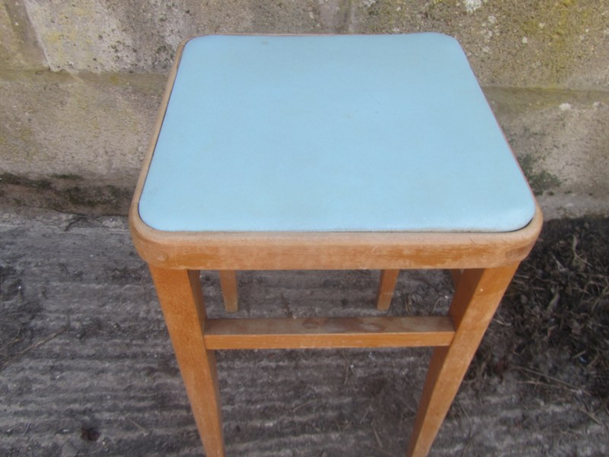THIS IS A VINTAGE STOOL FROM THE 1960s. IT HAS A STURDY SOLID BEECH WOOD FRAME. THE TOP IS PADDED AND COVERED IN VINYL. A GOOD RETRO PIECE.