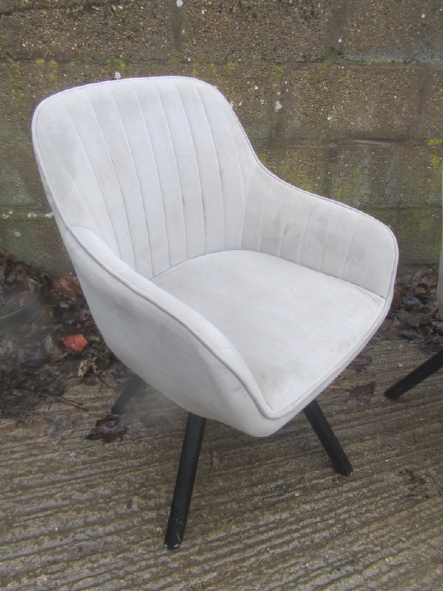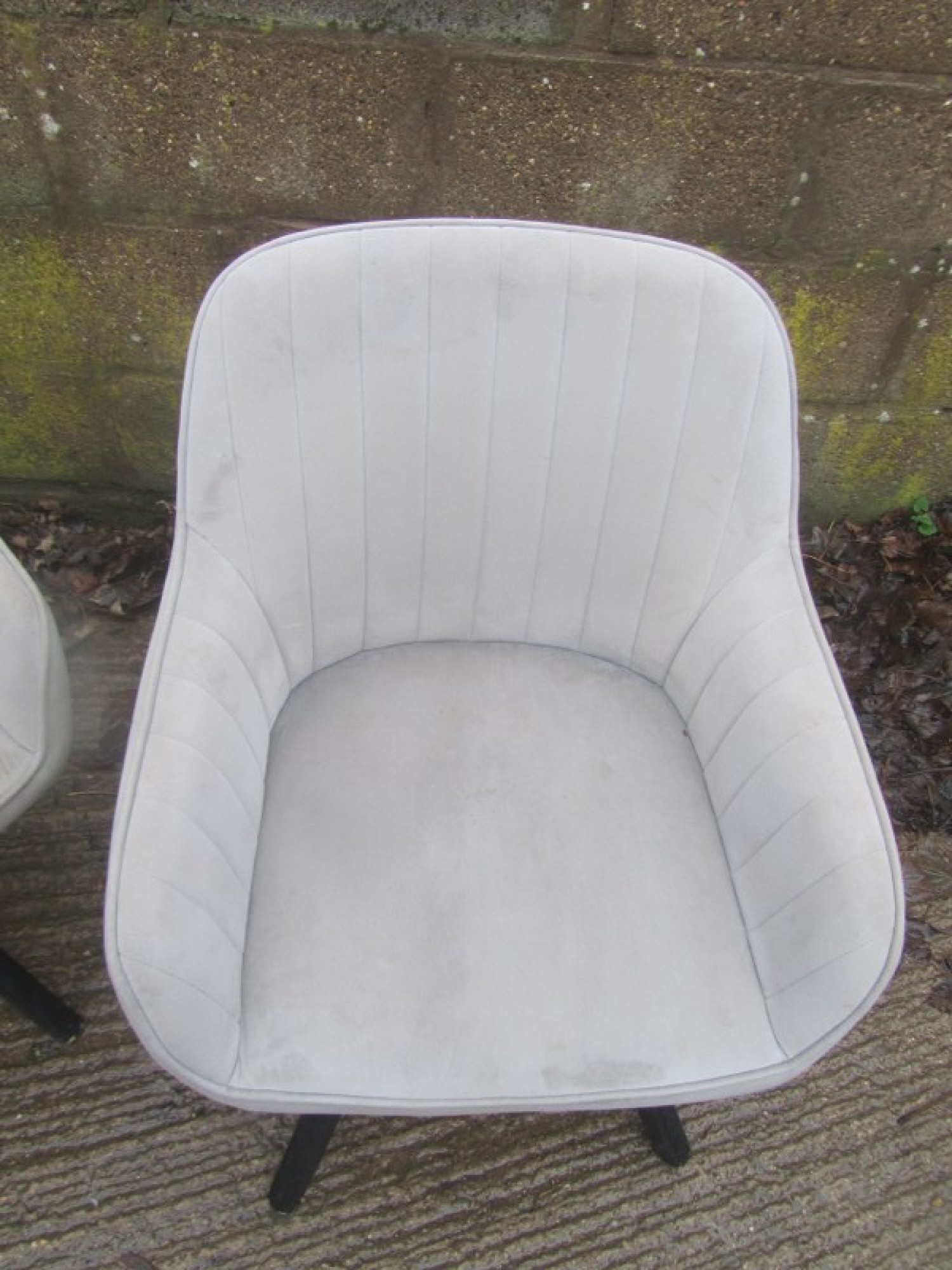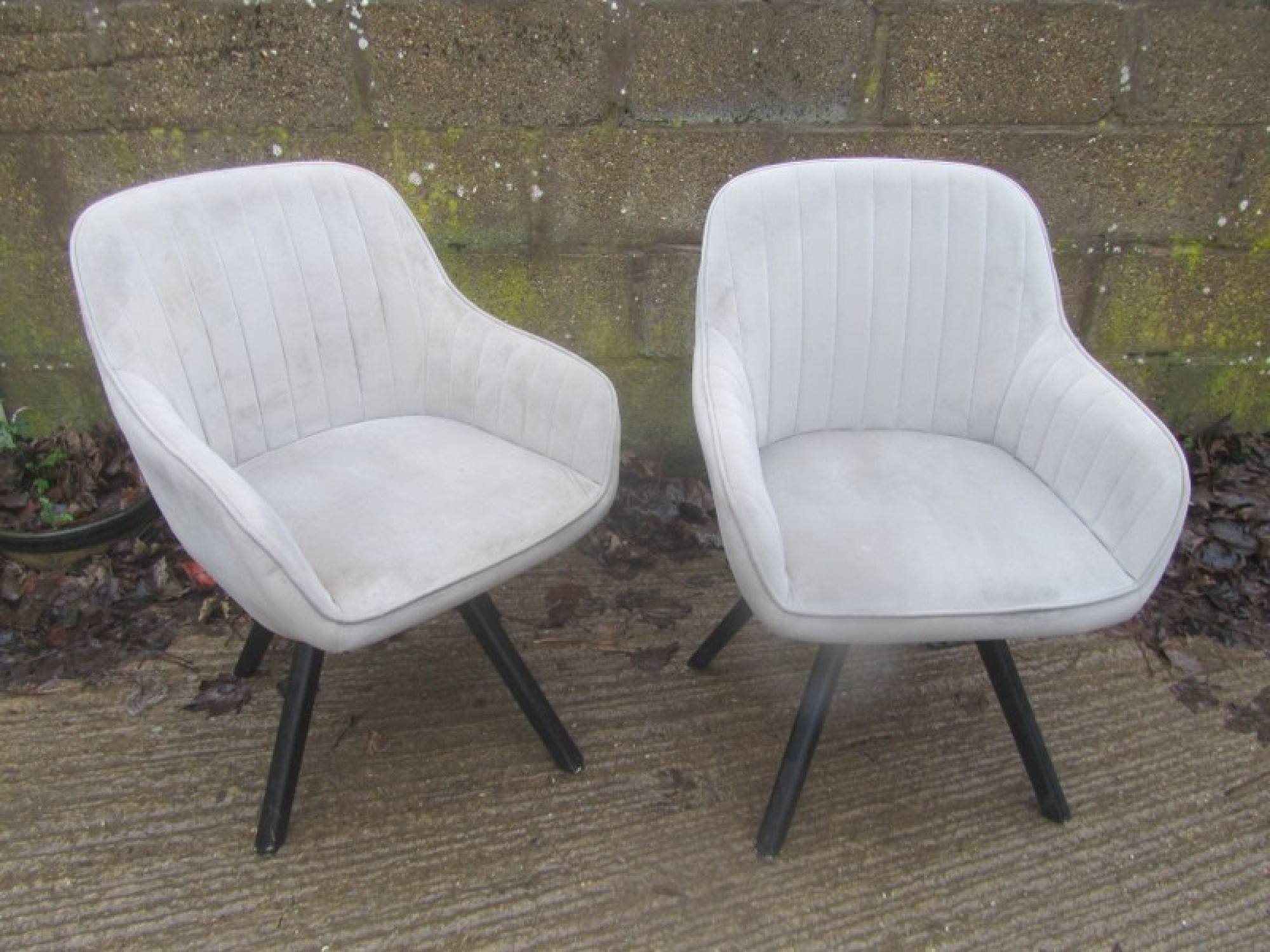 A PAIR OF DINING CHAIRS, STURDY FRAMES WITH GREY UPHOLSTERY. THEY SHOULD SWIVEL, BUT THE SWIVEL MECHANISM IS WORN AND IT CATCHES. SEAT HEIGHT IS 42cm. BASIC CHAIRS.