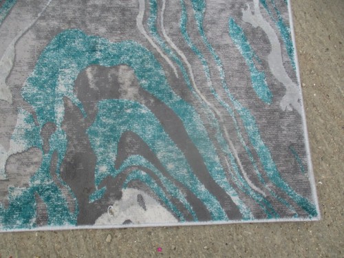 A MODERN RECTANGULAR GREY & TURQUOISE RUG. SOME LIGHT MARKS IN THE MIDDLE.