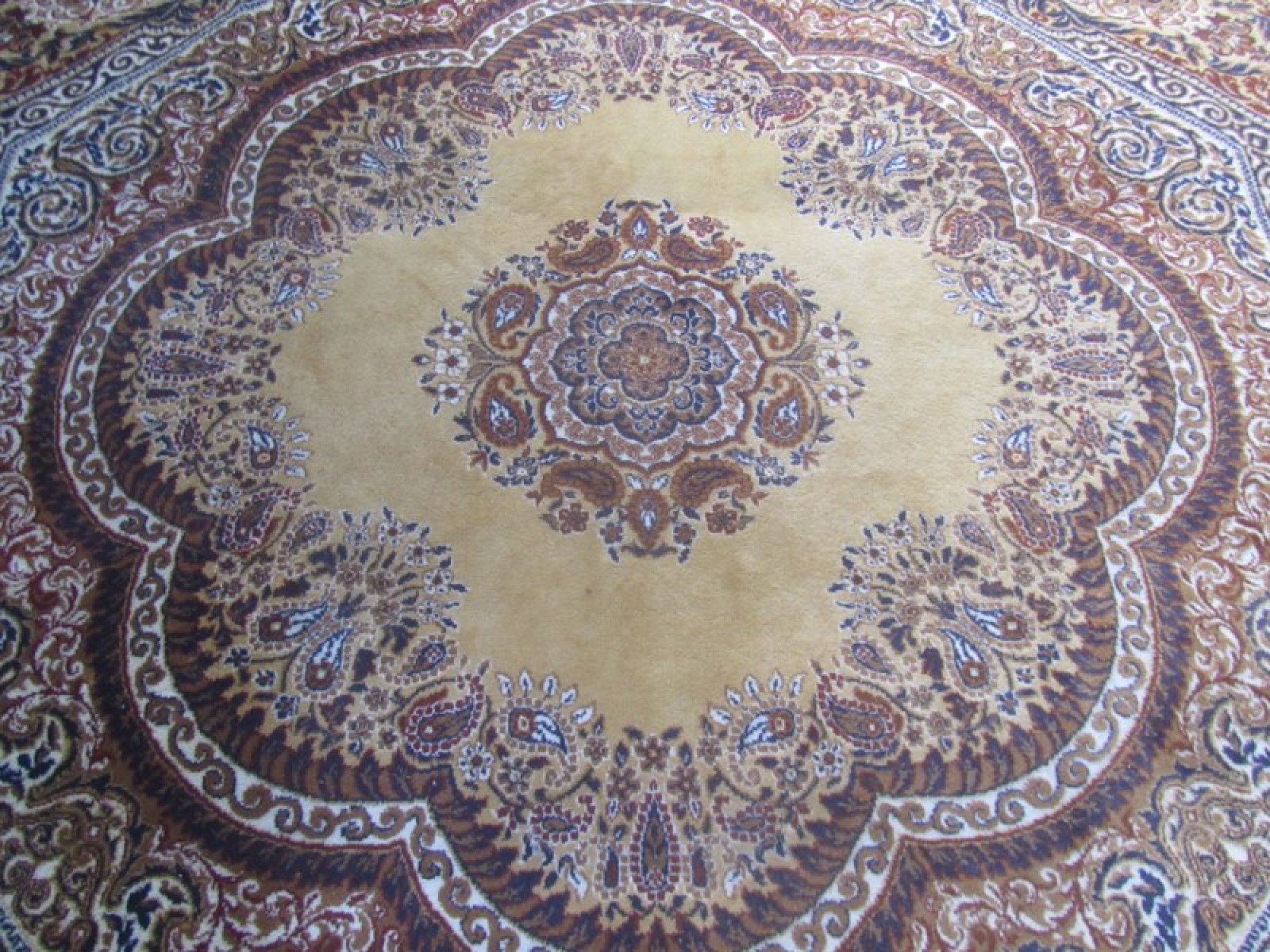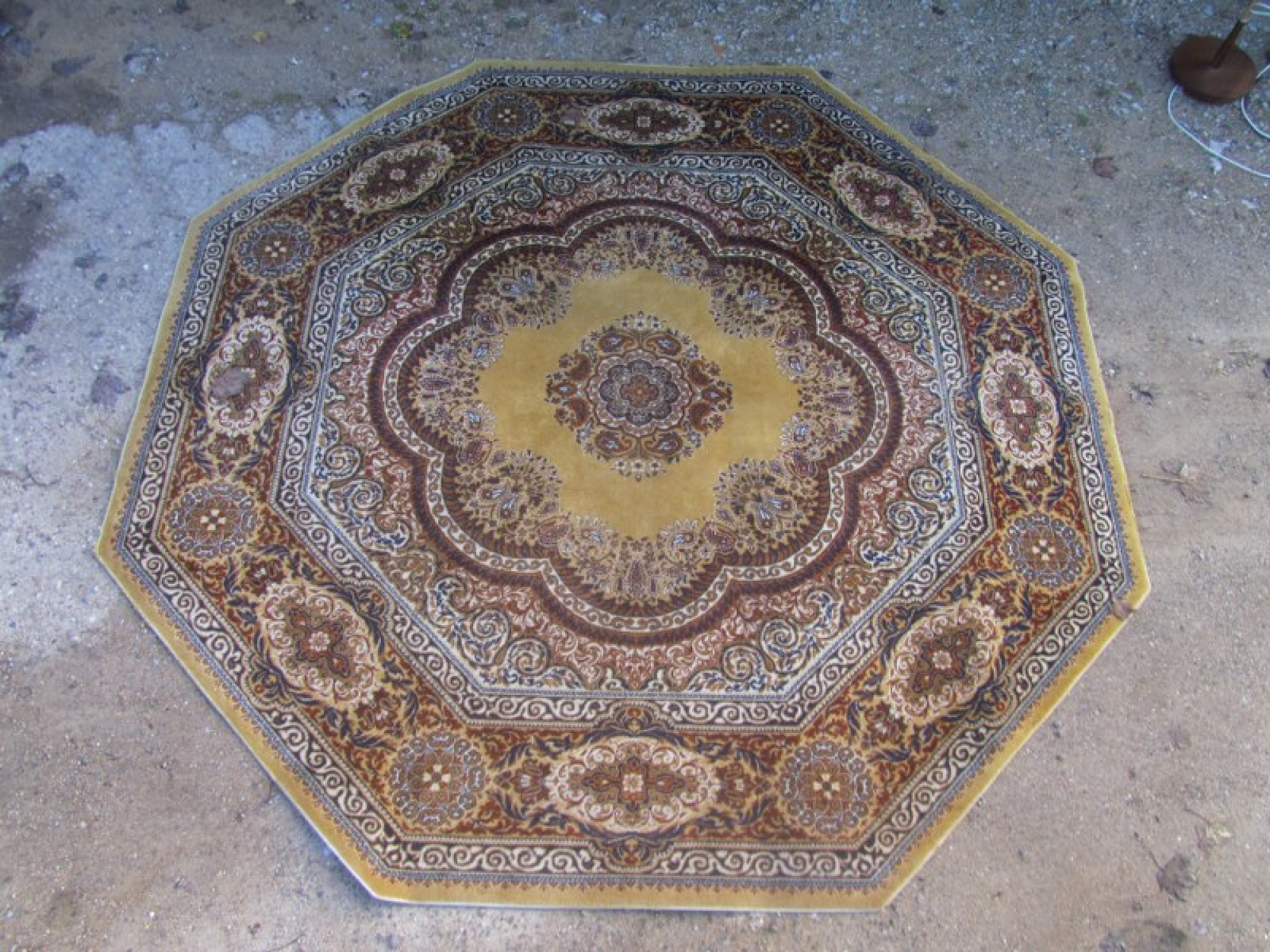 A LARGE OCTAGONAL RUG, IT HAS A TRADITIONAL PATTERN, A GOOD QUALITY WOVEN WOOL RUG. SOME LIGHT WEAR.