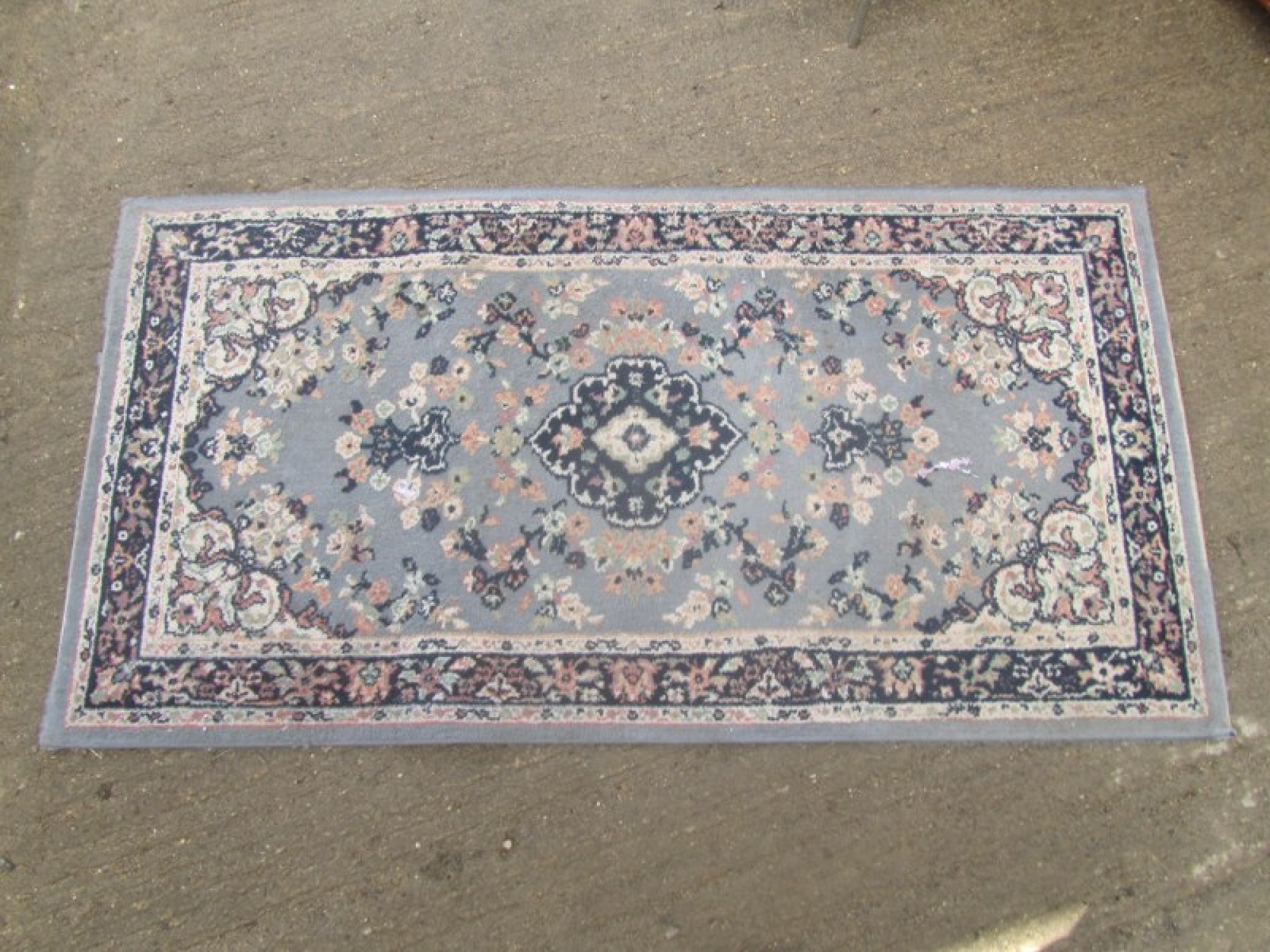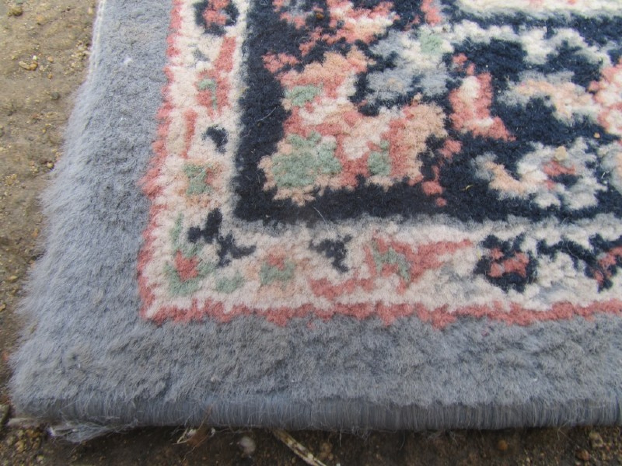 A RECTANGULAR RUG, IT HAS A TRADITIONAL PATTERN, A GOOD QUALITY RUG. SOME LIGHT WEAR AND MARKS.