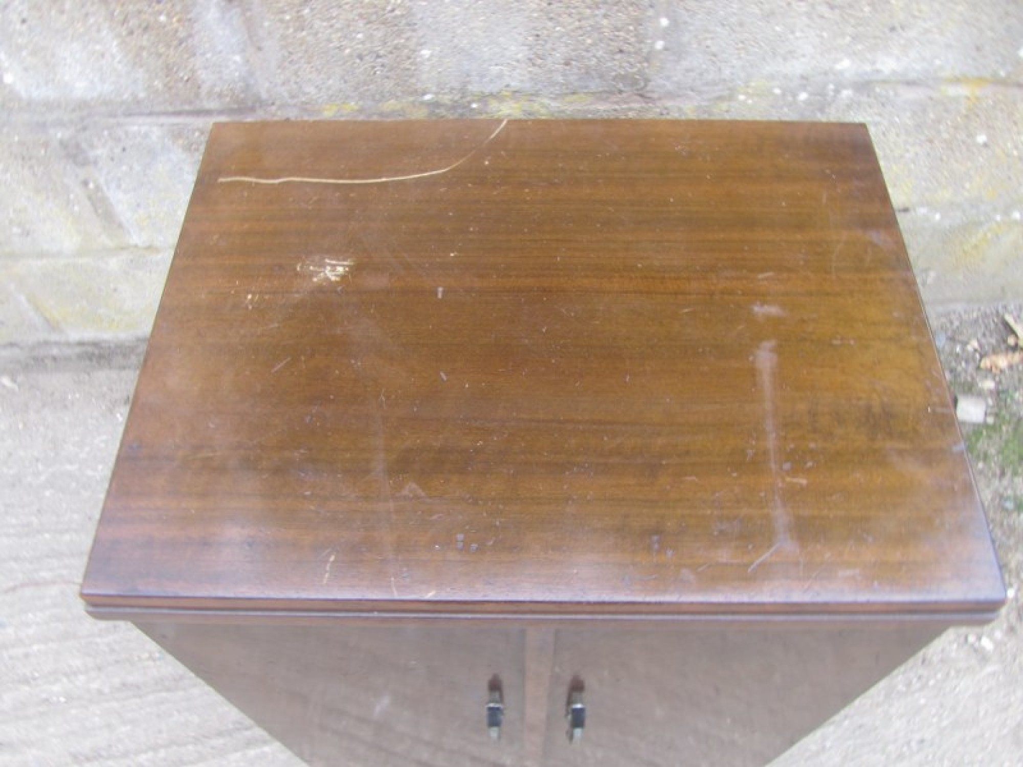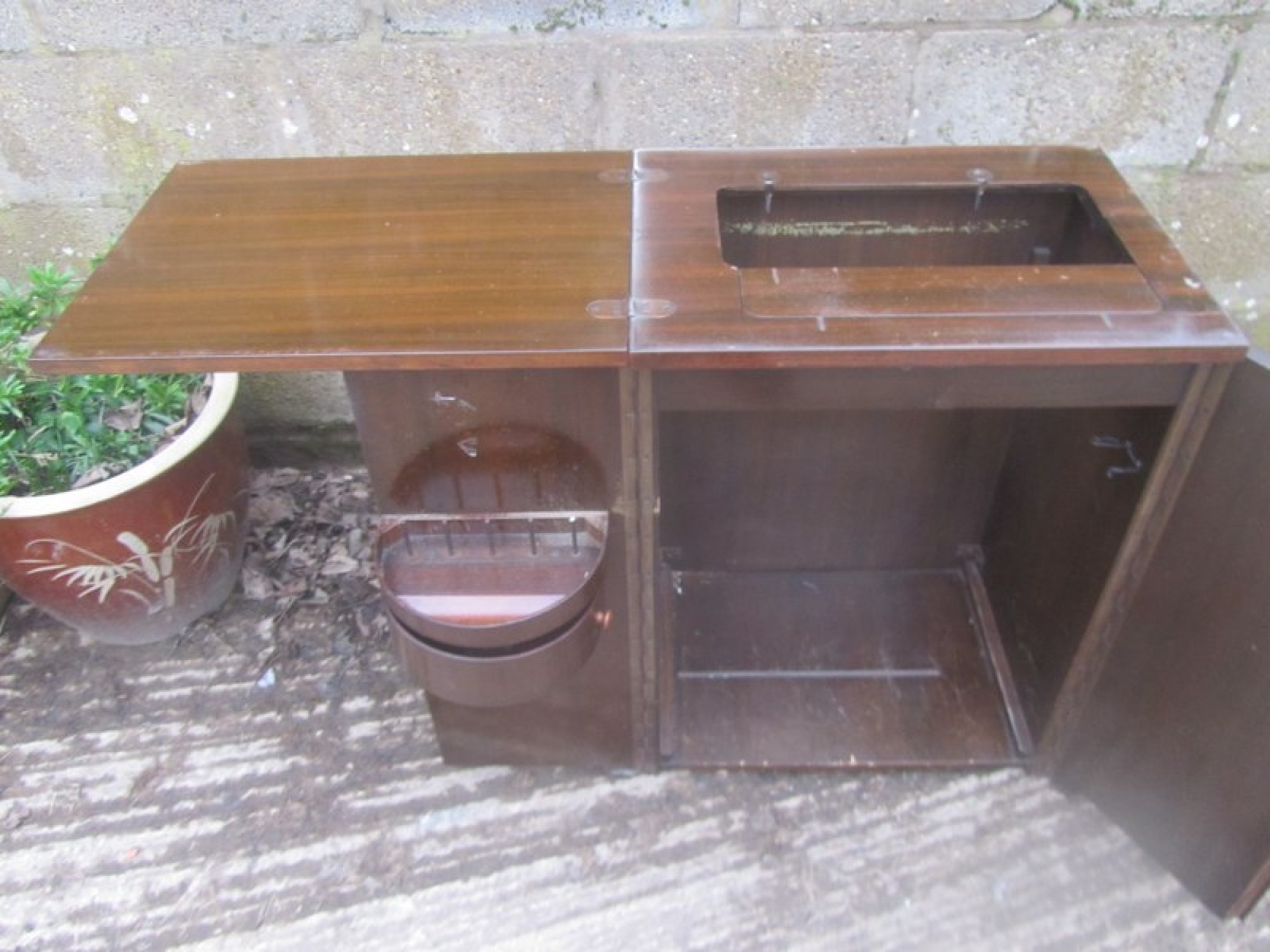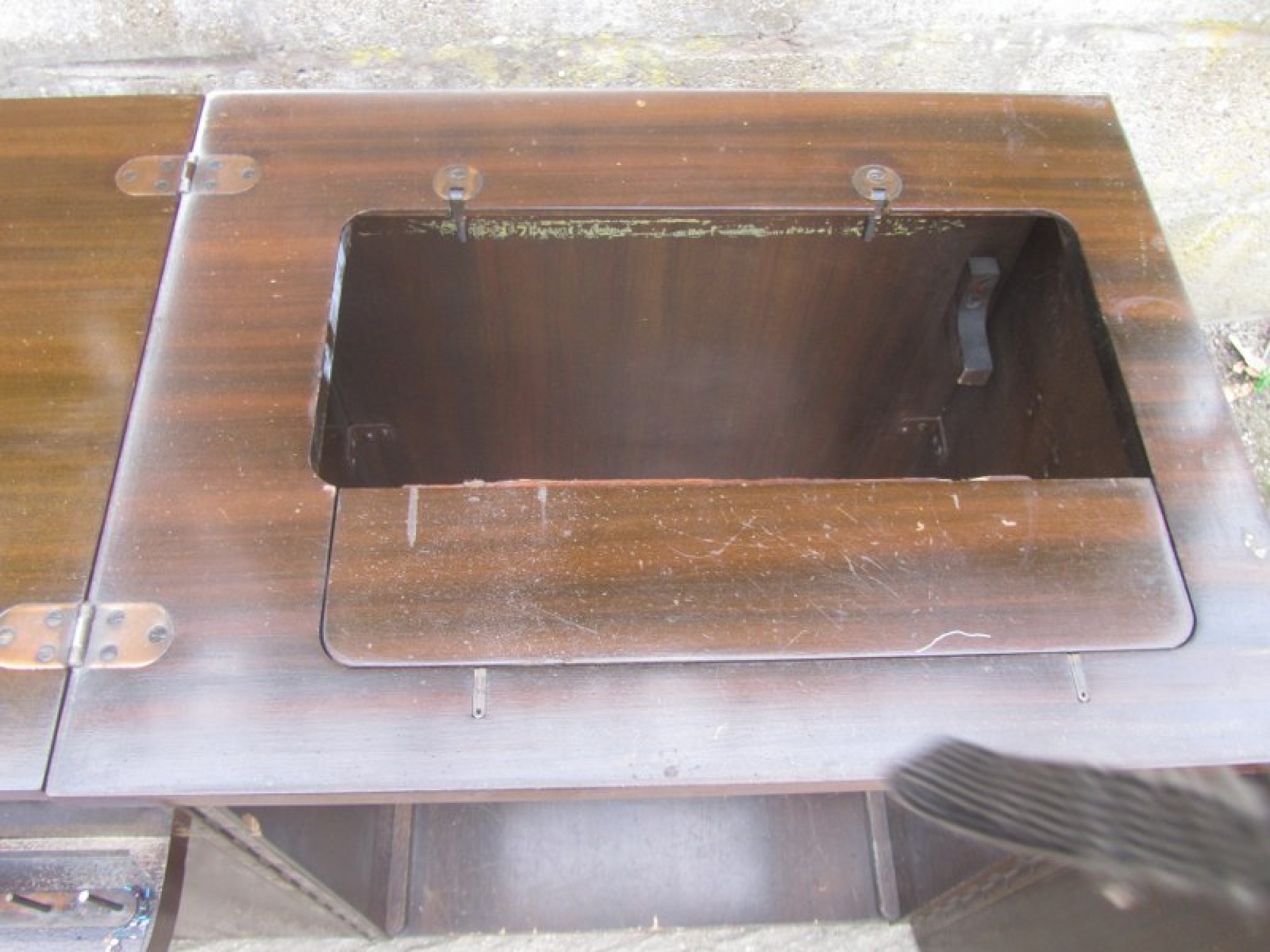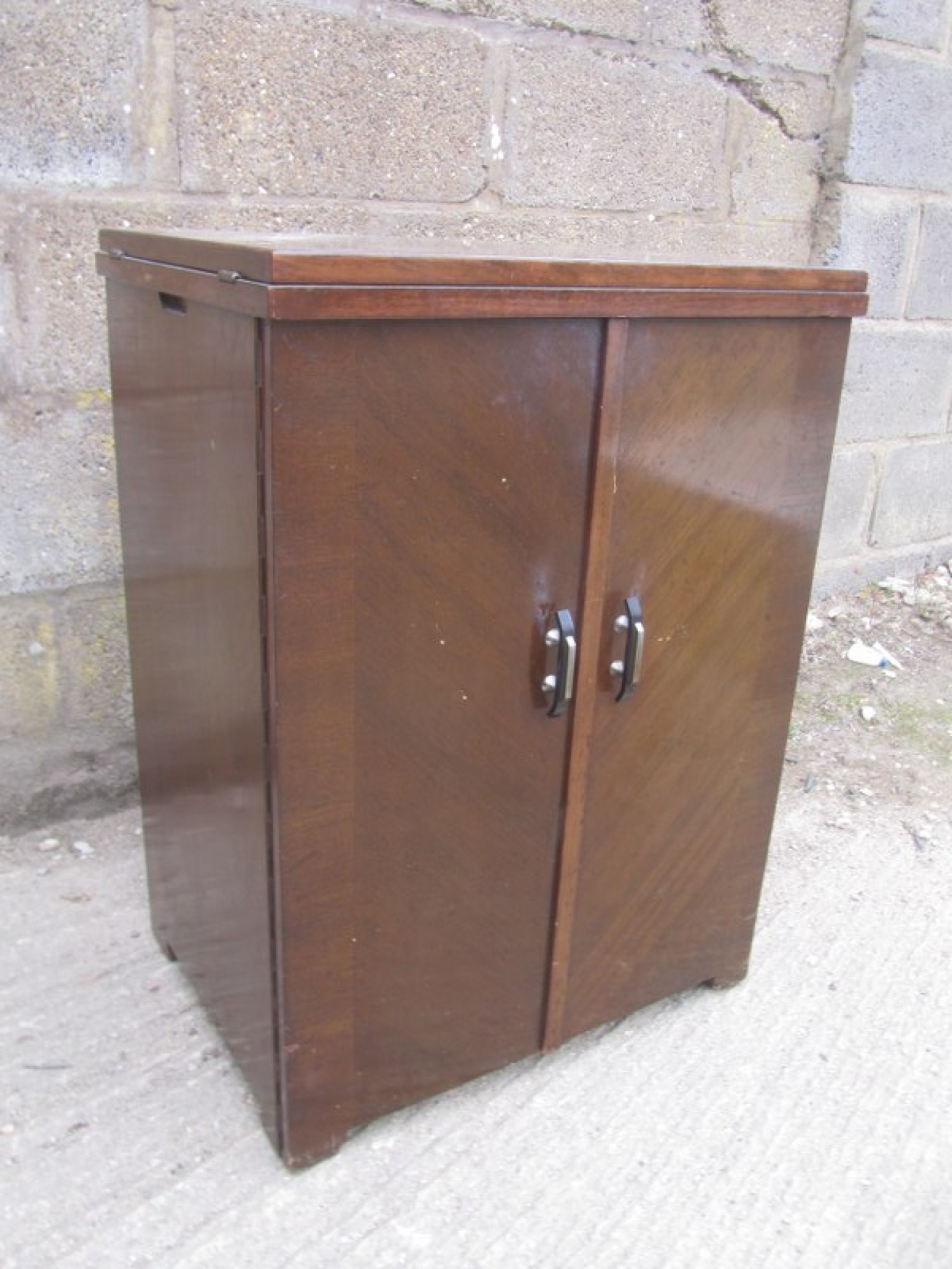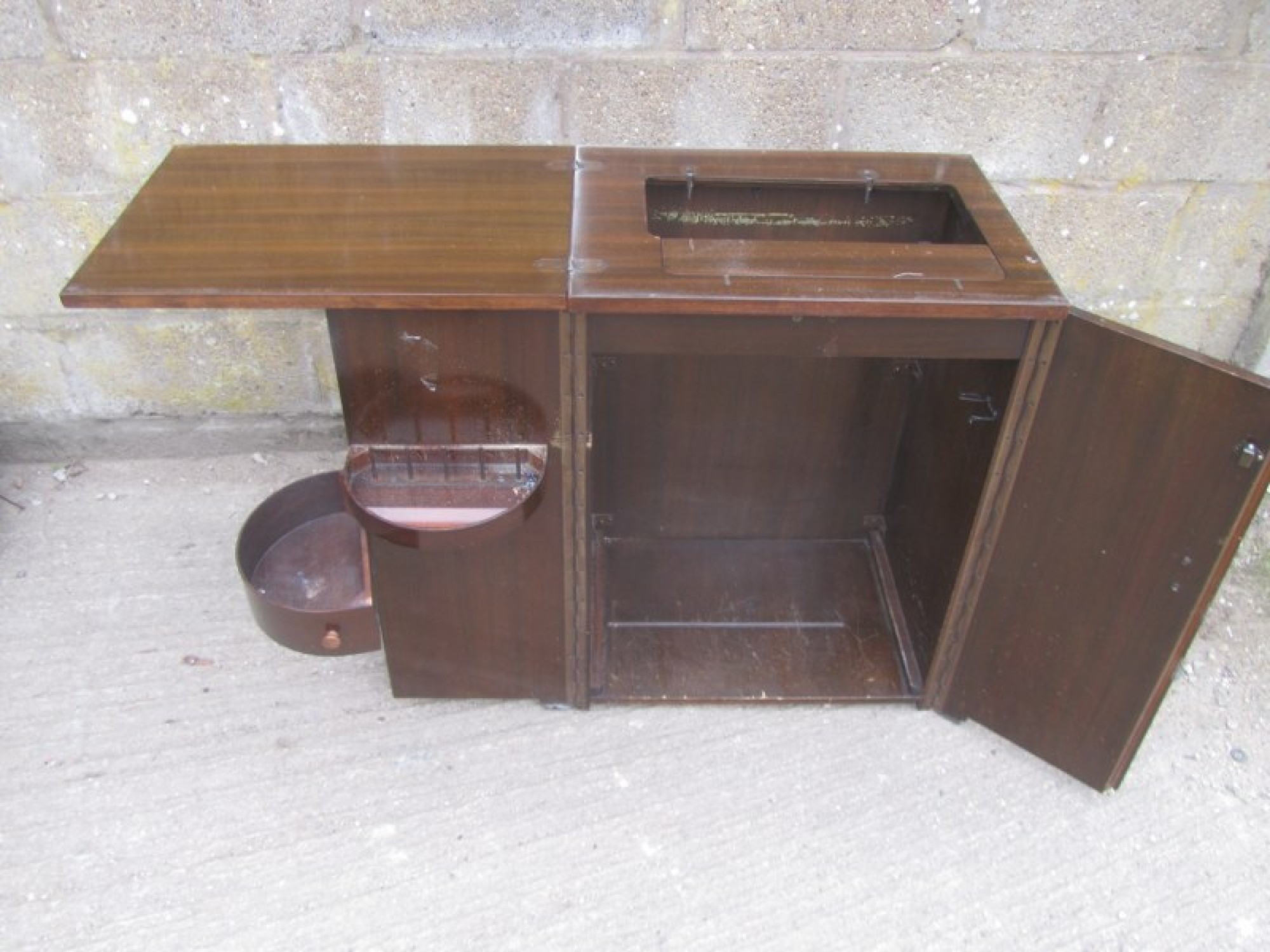 A VINTAGE CABINET IN A WALNUT VENEER. THE TOP OPENS UP, THERE IS NOT A MACHINE INSIDE. THE TABLE TOP OPENS RIGHT UP AND RESTS ON THE DOOR.