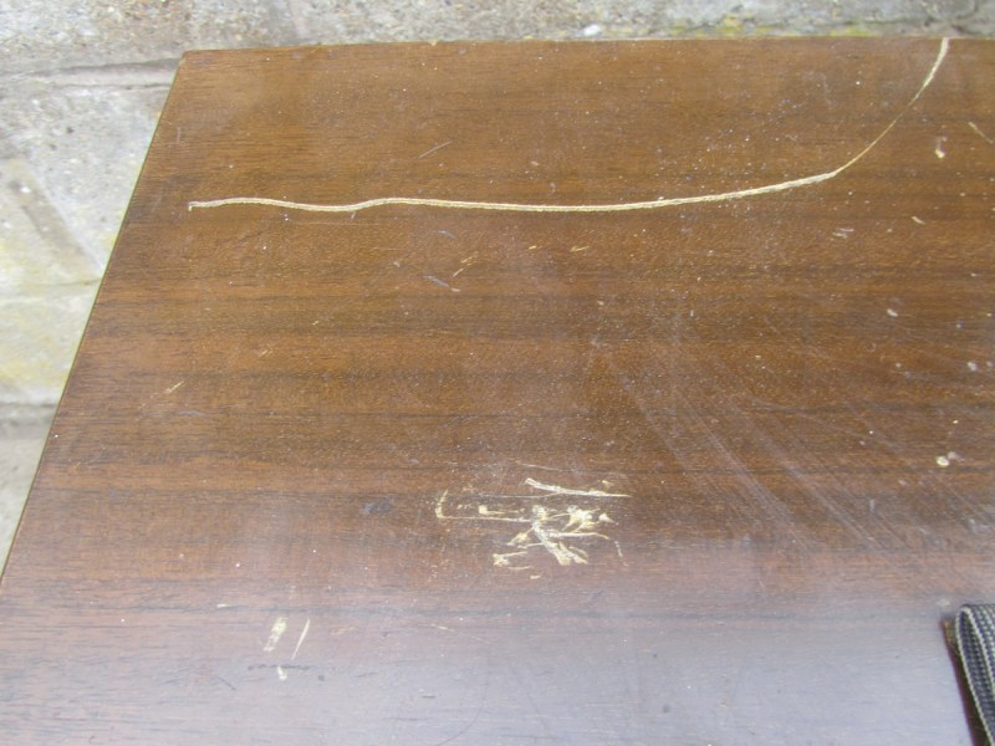 SCRATCHED ON THE TOP. IT IS IN AVERAGE CONDITION, SOME SCUFFS AND WEAR.