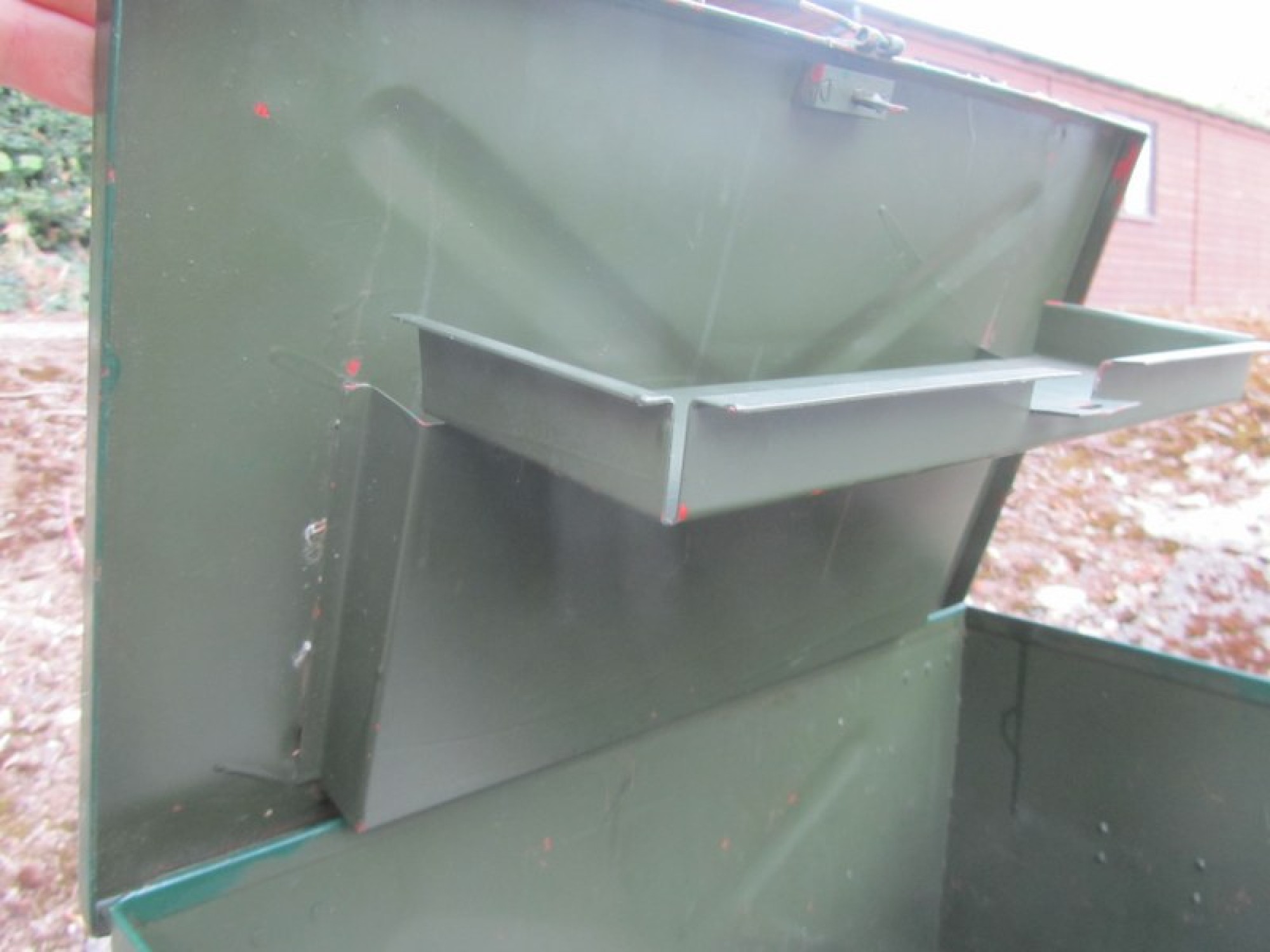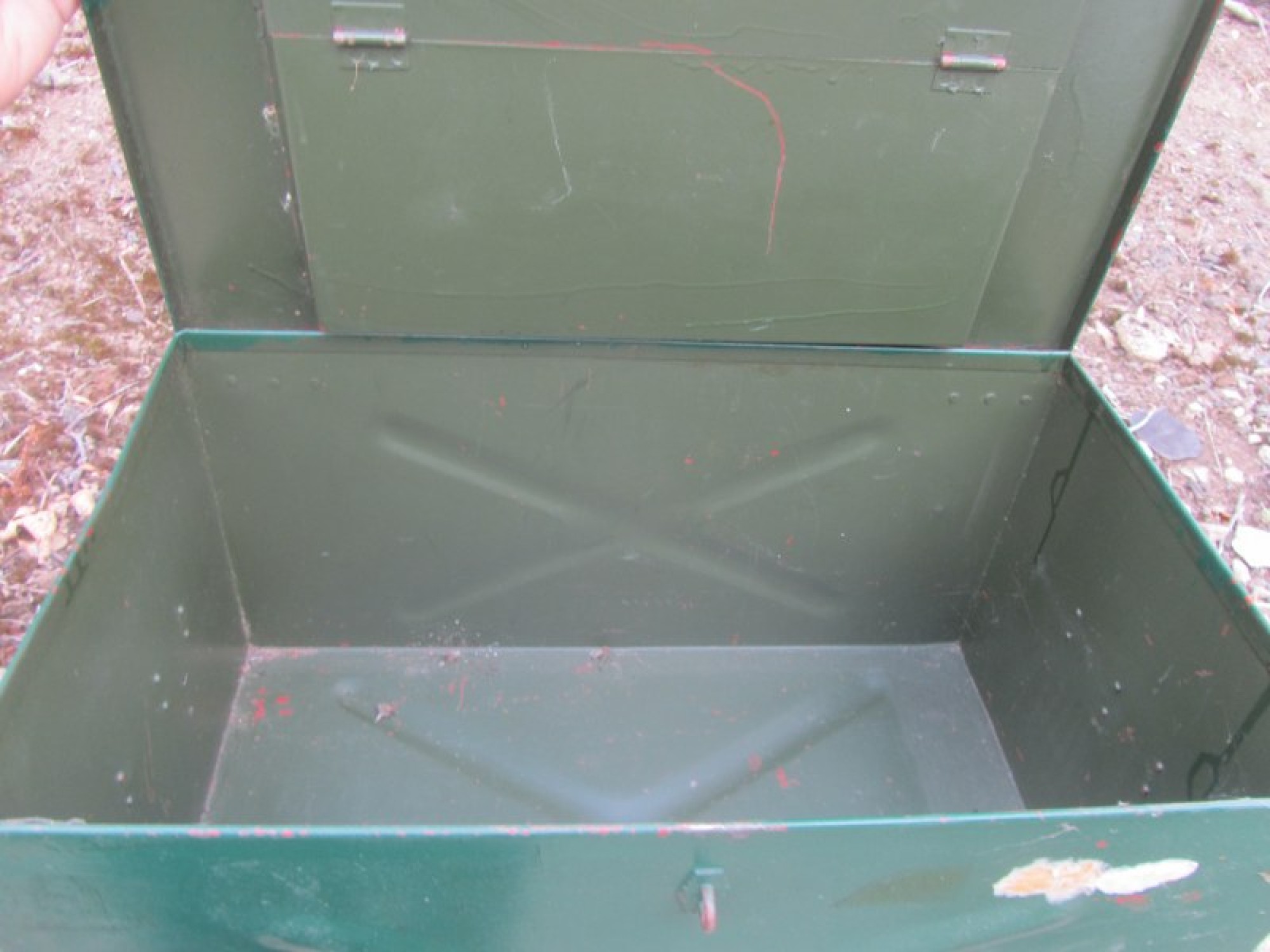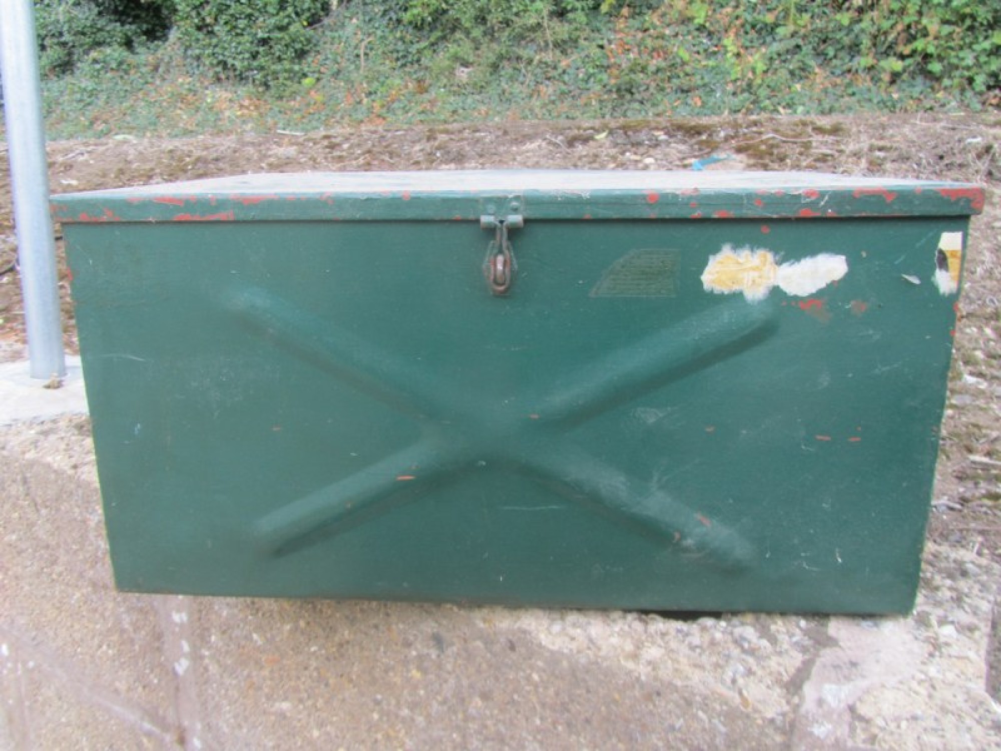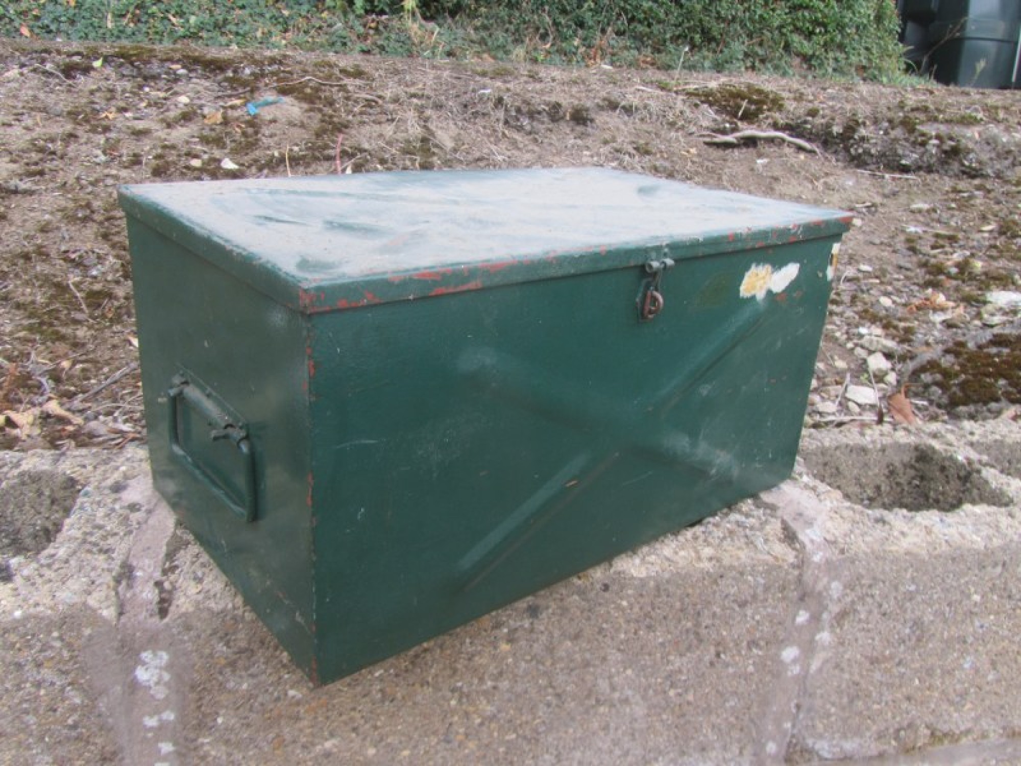 A SMALL METAL TRUNK WITH METAL HANDLE. PROBABLY FOR MILITARY USE, SMALL METAL CATCH.
