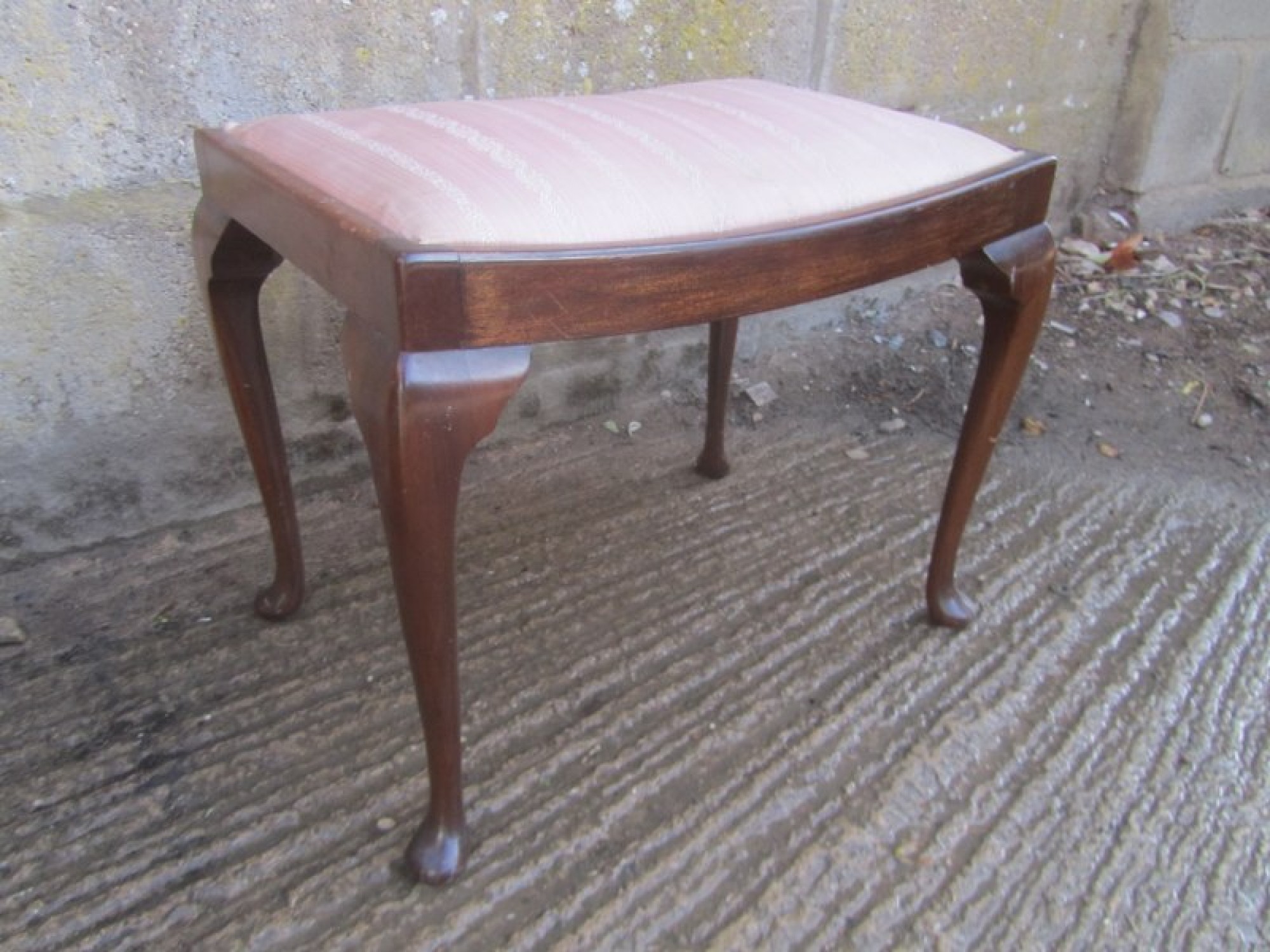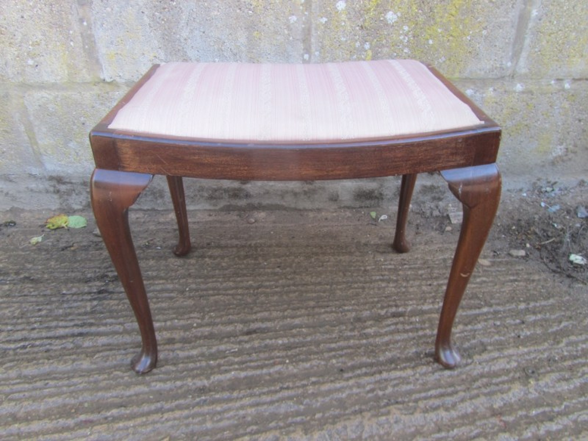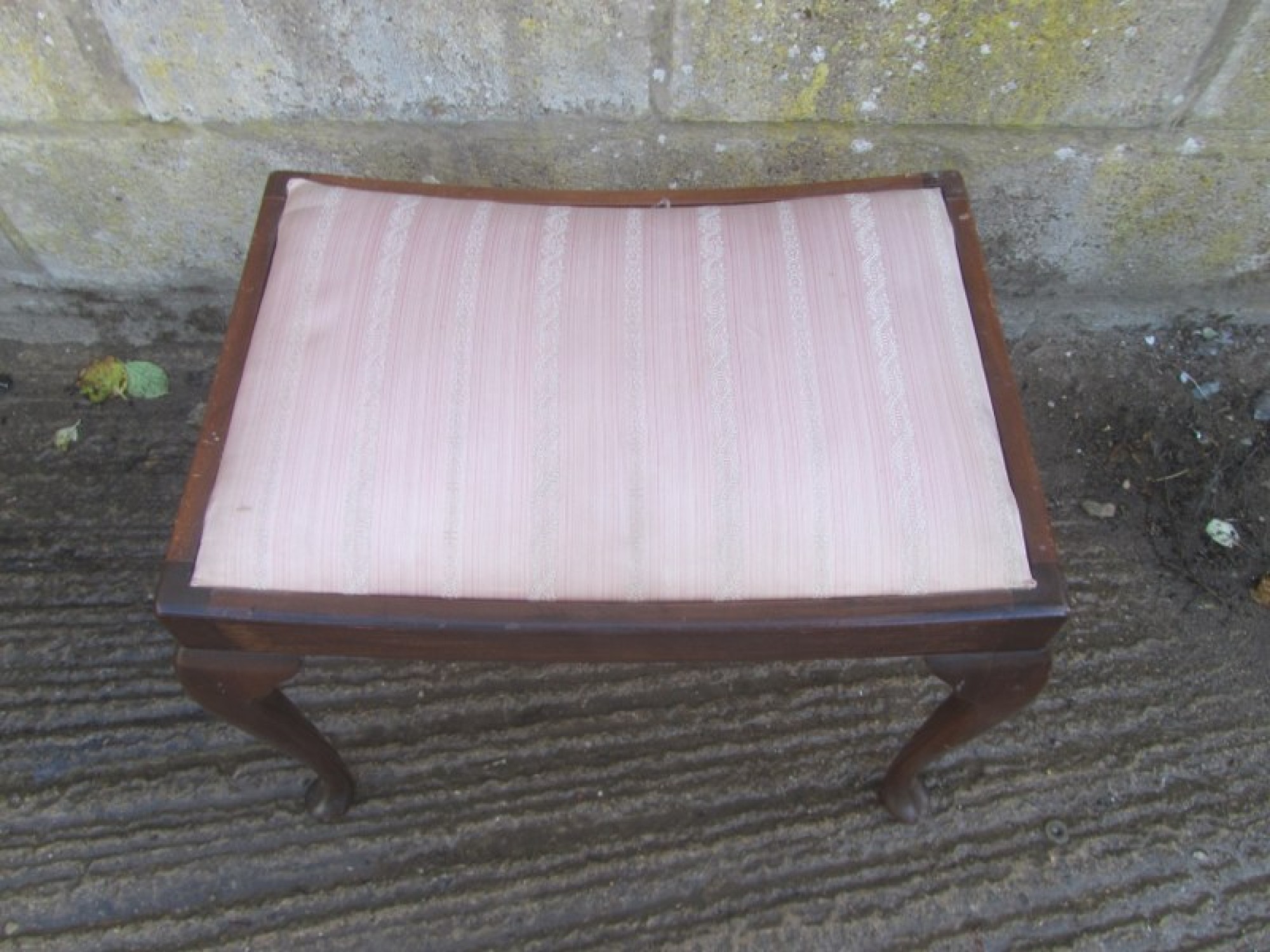 THIS IS A DRESSING TABLE STOOL, WITH A PADDED SEAT. MADE TO GO WITH A DRESSING TABLE OR AS A PIANO STOOL, MINOR WEAR AND TEAR, THE FRAME IS STURDY. MATERIAL IS GOOD