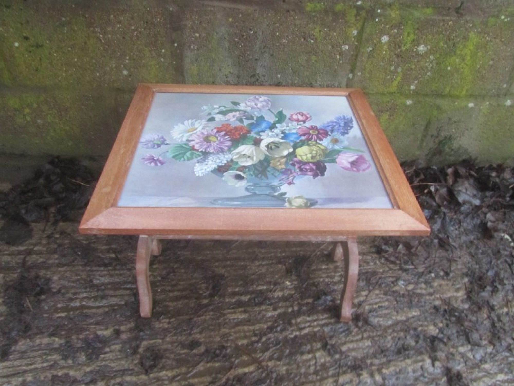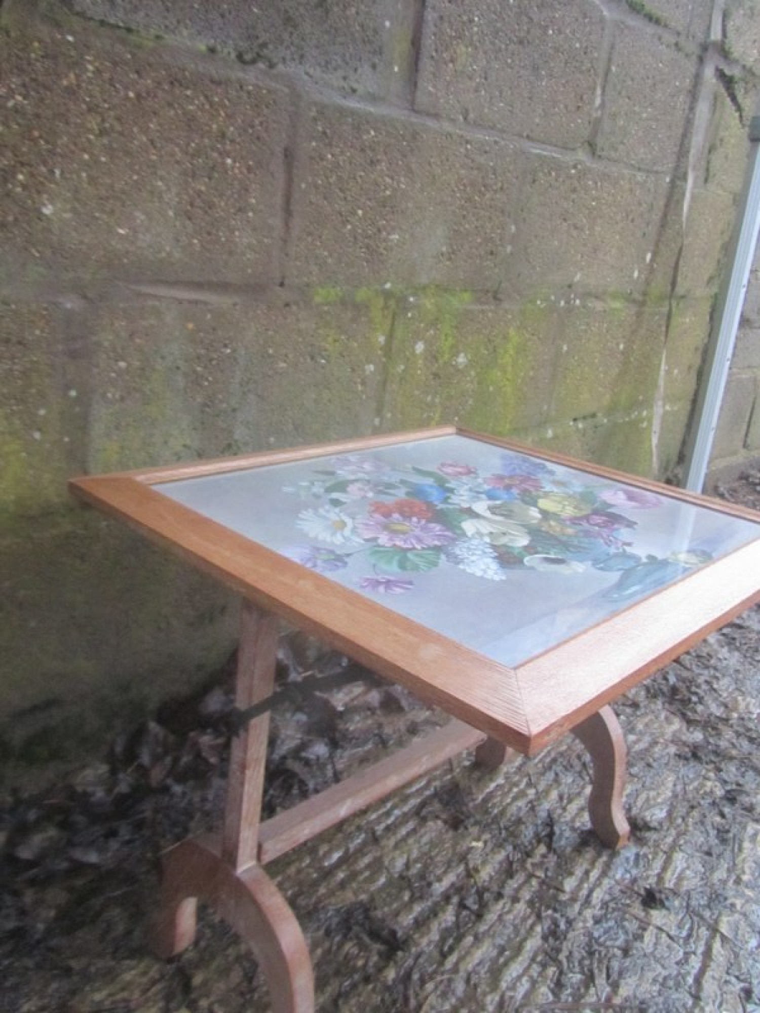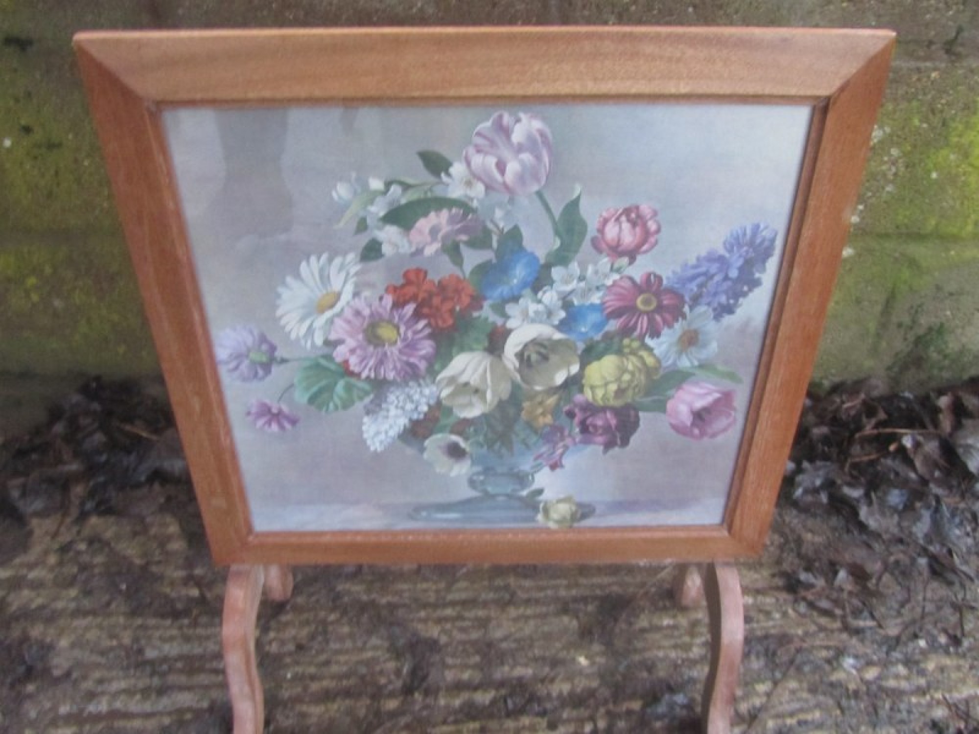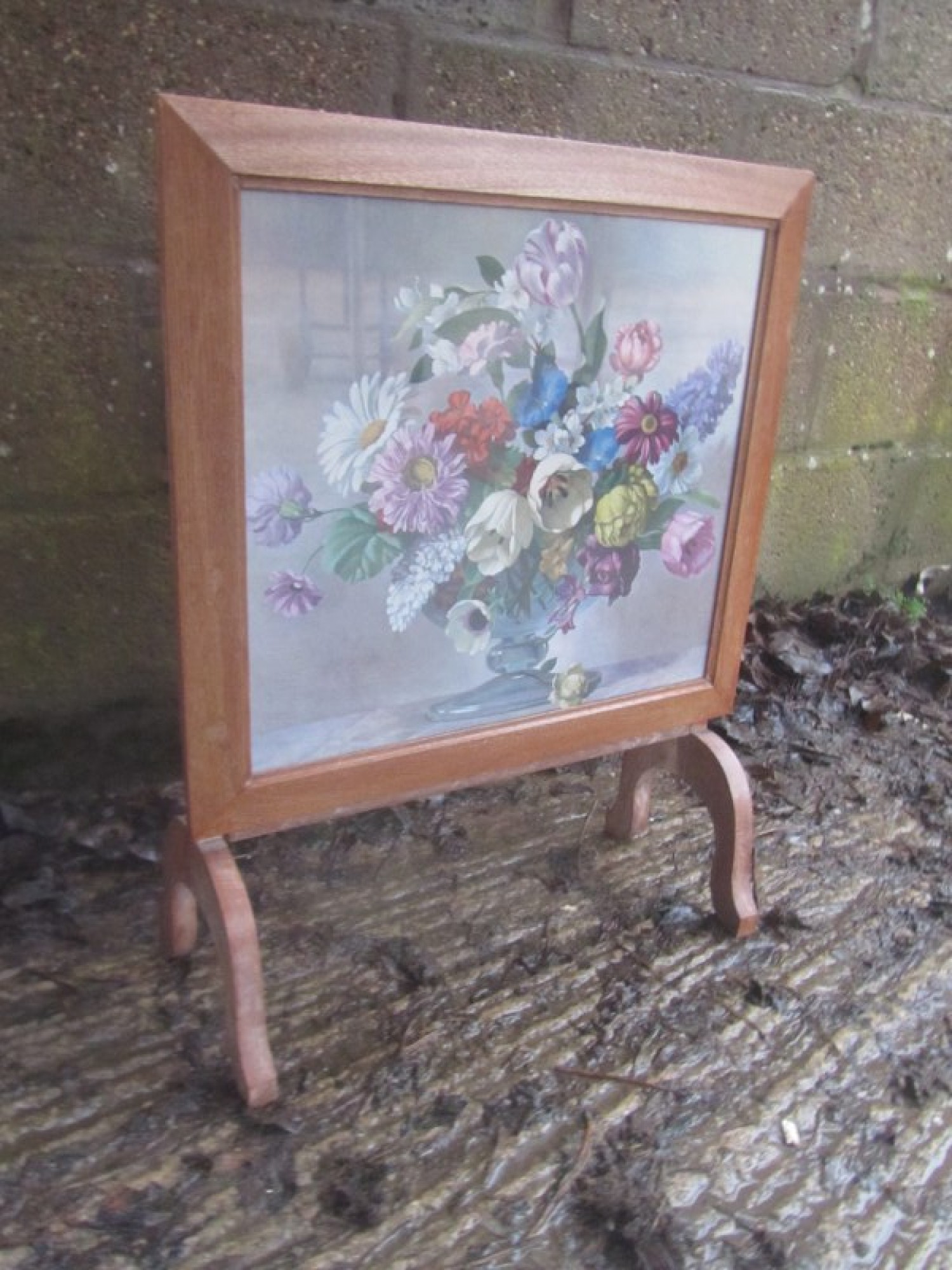 A WOODEN FRAMED SCREEN WITH AN EMBROIDERED PICTURE UNDER THE GLASS, EASY TO REPLACE IF ITS NOT TO YOUR LIKING. THE SCREEN TILTS OVER TO TURN IT INTO A USEFUL TABLE. A PRACTICAL PIECE OF FURNITURE. THIS IS NOT TO BE USED NEAR A LIT FIRE.