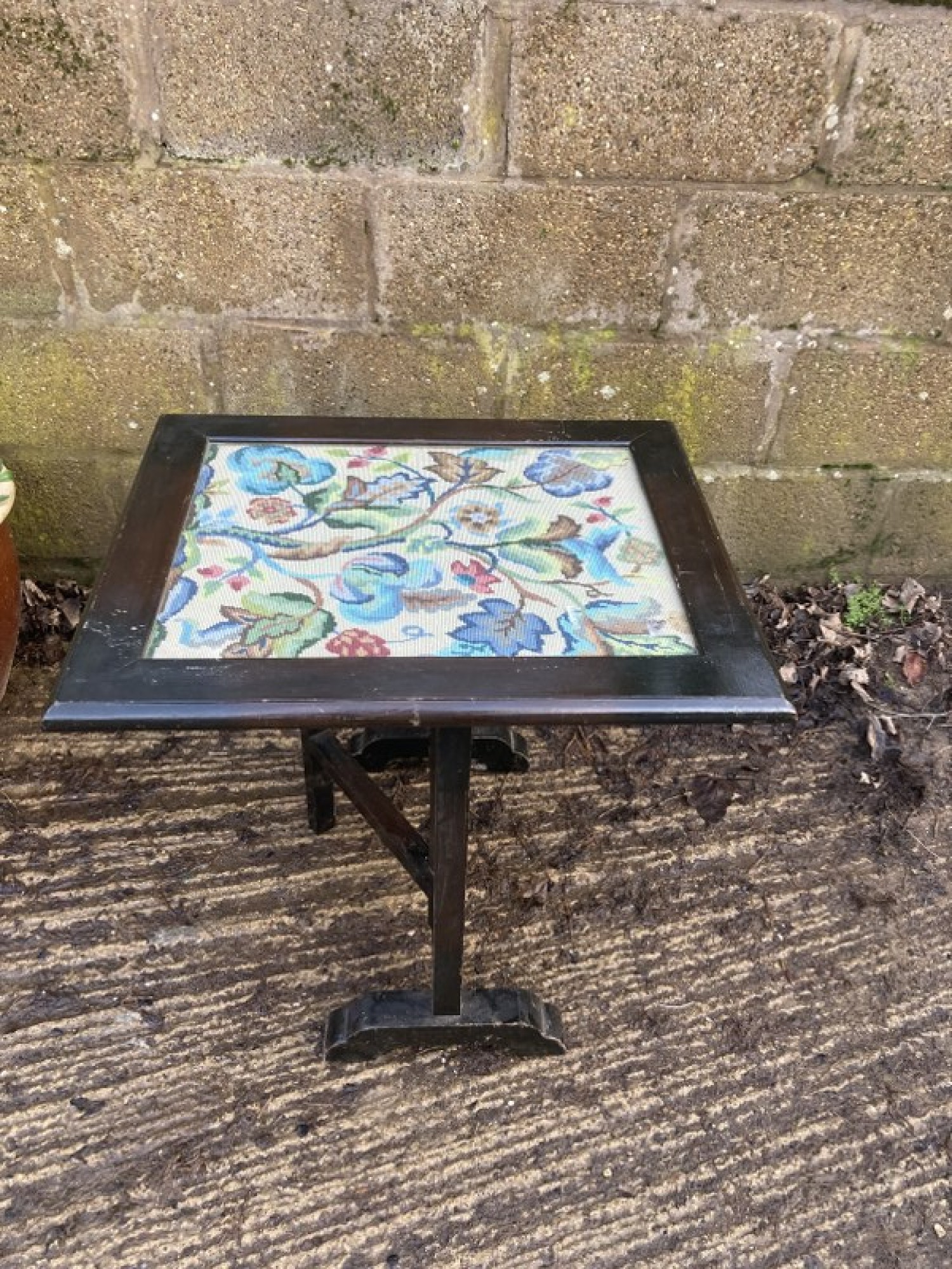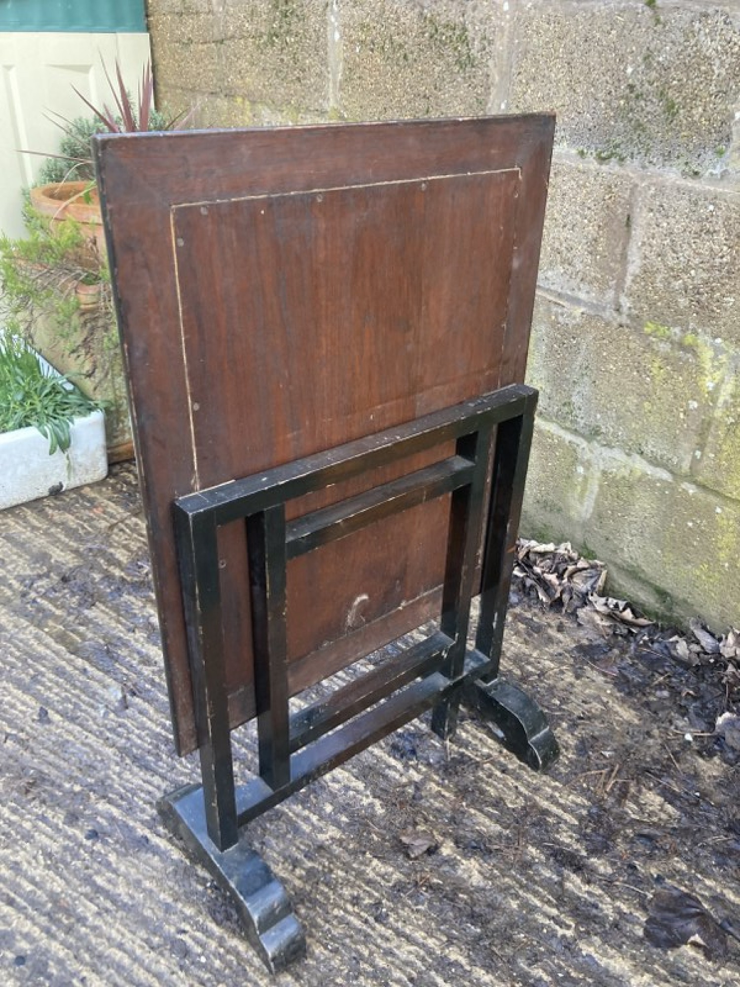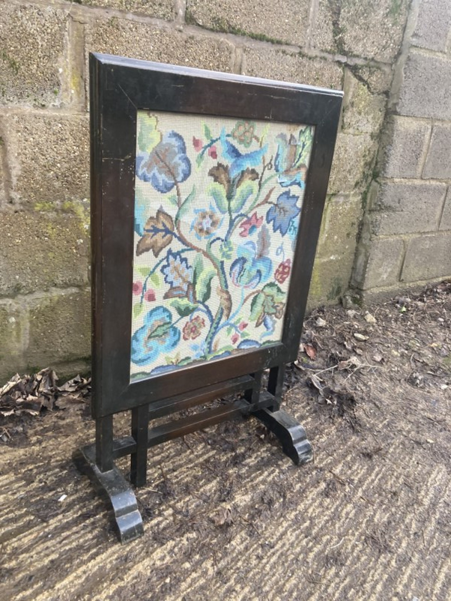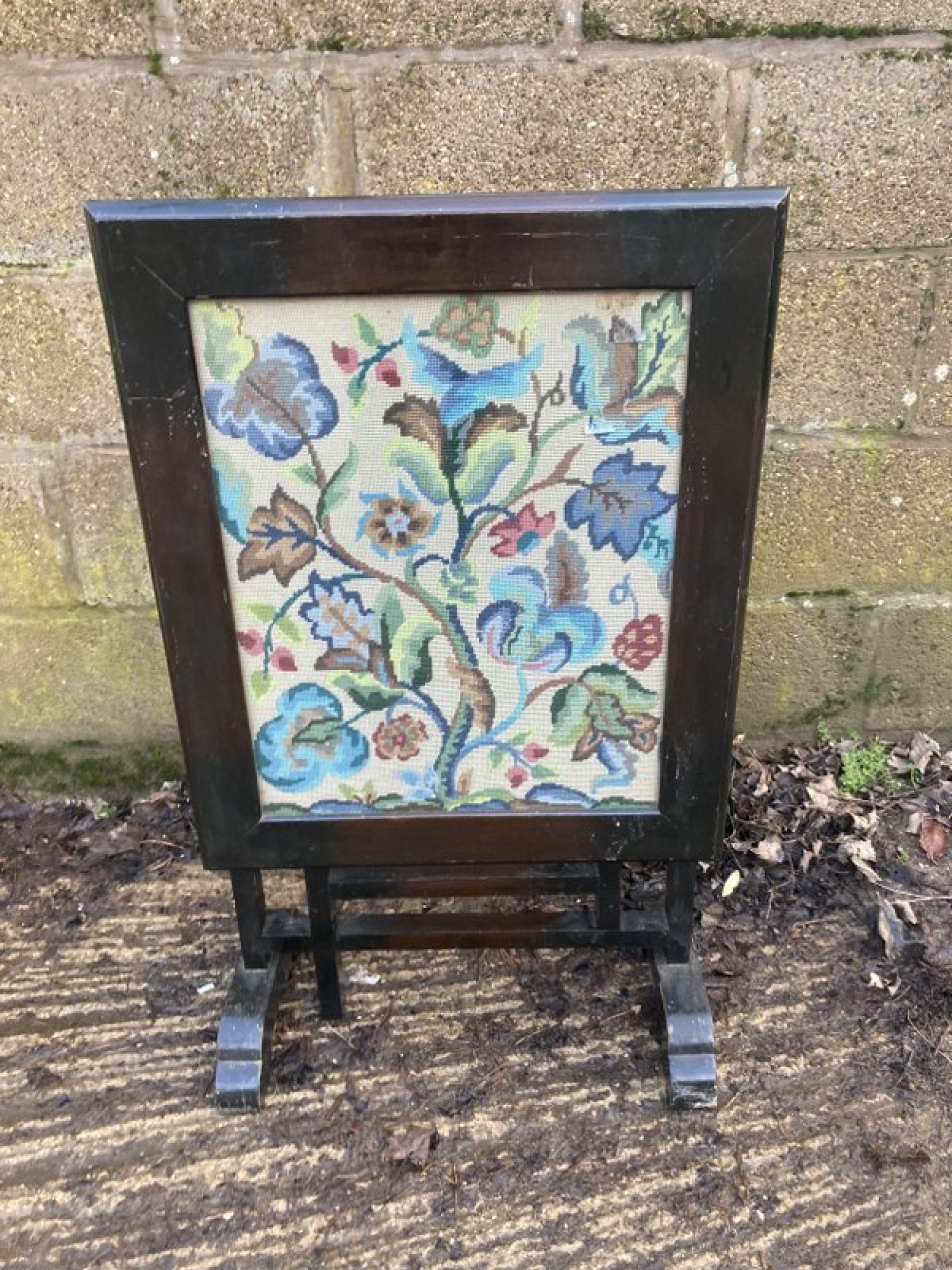 A WOODEN FRAMED SCREEN WITH AN EMBROIDERED PICTURE UNDER THE GLASS, EASY TO REPLACE IF ITS NOT TO YOUR LIKING. THE SCREEN TILTS OVER TO TURN IT INTO A USEFUL TABLE. A PRACTICAL PIECE OF FURNITURE. THIS IS NOT TO BE USED NEAR A LIT FIRE.
