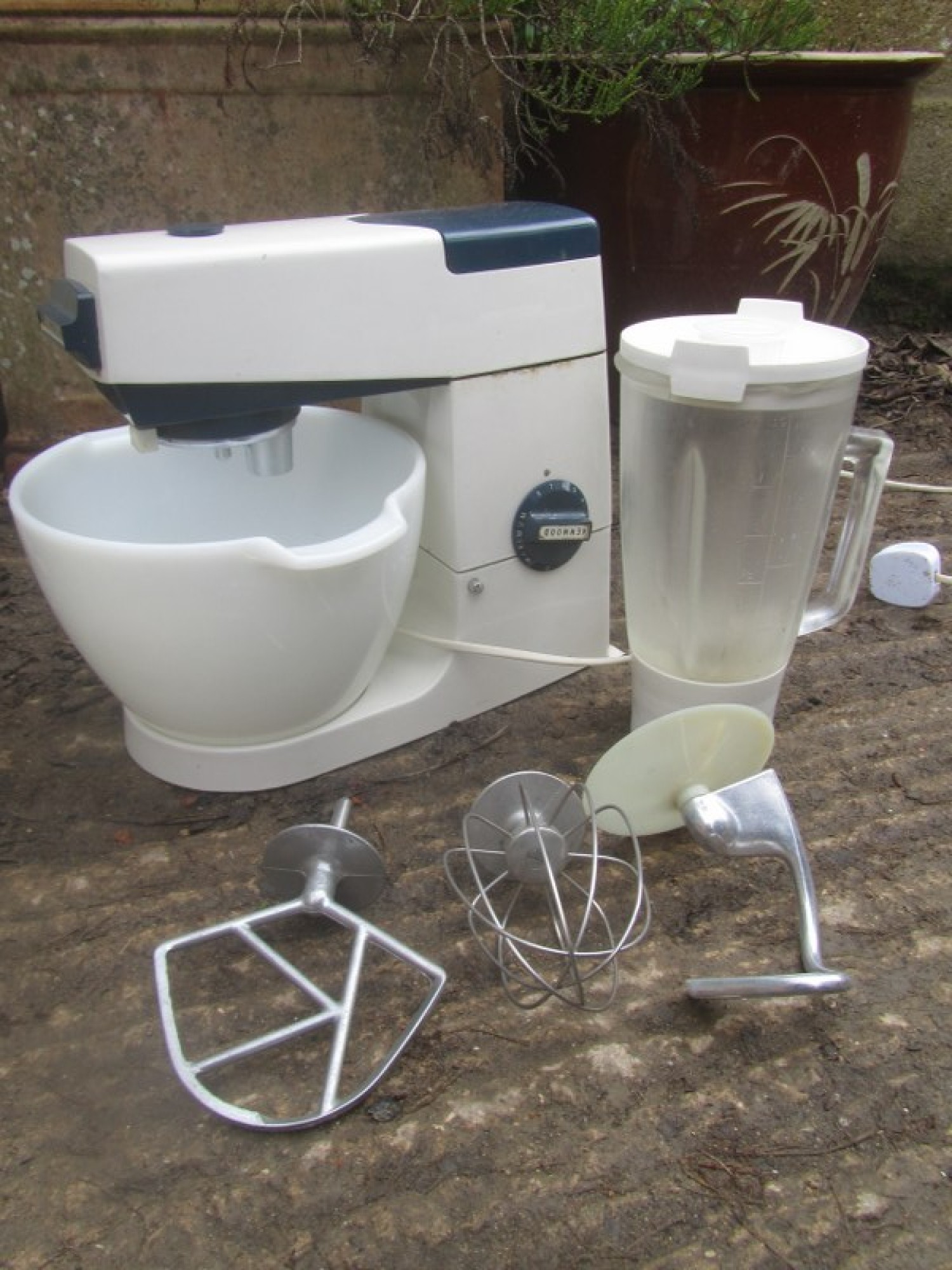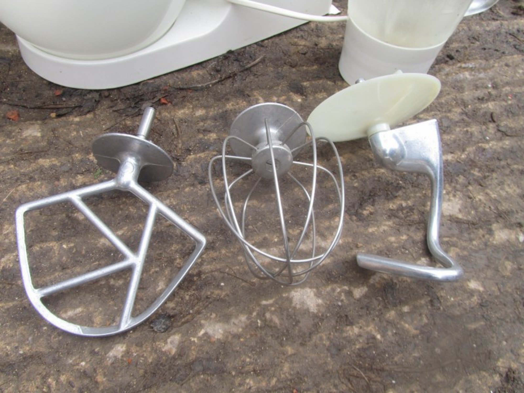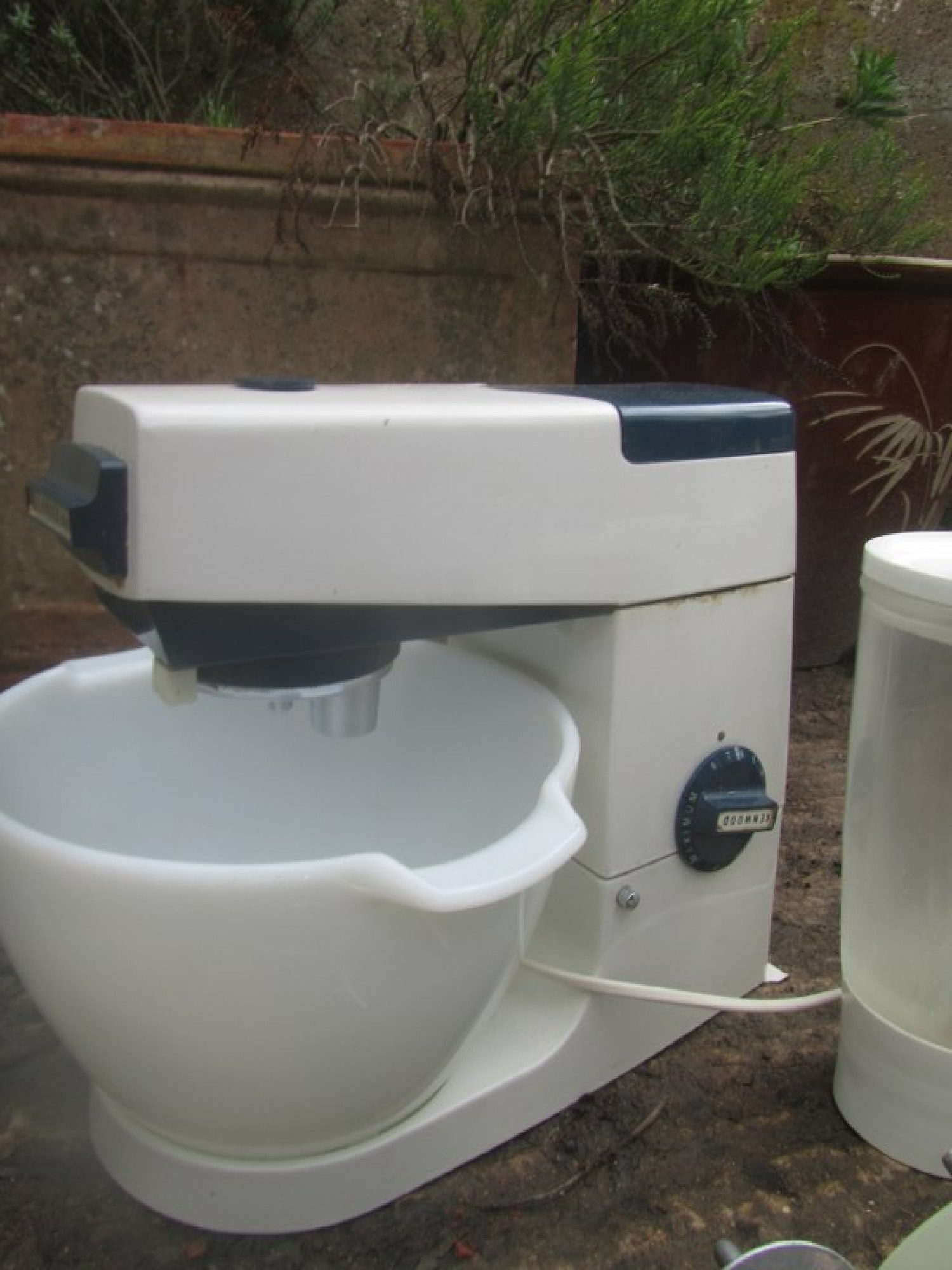 THIS IS A KENWOOD FOOD MIXER. IT IS WORKING. IT COMES WITH ATTACHMENTS AND ORIGINAL BOWL. SOME WEAR AND DAMAGED PAINT AROUND THE BOWL HOLDER.
