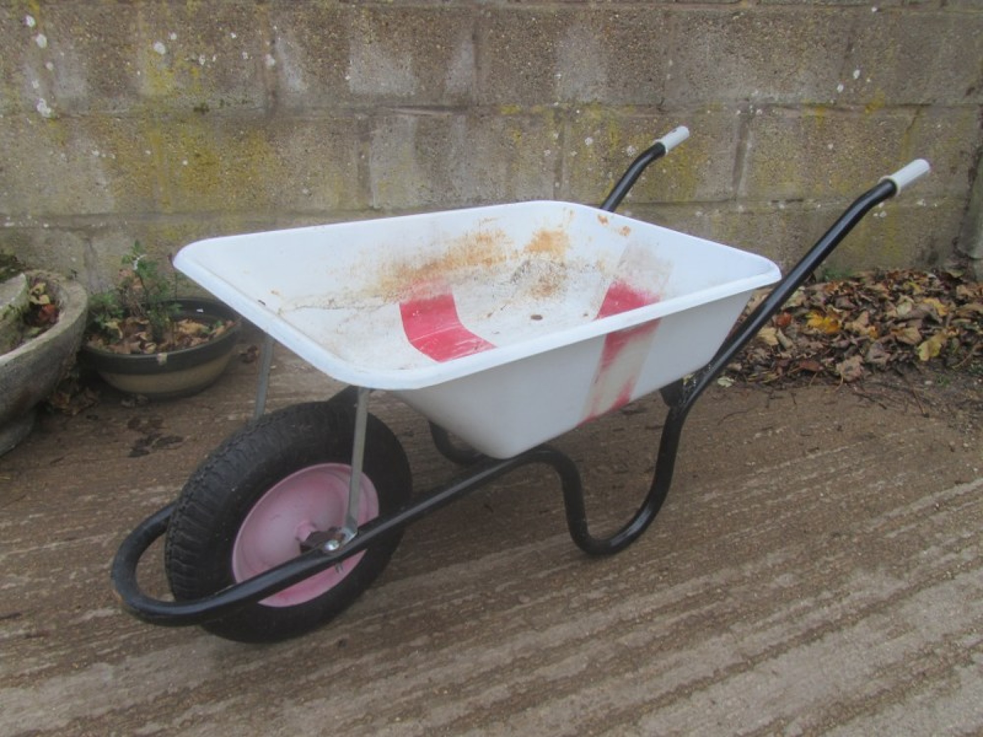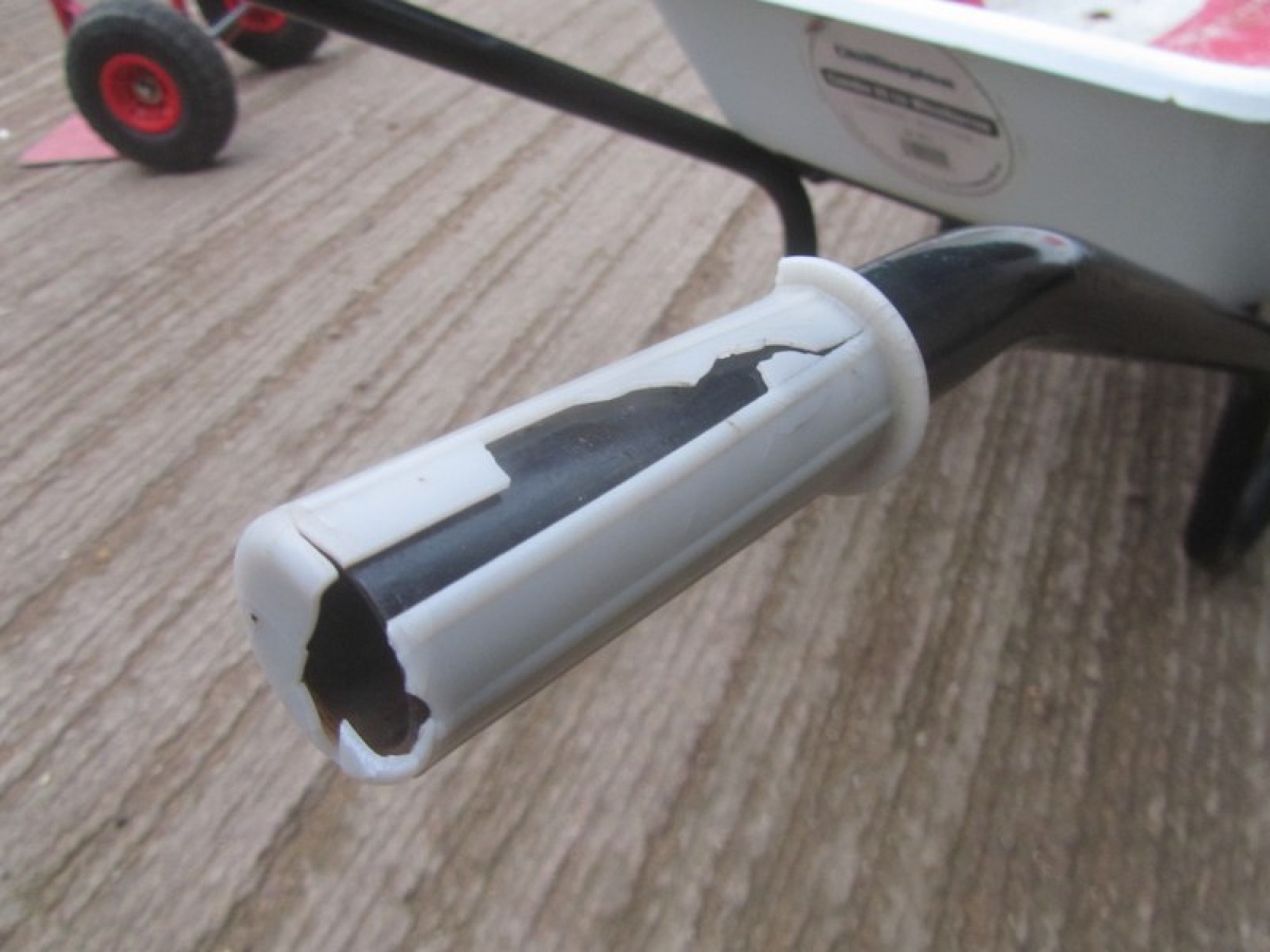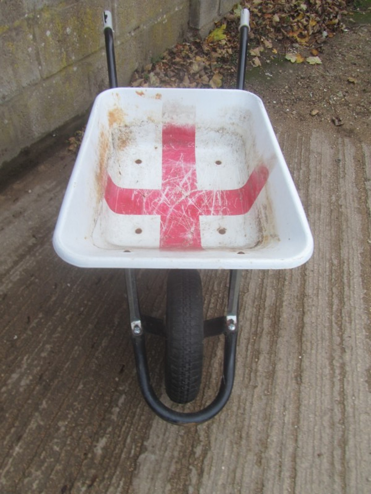 THIS IS A METAL WHEEL BARROW. PNEUMATIC WHEEL. SOME DAMAGE TO THE PLASTIC HANDLES. IT COMES WITH FACTORY FINISH SAINT GEORGES FLAG!!