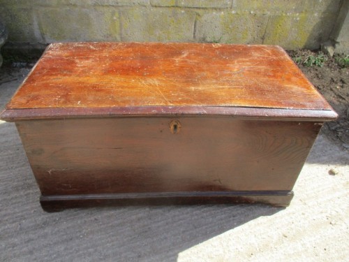 THIS IS AN OAK CHEST. THE TOP IS SOLID OAK. IT HAS BEEN REPAIRED OVER THE YEARS, SOME OLD WOOD WORM HOLES, PROBABLY LONG DEAD. IT LIFTS UP TO GIVE STORAGE SPACE INSIDE. RUSTIC AND WORN.