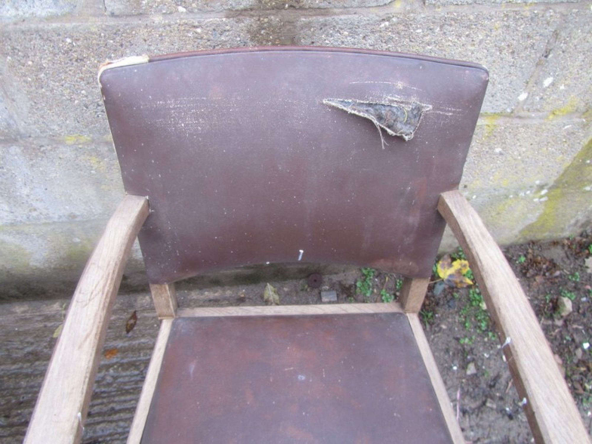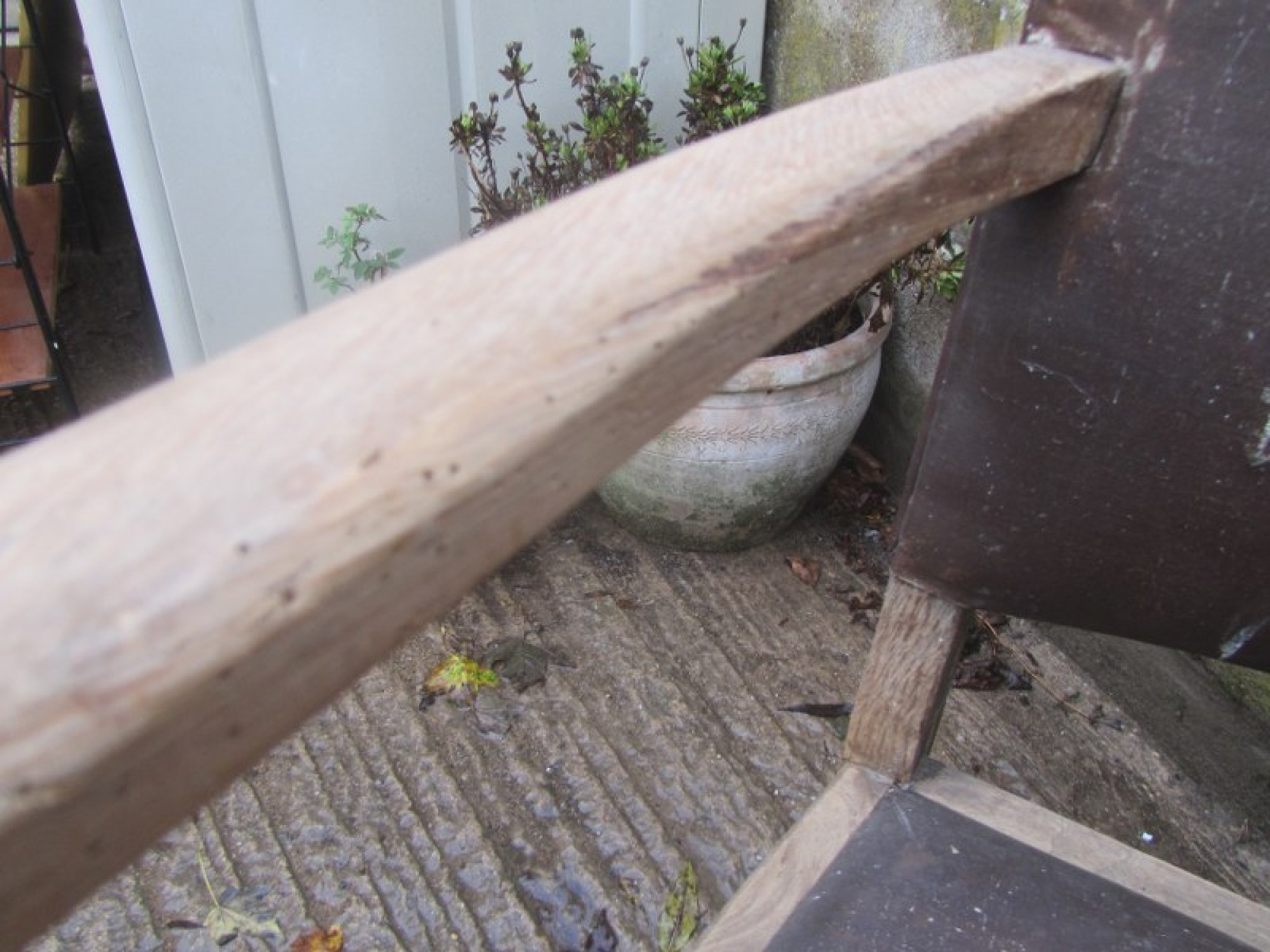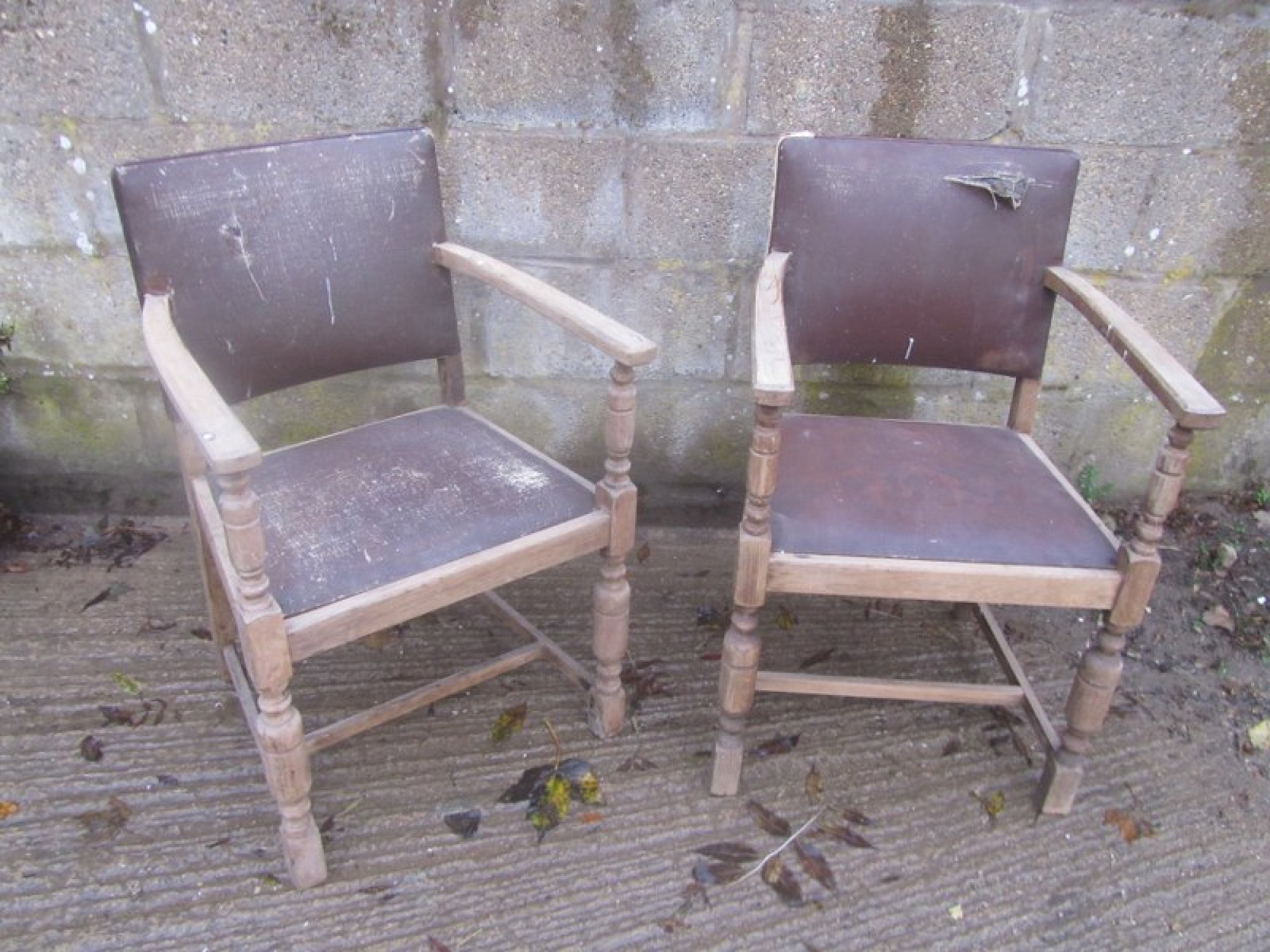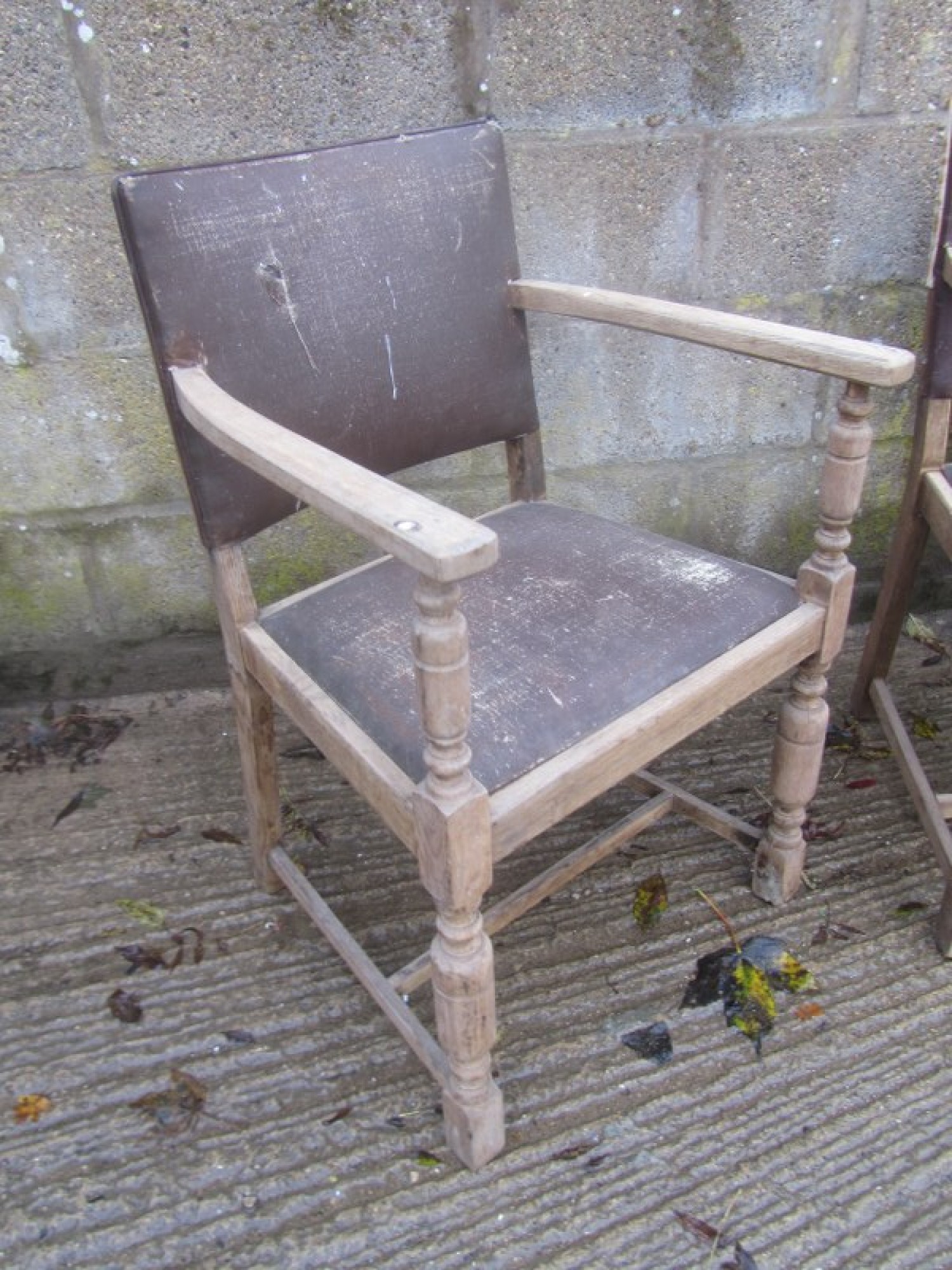 A PAIR OF OAK CARVER CHAIRS FOR ANYWHERE IN THE HOME. IT HAS A WORN COVERED SEAT, EASY TO RE-COVER. THE FRAME IS SOLID OAK, FADED AND WORN. IT HAS SUFFERED WITH WOOD WORM IN THE PAST, IT IS PROBABLY LONG DEAD! BUT I WOULD RECOMMEND TREATING IT TO BE SURE. IDEAL PROJECT.