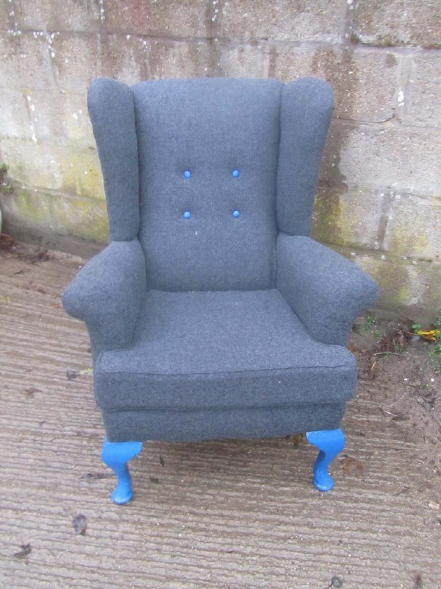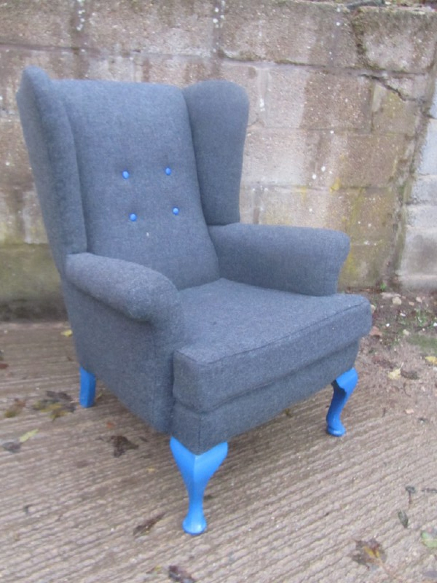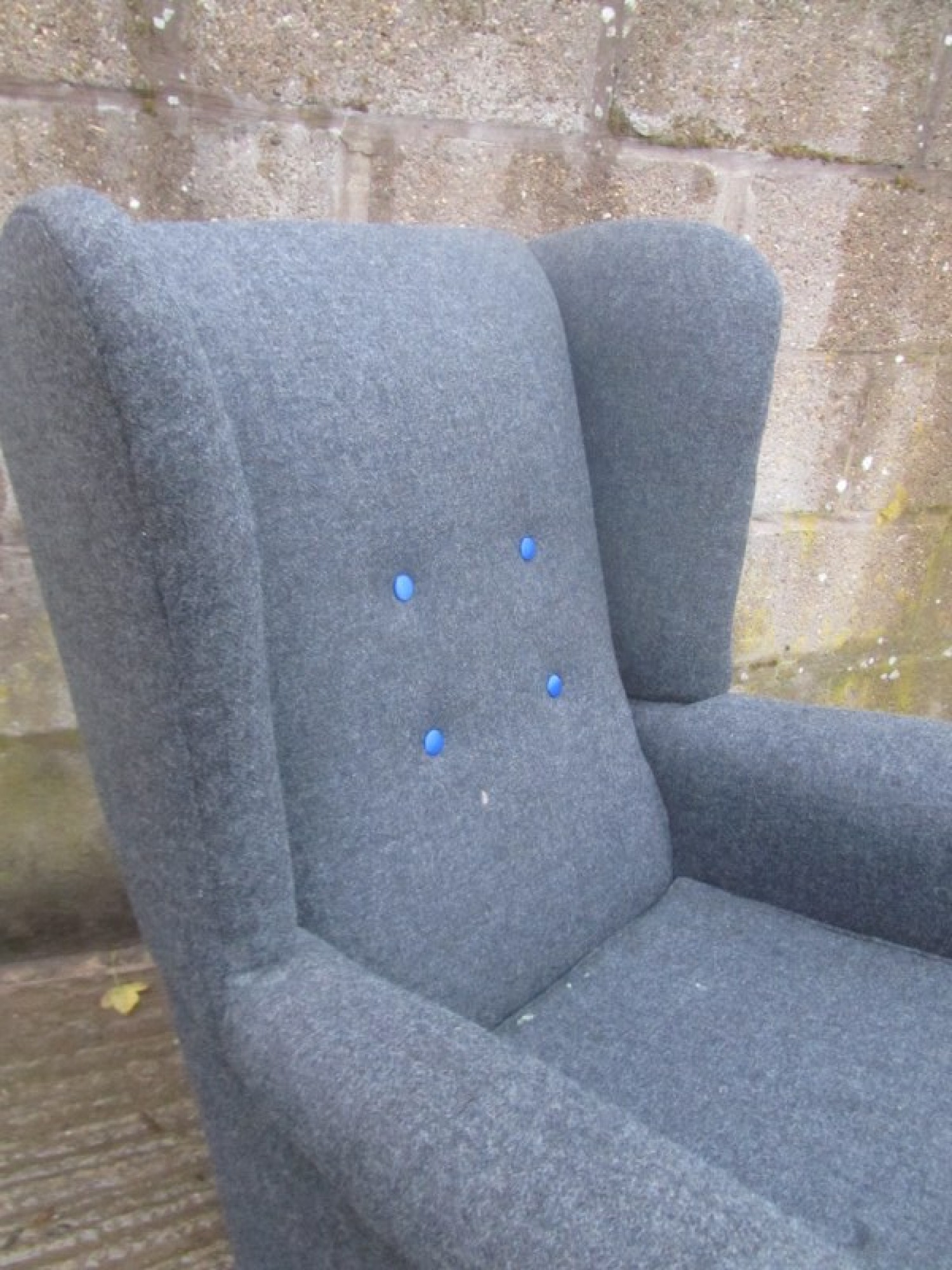 AN UPRIGHT ARMCHAIR WITH WING BACK FOR EXTRA HEAD SUPPORT. THE CHAIR HAS A GREAT SHAPE. THE CHAIR STANDS ON 4 BLUE WOODEN LEGS WITH ORIGINAL SPRINGS UNDERNEATH. THE FRAME IS STRONG AND STURDY. IT HAS BEEN RECOVERED IN GREY MATERIAL A FEW YEARS AGO, THERE IS SOME WEAR TO THE MATERIAL. THERE IS A TEAR ON THE WING BACK AND SOME HOLES IN THE SEAT CUSHION.