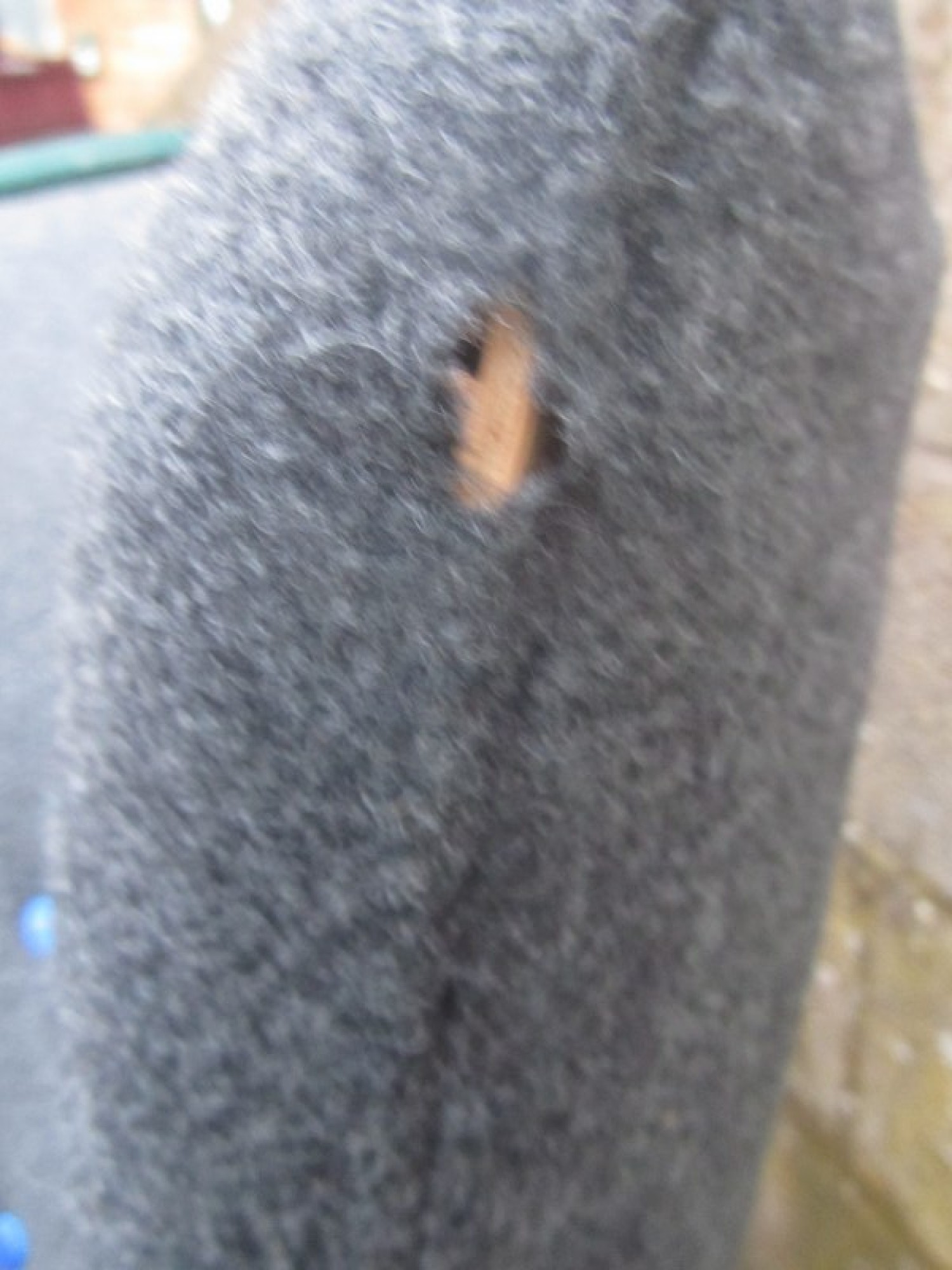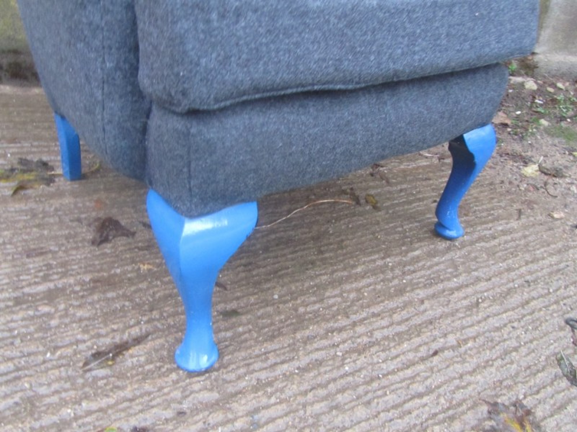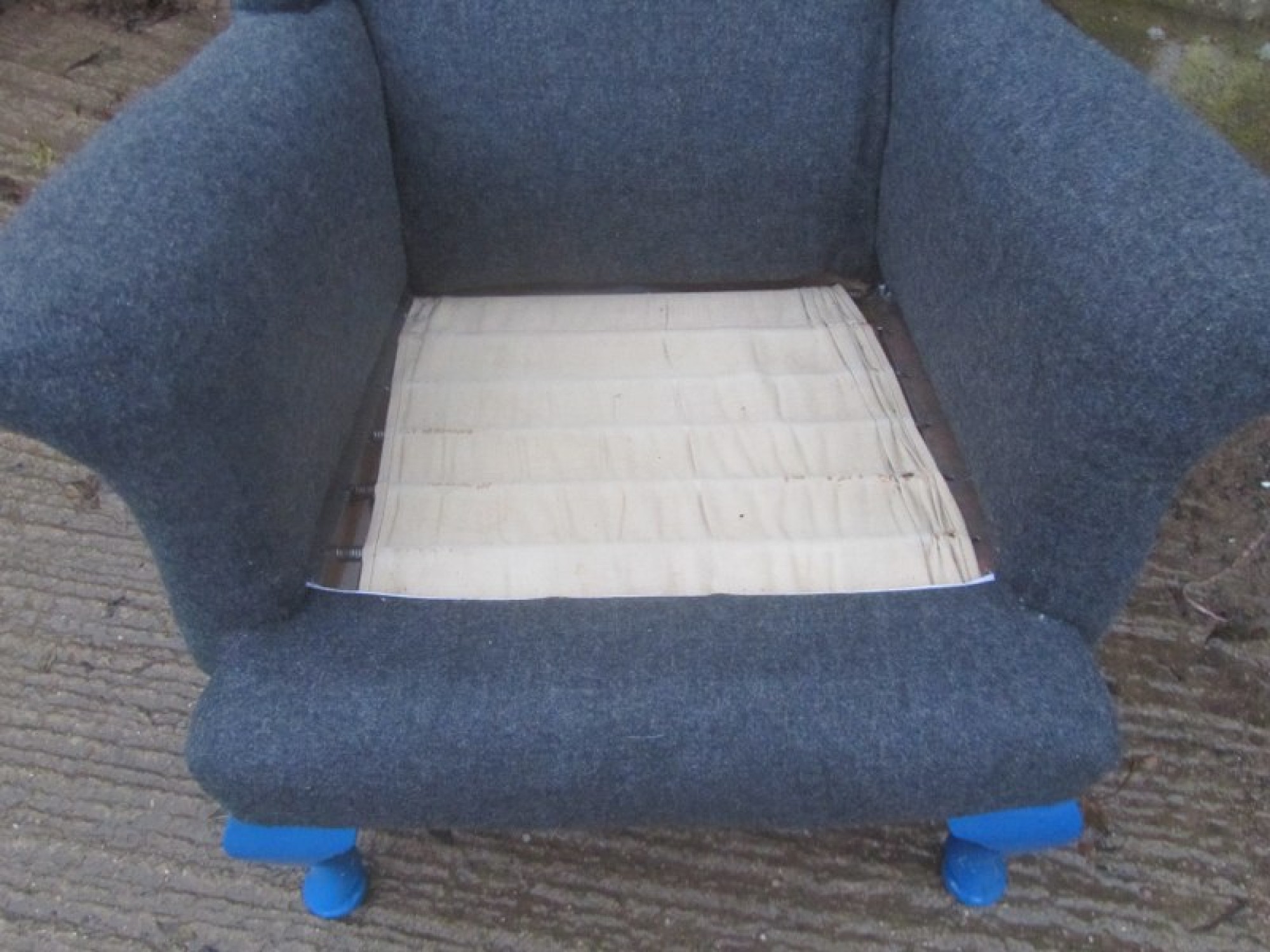 AN UPRIGHT ARMCHAIR WITH WING BACK FOR EXTRA HEAD SUPPORT. THE CHAIR HAS A GREAT SHAPE. THE CHAIR STANDS ON 4 BLUE WOODEN LEGS WITH ORIGINAL SPRINGS UNDERNEATH. THE FRAME IS STRONG AND STURDY. IT HAS BEEN RECOVERED IN GREY MATERIAL A FEW YEARS AGO, THERE IS SOME WEAR TO THE MATERIAL. THERE IS A TEAR ON THE WING BACK AND SOME HOLES IN THE SEAT CUSHION.