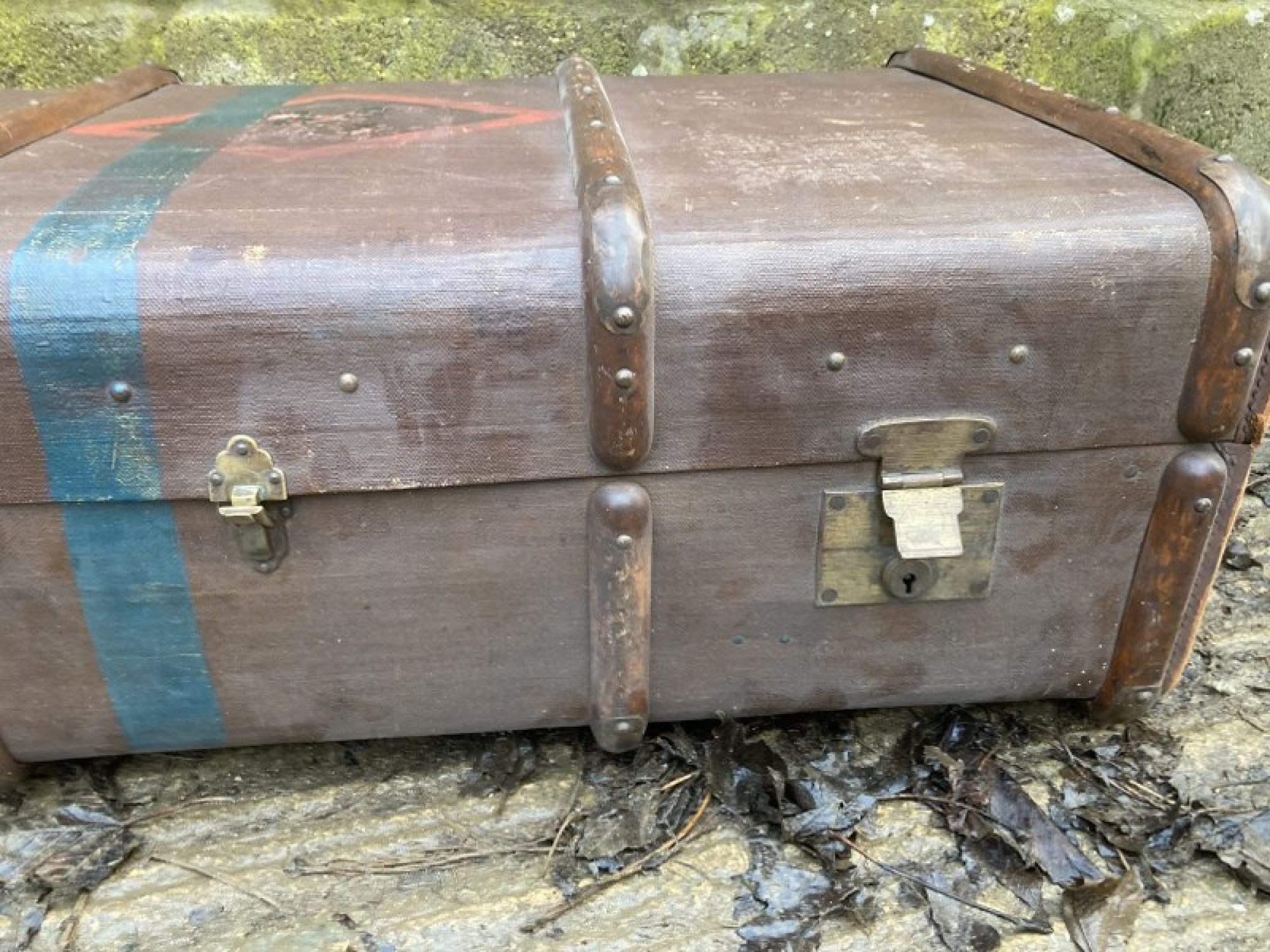 THIS IS A VINTAGE STEAMER TRUNK FROM THE 1920s/30s. THE LOCKS ARE WORN, WITH WOODEN BANDS AROUND THE TRUNK. IT IS NATURALLY WORN, A GREAT VINTAGE LOOK!