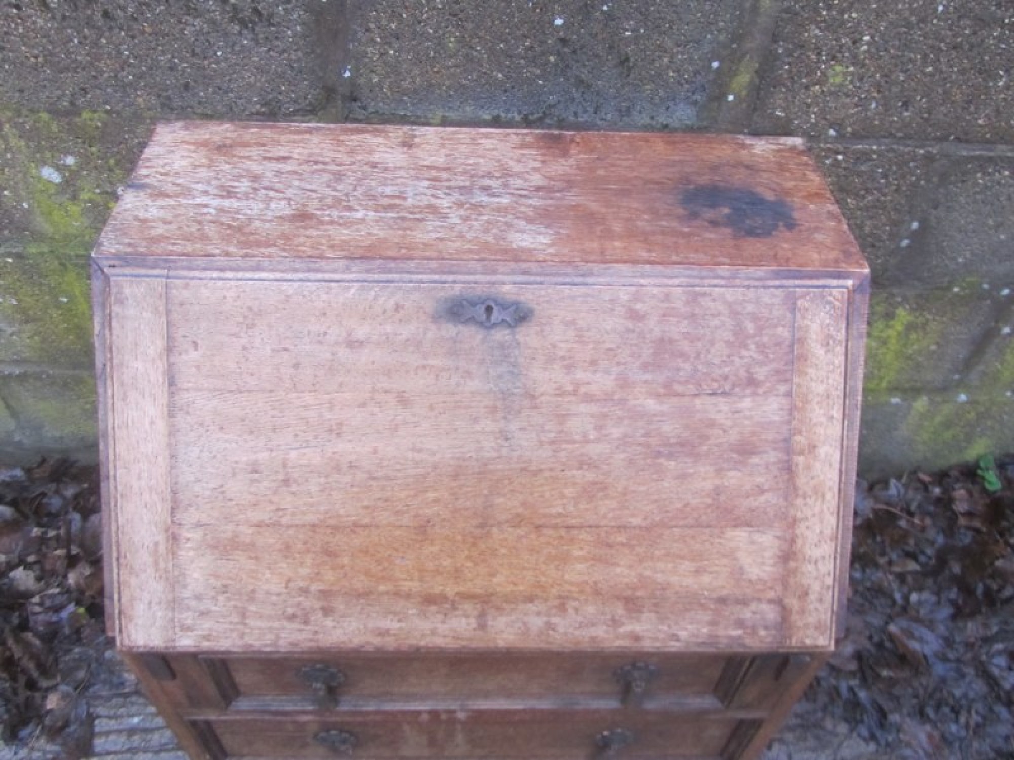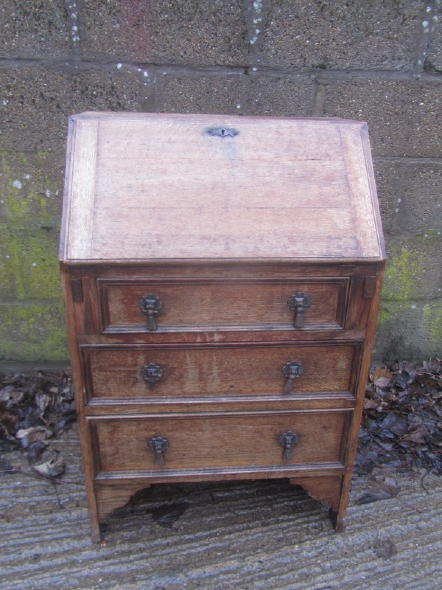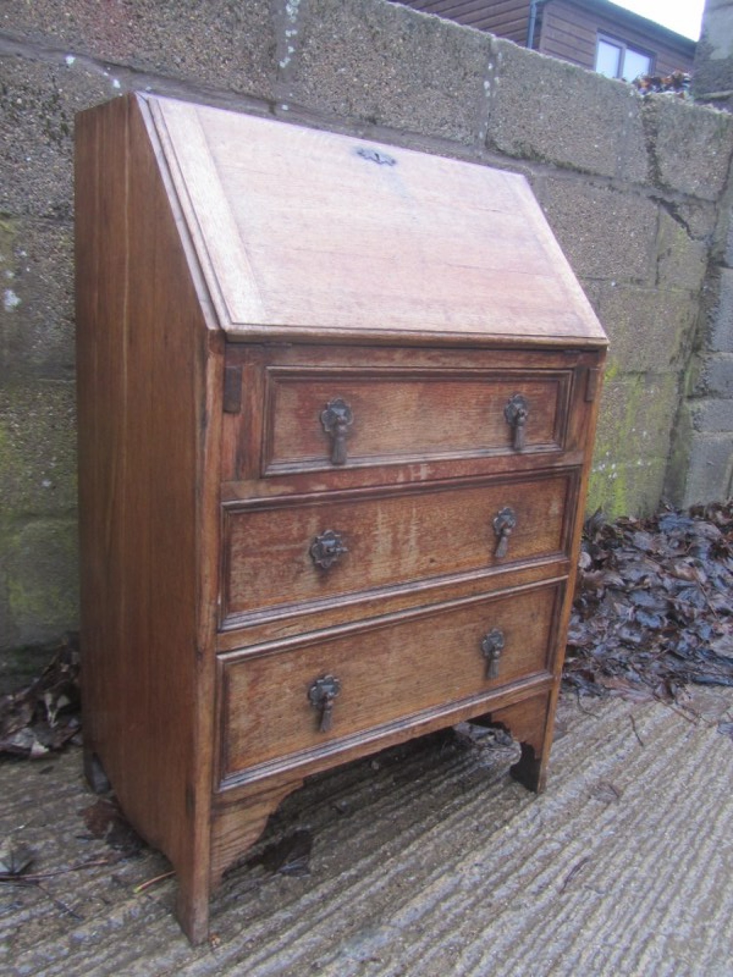 THIS IS A BUREAU FROM THE 1930s/40s. IT IS SOLID OAK, THE TOP SECTION HAS A DROP DOWN FRONT WHICH IS SELF SUPPORTING.