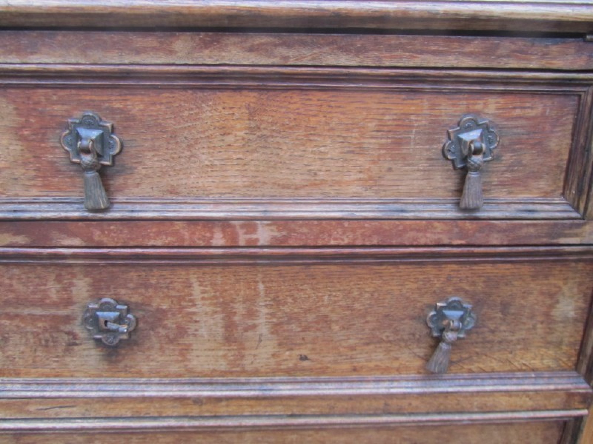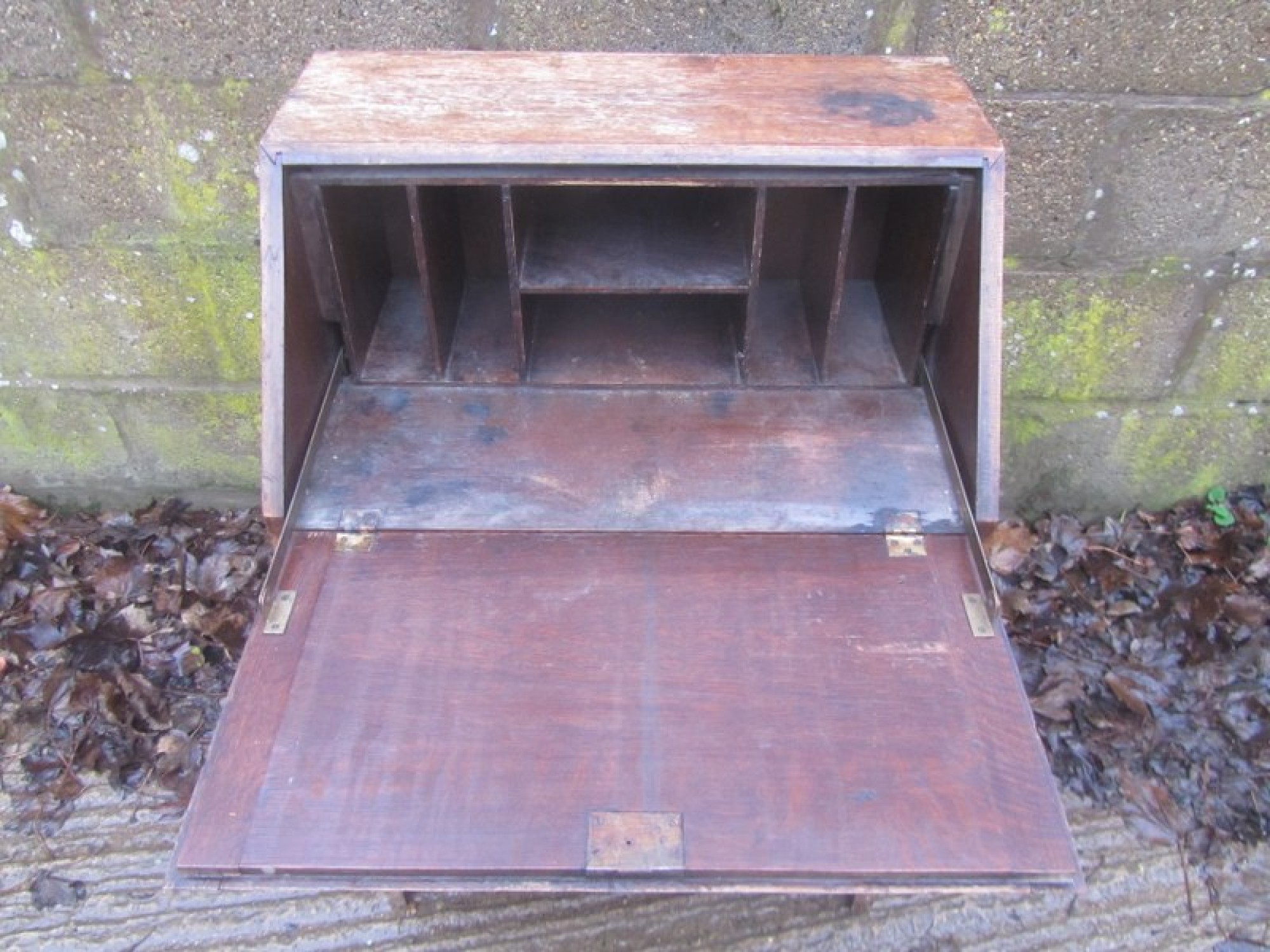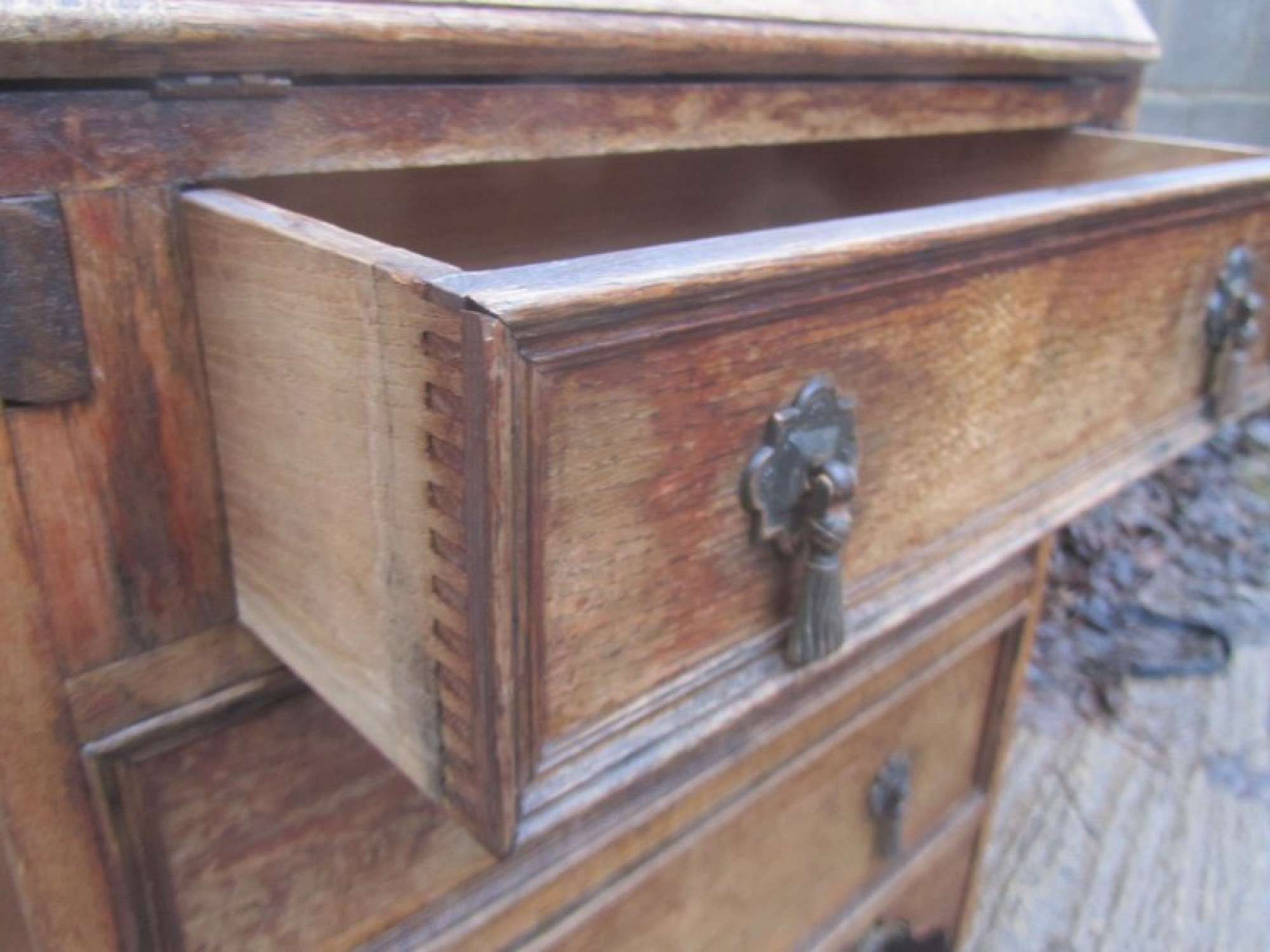 THIS IS A BUREAU FROM THE 1930s/40s. IT IS SOLID OAK, THE TOP SECTION HAS A DROP DOWN FRONT WHICH IS SELF SUPPORTING.