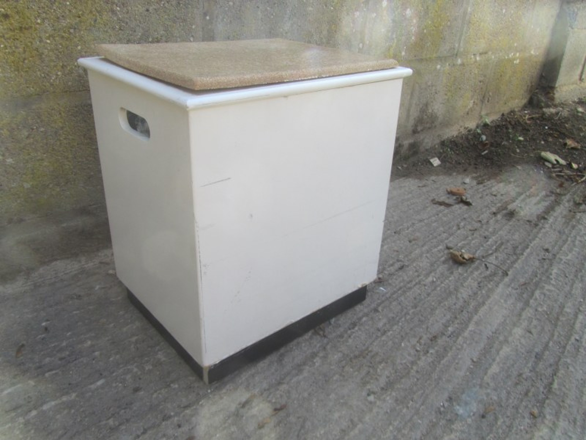 THIS IS A WHITE CHEST WITH A CORK TOP. IT LIFTS UP TO GIVE STORAGE SPACE INSIDE. AVERAGE CONDITION.