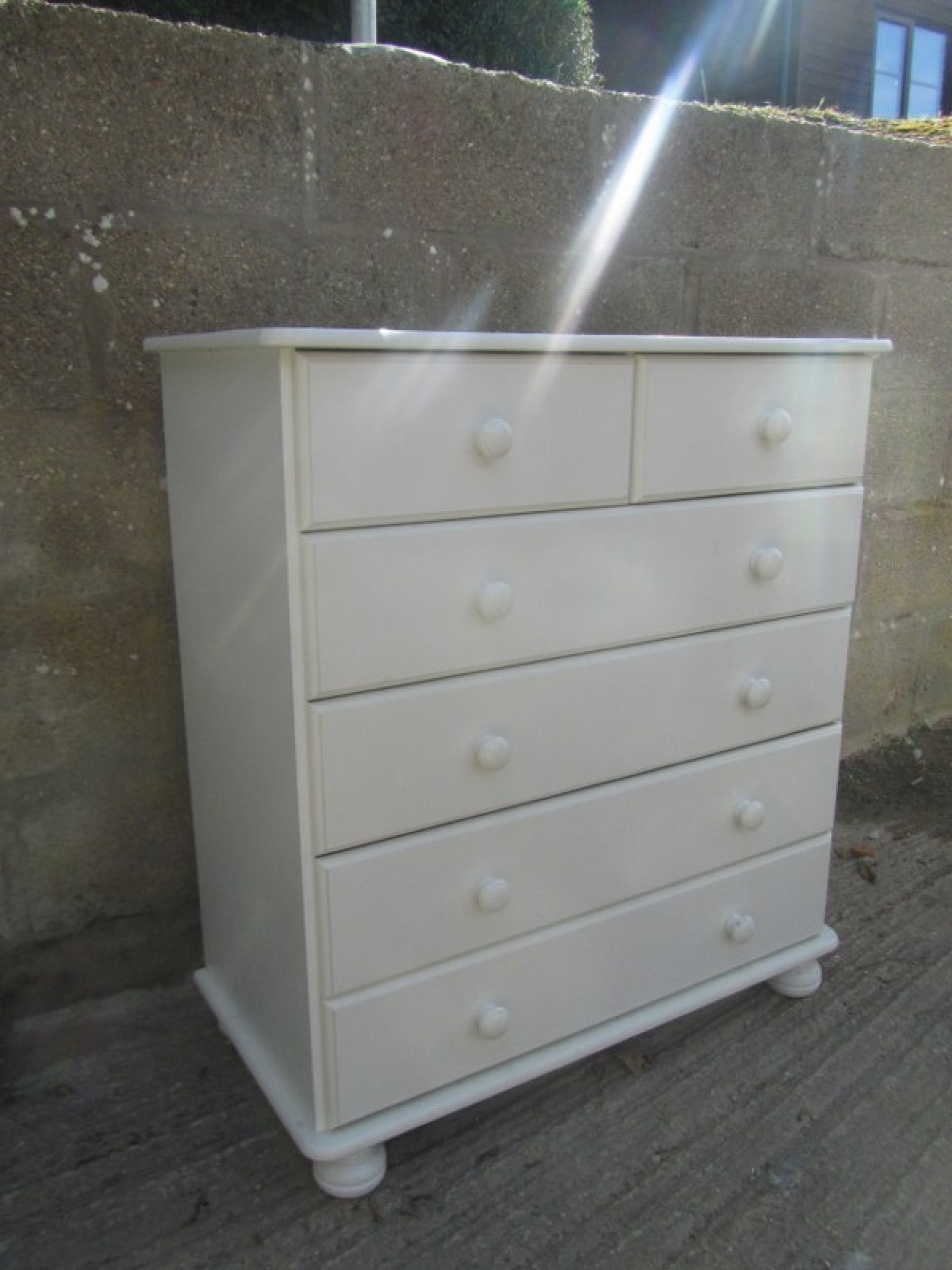 THIS IS A CHEST OF DRAWERS IN A WHITE MELAMINE FINISH. WEAR AND MARKS.